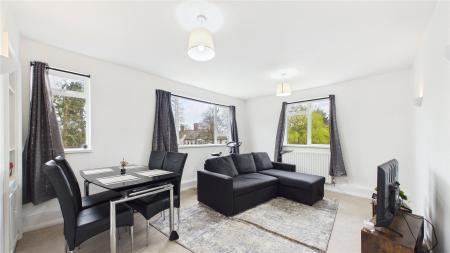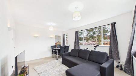 The accommodation includes a bright and spacious living room, benefiting from large windows that allow plenty of natural light and views over the communal gardens.