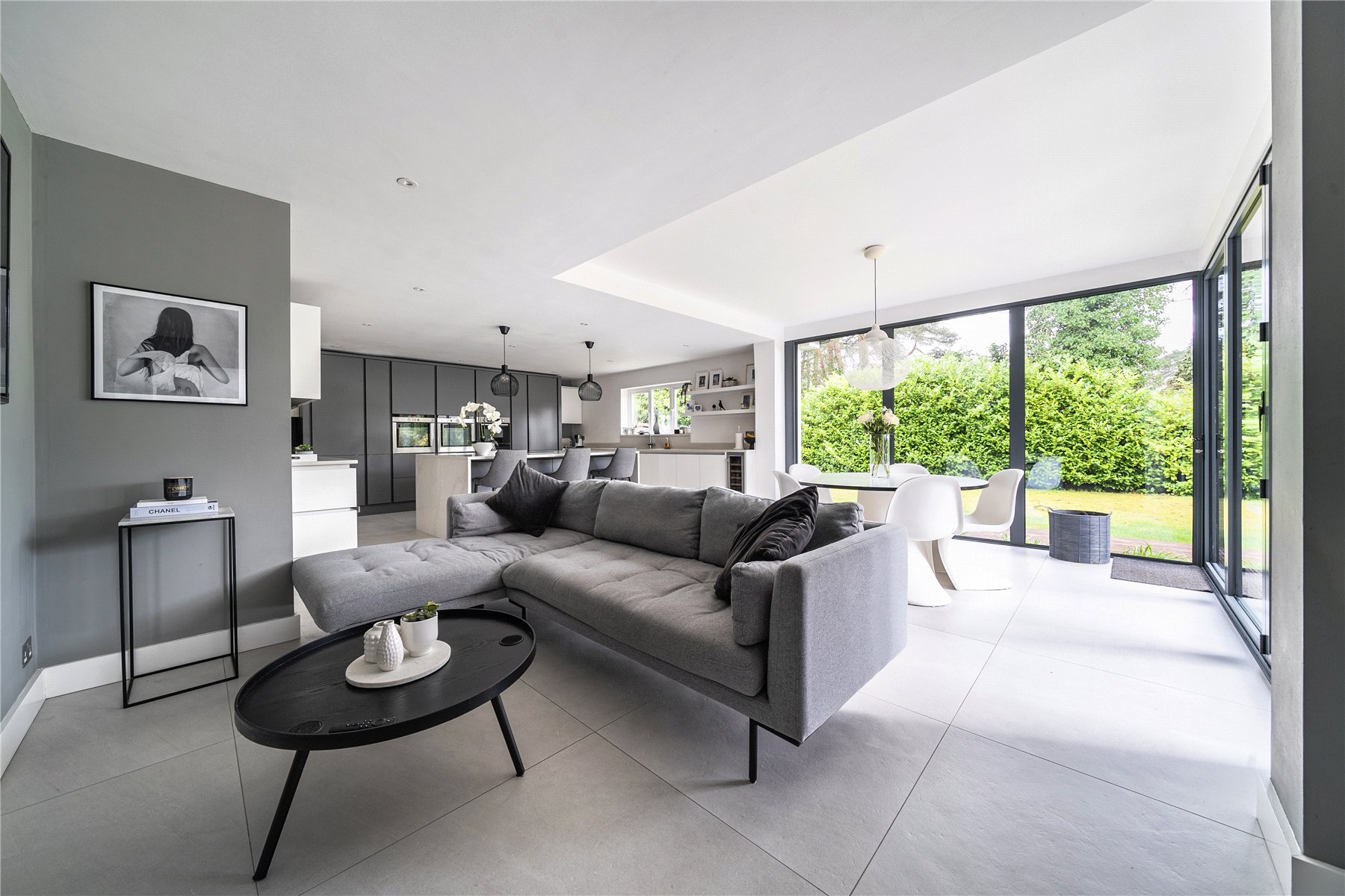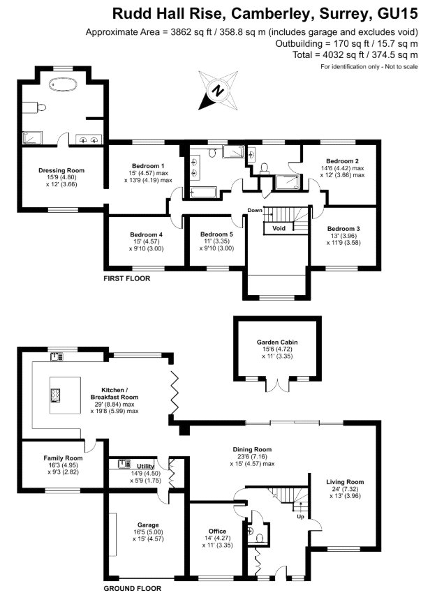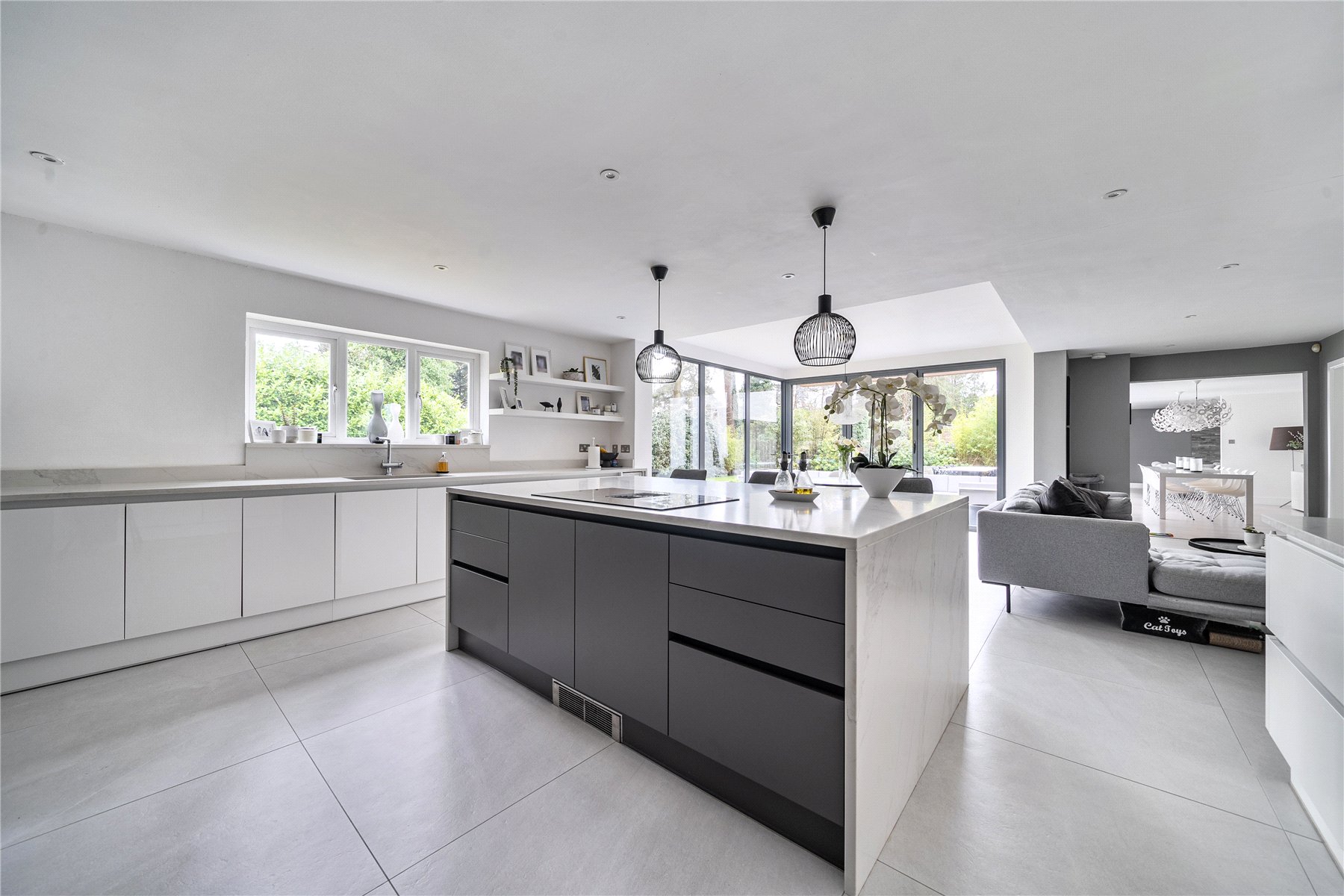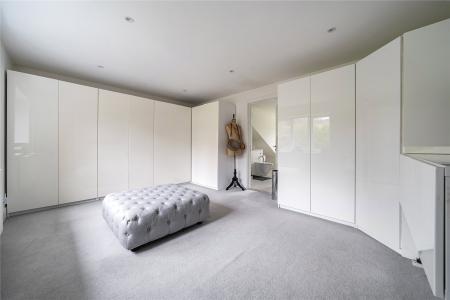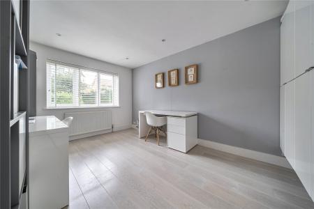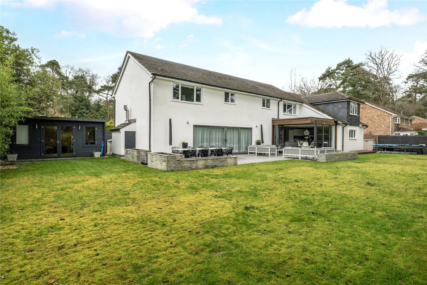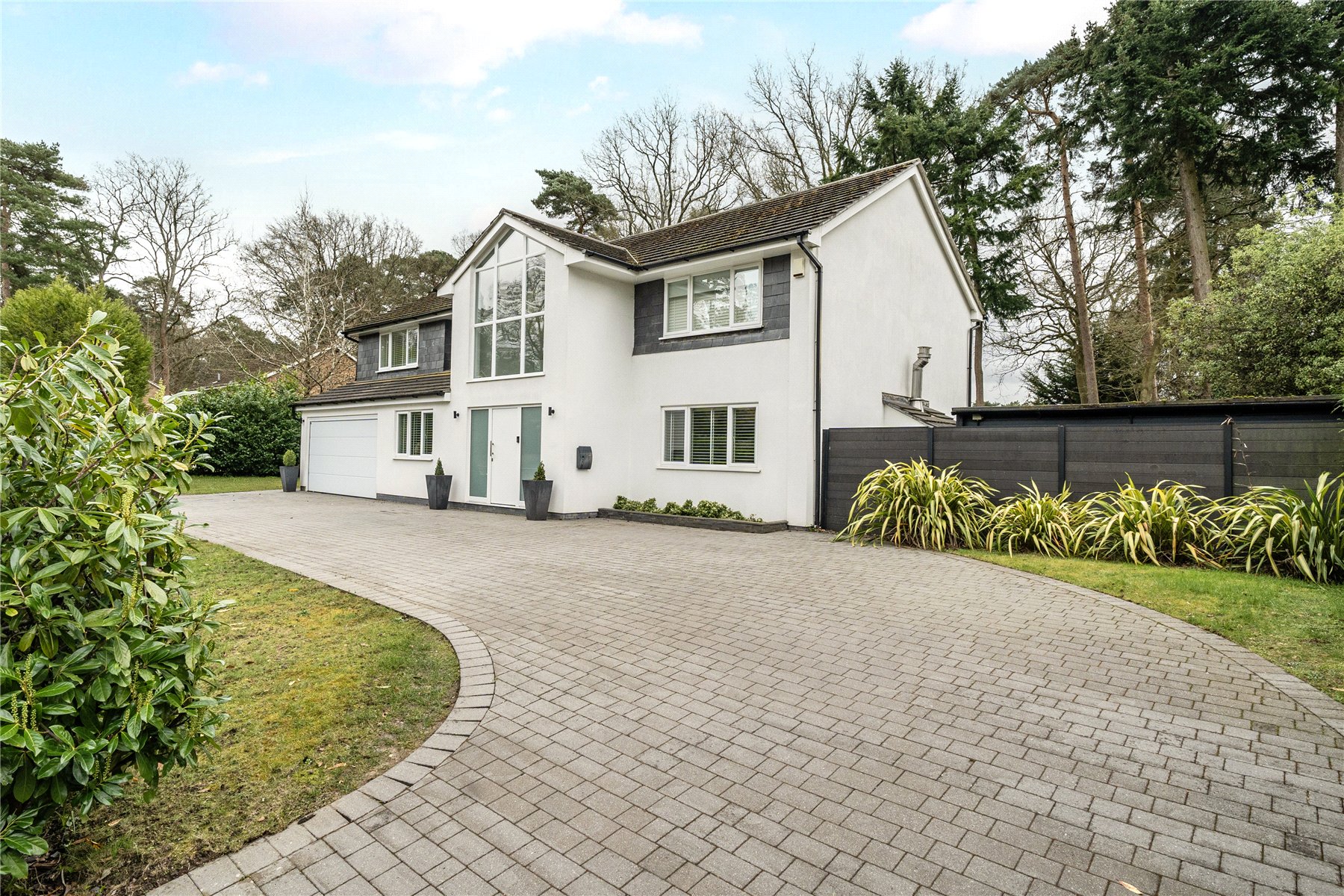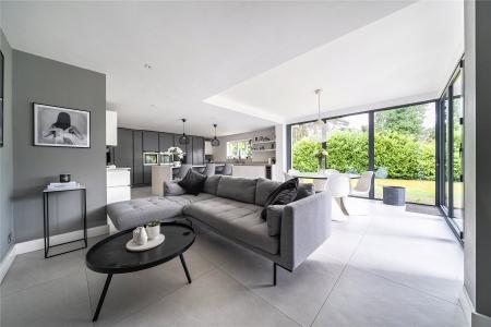 Set discreetly along one of Camberley's most prestigious roads, this exceptional detached residence represents a masterclass in contemporary family livingwhere architectural elegance, scale and refined design converge.Extending to over 4,000 sq ft, the home has been meticulously reimagined to an exacting standard, with an emphasis on light, flow and sophisticated detailing throughout. At its centrepiece lies a truly outstanding open-plan kitchen and lifestyle spacea beautifully appointed environment featuring bespoke cabinetry, high-specification integrated Bosch and Siemens appliances, and an expansive statement island. Designed for both grand entertaining and everyday living, this space opens seamlessly onto the terrace, blurring the boundary between indoors and out. Underfloor water heating enhances comfort within the kitchen and breakfast areas, while engineered oak flooring flows throughout the entirety of the ground floor, adding warmth and cohesion.The ground floor offers an exceptional level of versatility, with a series of impeccably presented reception rooms including a formal dining room, an elegant drawing room, and a relaxed family room. A dedicated home office provides a quiet and refined workspace, while a well-appointed utility room and integrated double garage ensure practicality is effortlessly catered for.The first floor continues to impress, arranged around a striking galleried landing, where a dramatic feature window bathes the interior in natural light. The principal suite is a sanctuary of calm, complete with a beautifully designed dressing room and a luxurious en-suite bathroom. Four further generously proportioned bedrooms are complemented by stylish bath and shower rooms, all finished with a cohesive and contemporary aesthetic.Externally, the property enjoys a beautifully established, south-facing garden, offering a rare degree of privacy and seclusion. Mature trees and manicured hedging frame a generous lawn and an elegant terraceperfect for outdoor entertaining and summer dining. A detached garden cabin provides a highly versatile space, ideal as a gym, studio or secondary office. To the front, a sweeping driveway provides extensive parking and enhances the home's impressive approach.Positioned within easy reach of Camberley's vibrant town centre, the property enjoys immediate access to an array of fine dining, boutique shopping and leisure facilities, including the renowned Atrium complex. The location is particularly favoured for its proximity to a number of highly regarded state and independent schools, as well as excellent transport links. Camberley station offers direct connections to London, while the nearby A30 and M3 provide swift access to Heathrow Airport and the wider motorway network. Surrounded by picturesque woodland, championship golf courses and exclusive private clubs, this is a location that delivers both lifestyle and convenience in equal measure.