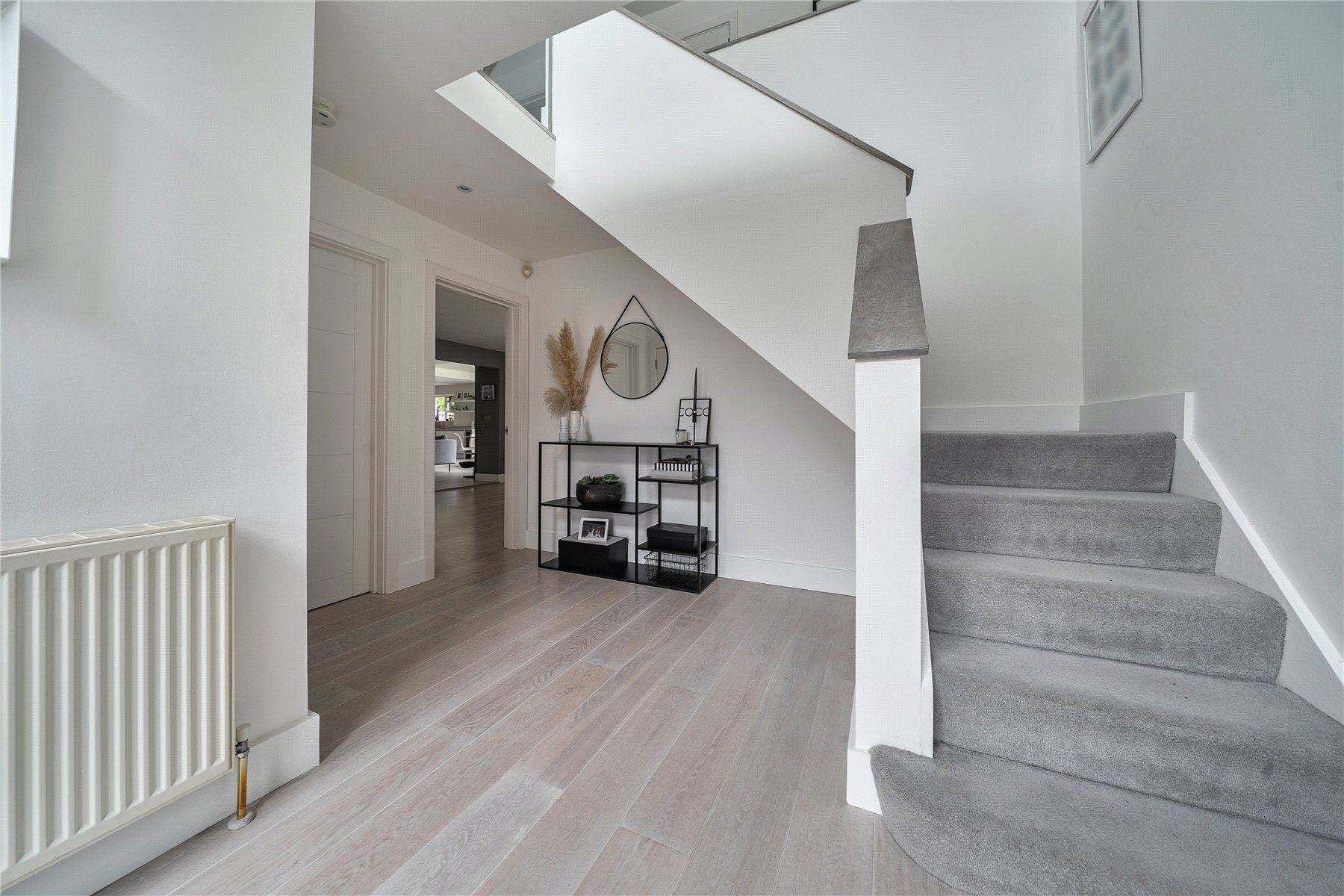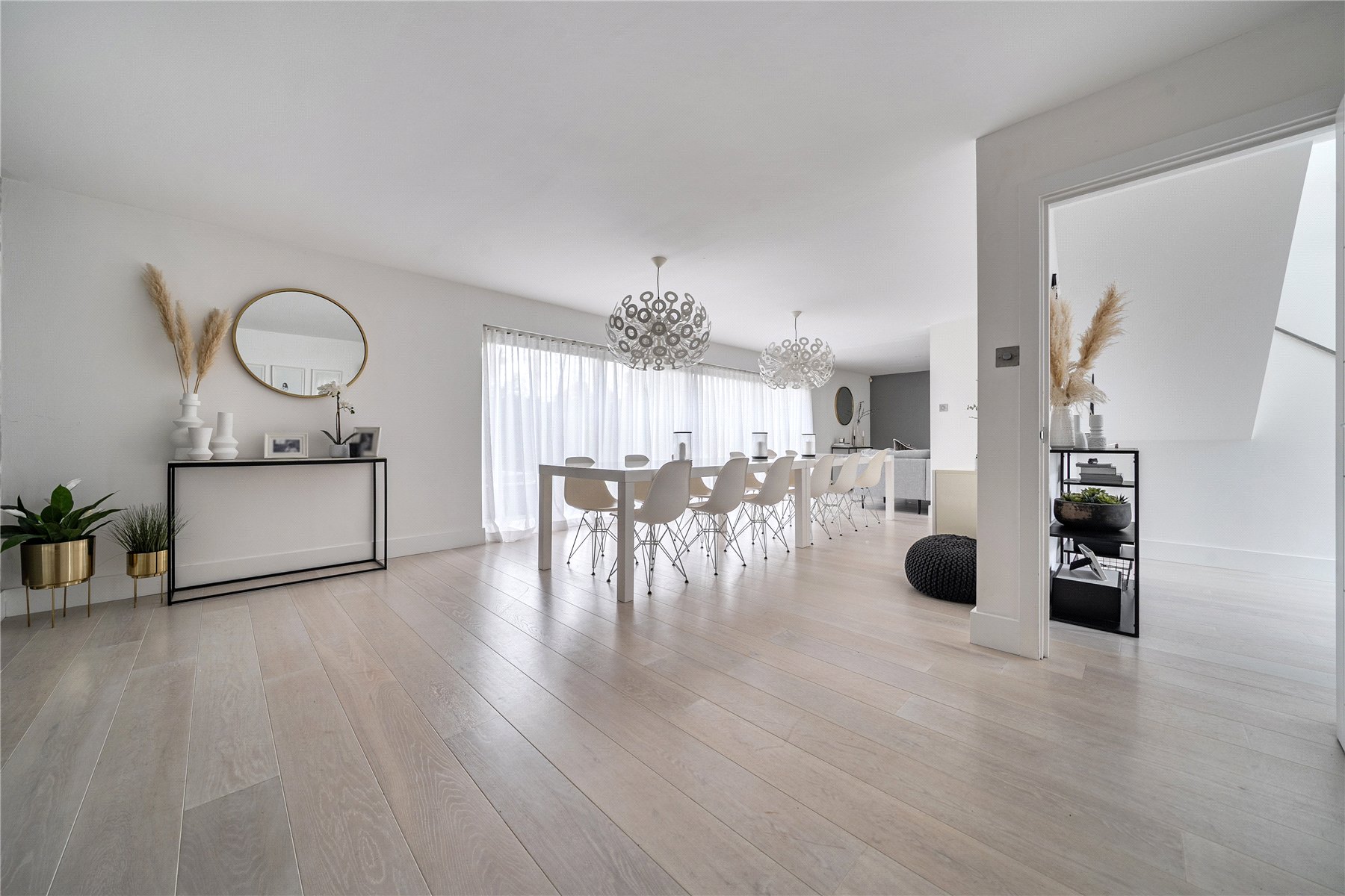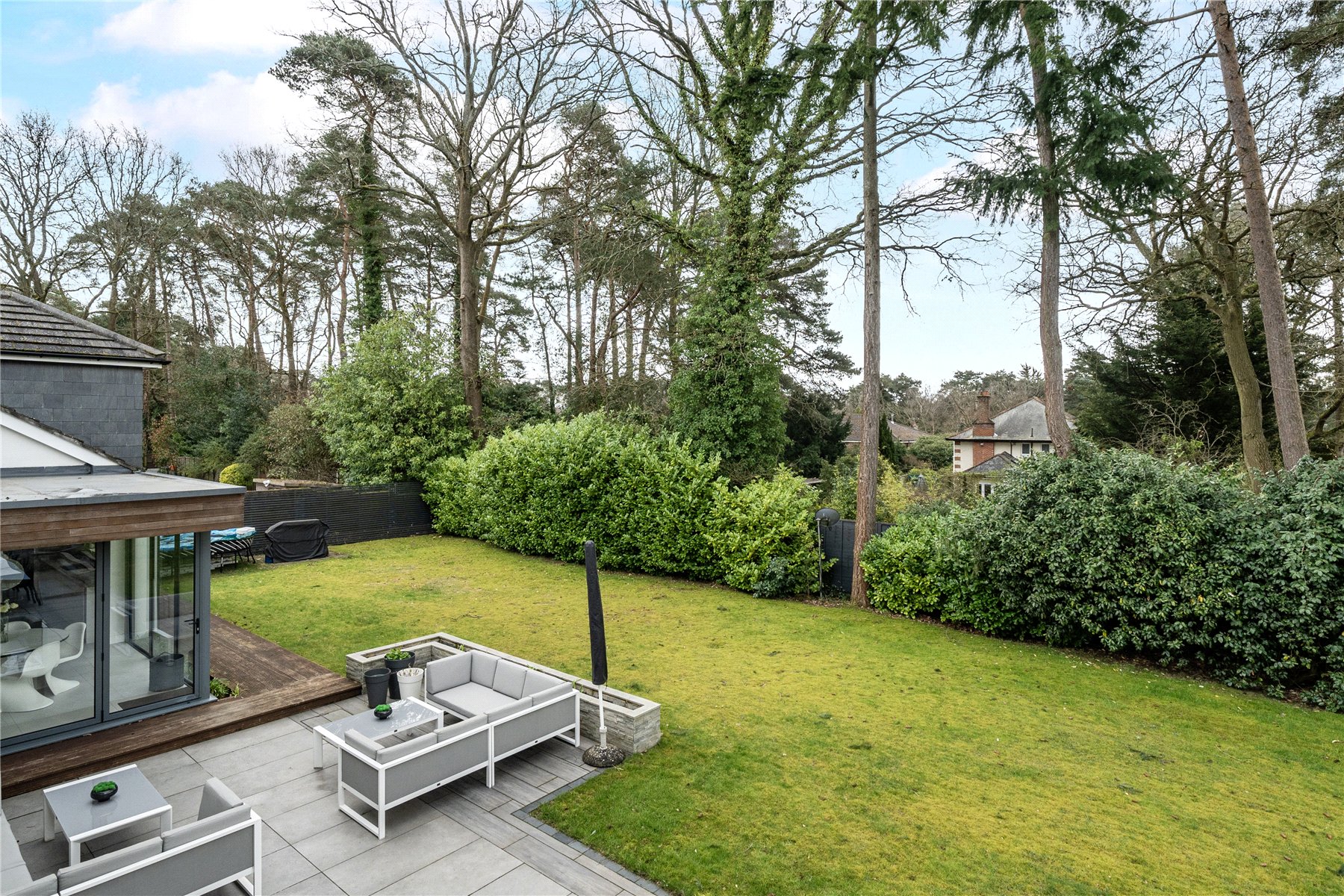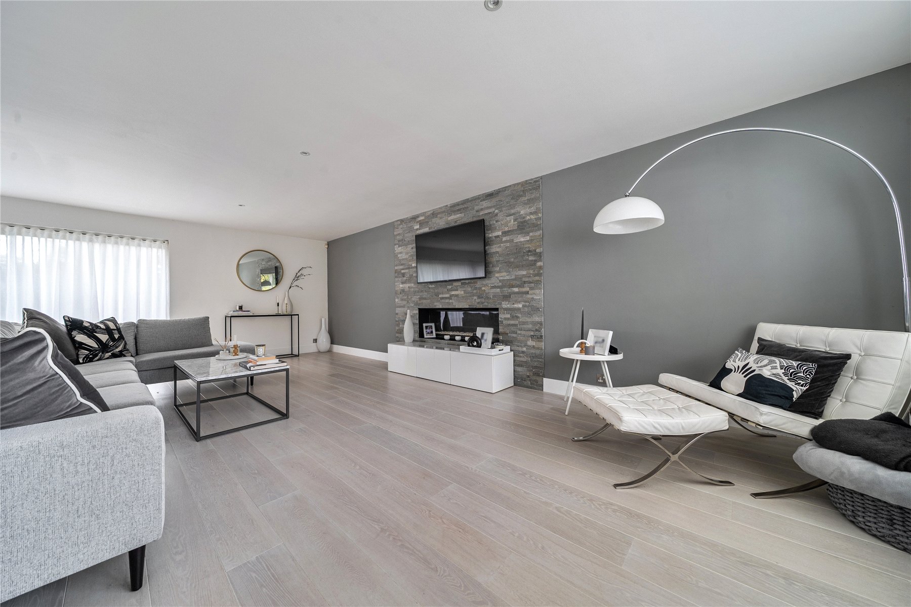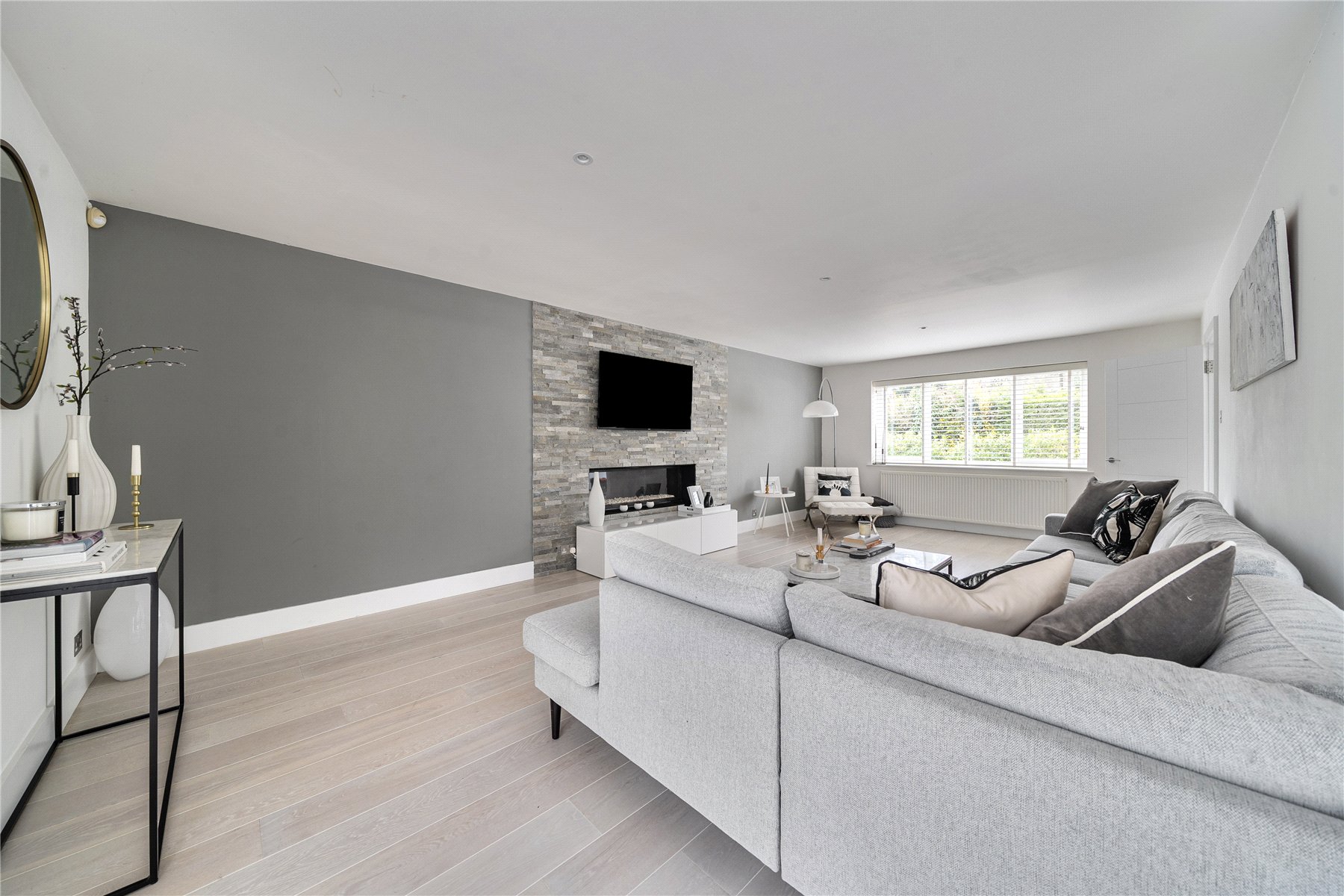 Set discreetly along one of Camberley's most prestigious roads, this exceptional detached residence represents a masterclass in contemporary family livingwhere architectural elegance, scale and refined design converge.Extending to over 4,000 sq ft, the home has been meticulously reimagined to an exacting standard, with an emphasis on light, flow and sophisticated detailing throughout. At its centrepiece lies a truly outstanding open-plan kitchen and lifestyle spacea beautifully appointed environment featuring bespoke cabinetry, high-specification integrated Bosch and Siemens appliances, and an expansive statement island. Designed for both grand entertaining and everyday living, this space opens seamlessly onto the terrace, blurring the boundary between indoors and out. Underfloor water heating enhances comfort within the kitchen and breakfast areas, while engineered oak flooring flows throughout the entirety of the ground floor, adding warmth and cohesion.The ground floor offers an exceptional level of versatility, with a series of impeccably presented reception rooms including a formal dining room, an elegant drawing room, and a relaxed family room. A dedicated home office provides a quiet and refined workspace, while a well-appointed utility room and integrated double garage ensure practicality is effortlessly catered for.The first floor continues to impress, arranged around a striking galleried landing, where a dramatic feature window bathes the interior in natural light. The principal suite is a sanctuary of calm, complete with a beautifully designed dressing room and a luxurious en-suite bathroom. Four further generously proportioned bedrooms are complemented by stylish bath and shower rooms, all finished with a cohesive and contemporary aesthetic.Externally, the property enjoys a beautifully established, south-facing garden, offering a rare degree of privacy and seclusion. Mature trees and manicured hedging frame a generous lawn and an elegant terraceperfect for outdoor entertaining and summer dining. A detached garden cabin provides a highly versatile space, ideal as a gym, studio or secondary office. To the front, a sweeping driveway provides extensive parking and enhances the home's impressive approach.Positioned within easy reach of Camberley's vibrant town centre, the property enjoys immediate access to an array of fine dining, boutique shopping and leisure facilities, including the renowned Atrium complex. The location is particularly favoured for its proximity to a number of highly regarded state and independent schools, as well as excellent transport links. Camberley station offers direct connections to London, while the nearby A30 and M3 provide swift access to Heathrow Airport and the wider motorway network. Surrounded by picturesque woodland, championship golf courses and exclusive private clubs, this is a location that delivers both lifestyle and convenience in equal measure.