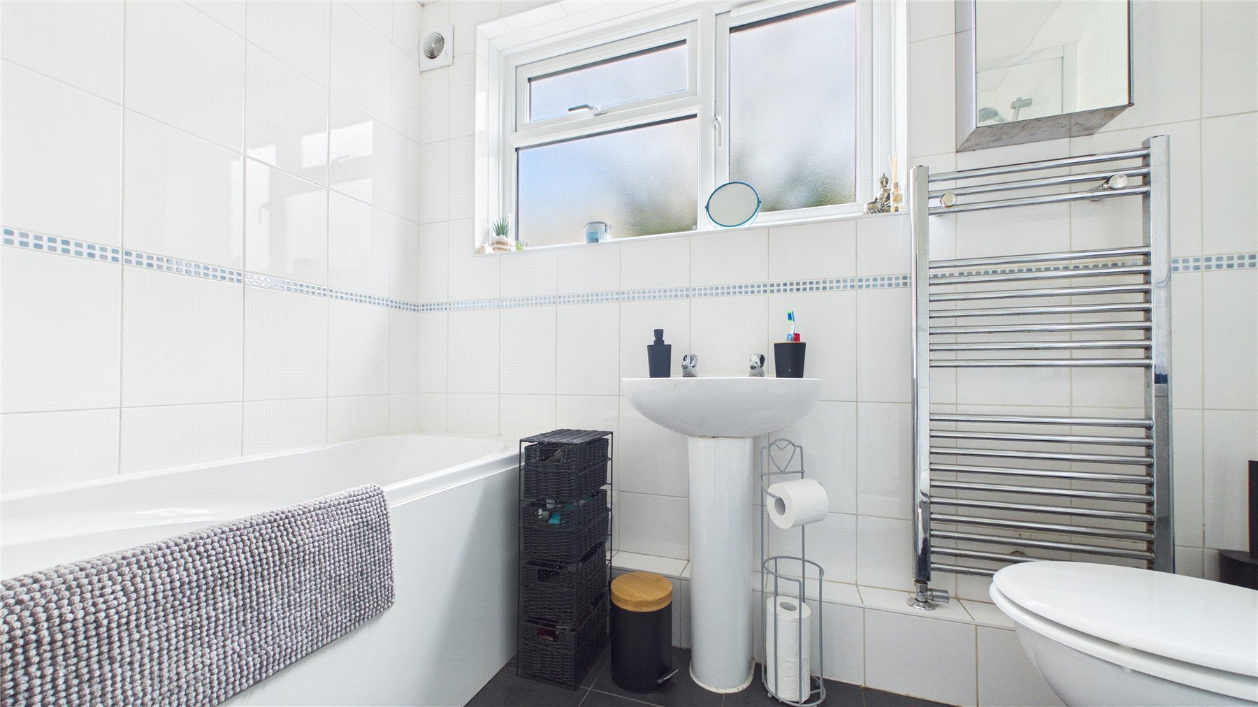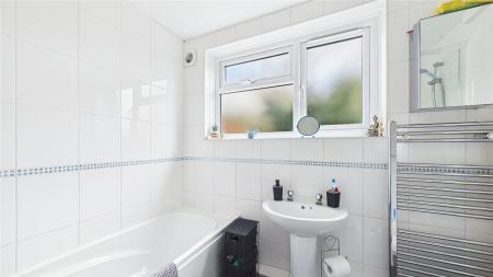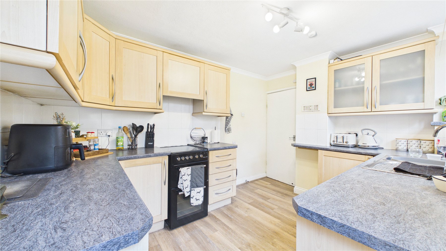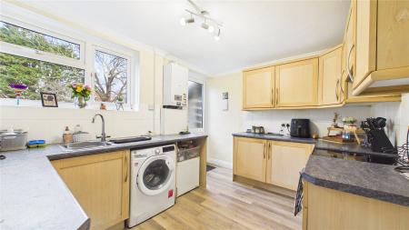 Positioned to the rear, the kitchen offers ample worktop and cupboard space, with a practical layout and direct access to the private rear garden, perfect for everyday convenience and outdoor dining.