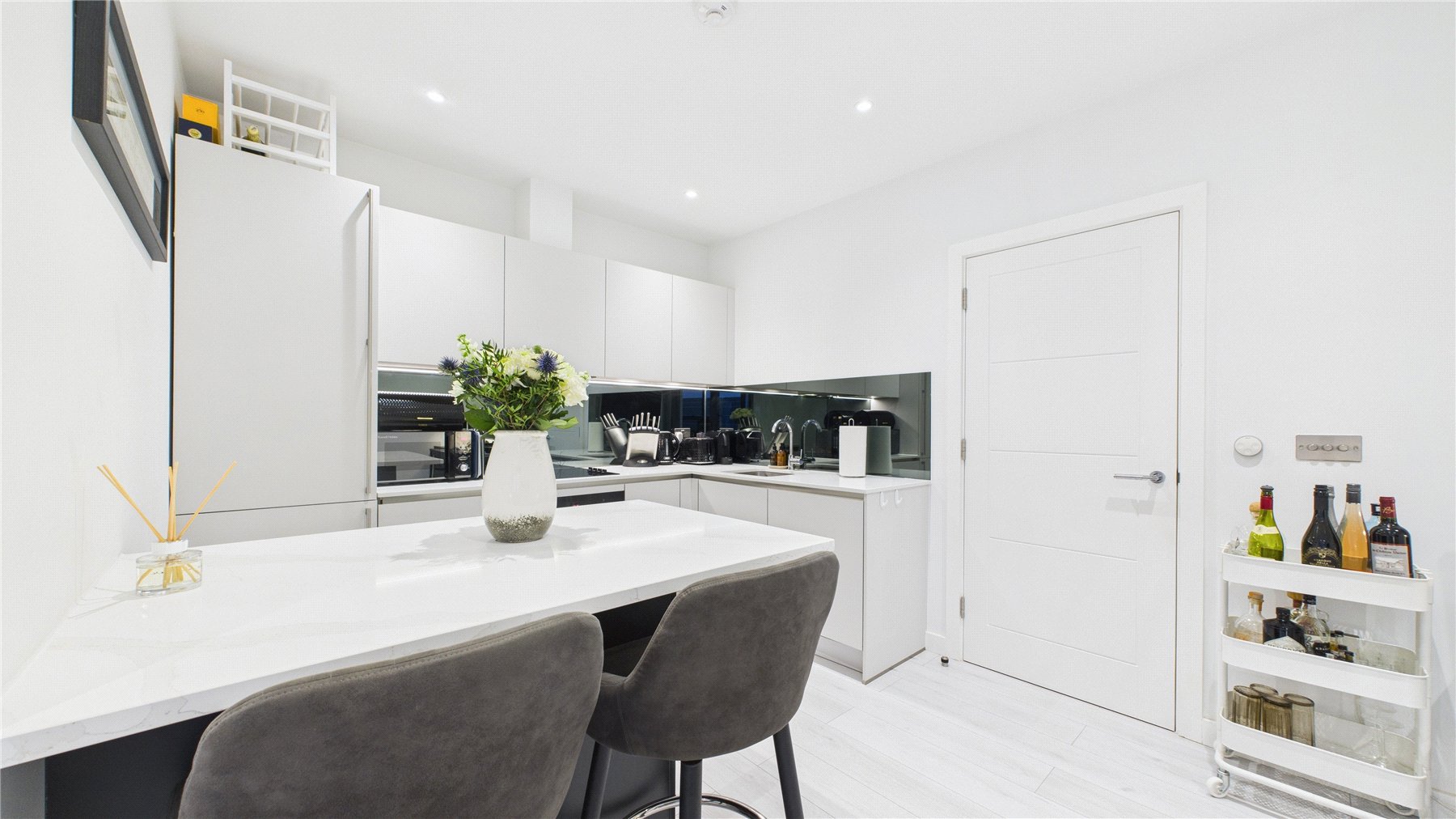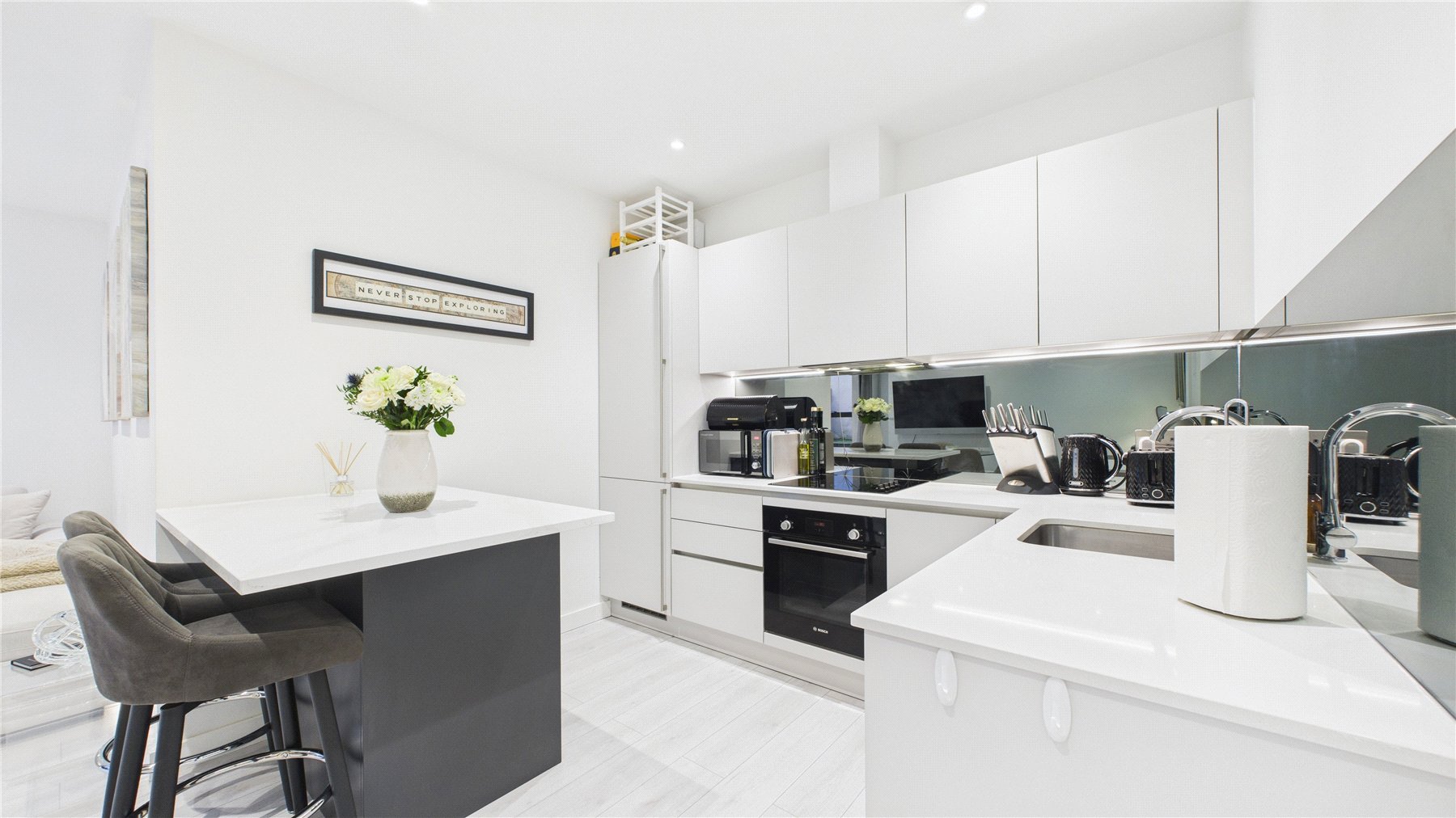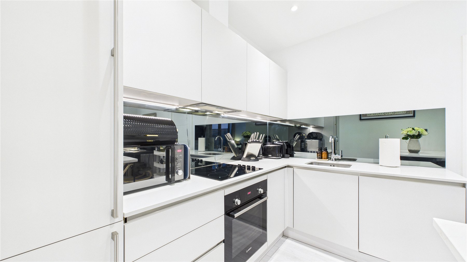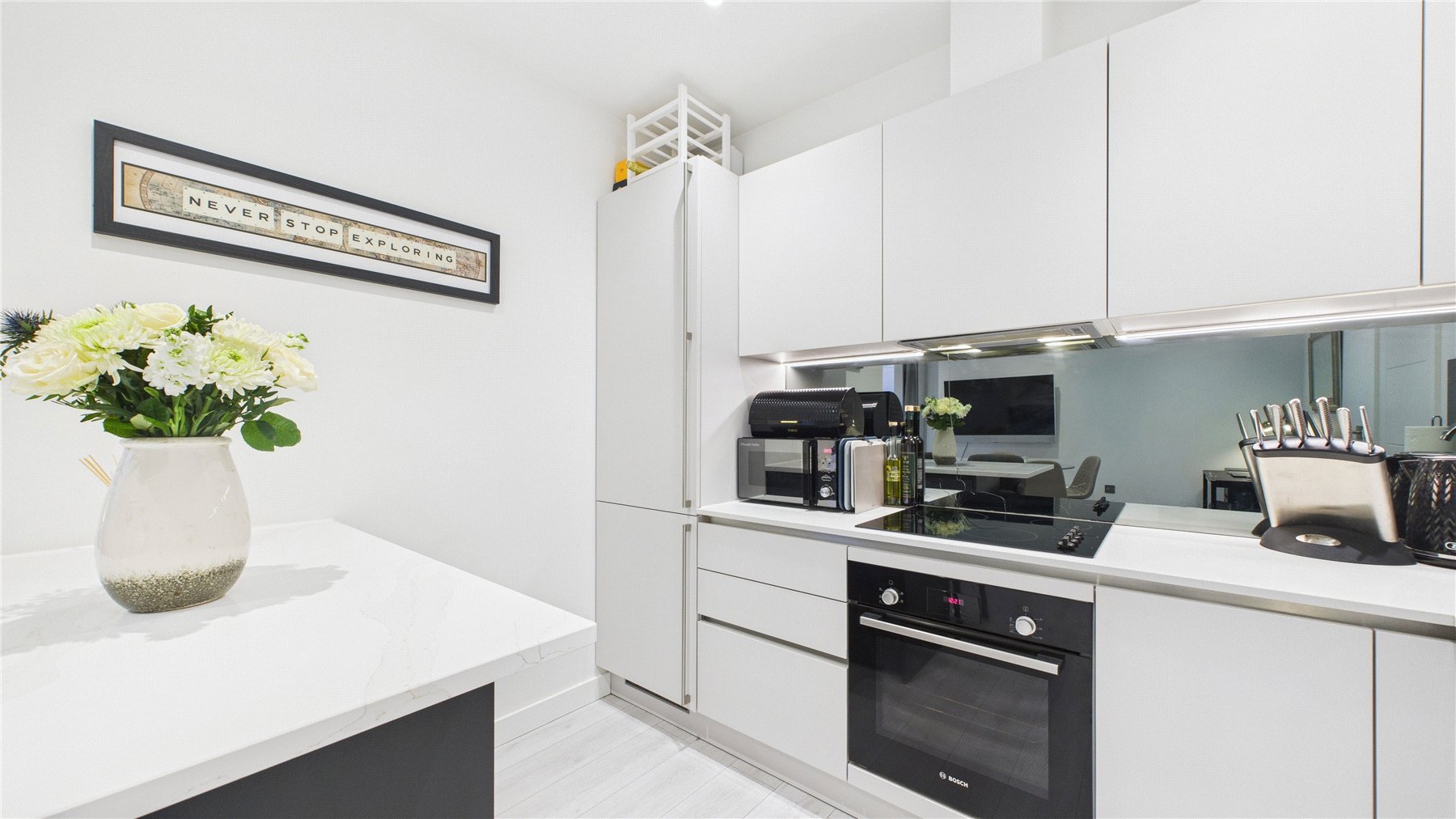 The contemporary kitchen is finished to a high standard, boasting a range of eye- and base-level units, integrated Bosch appliances, sleek quartz worktops, and a stylish glass splashback.