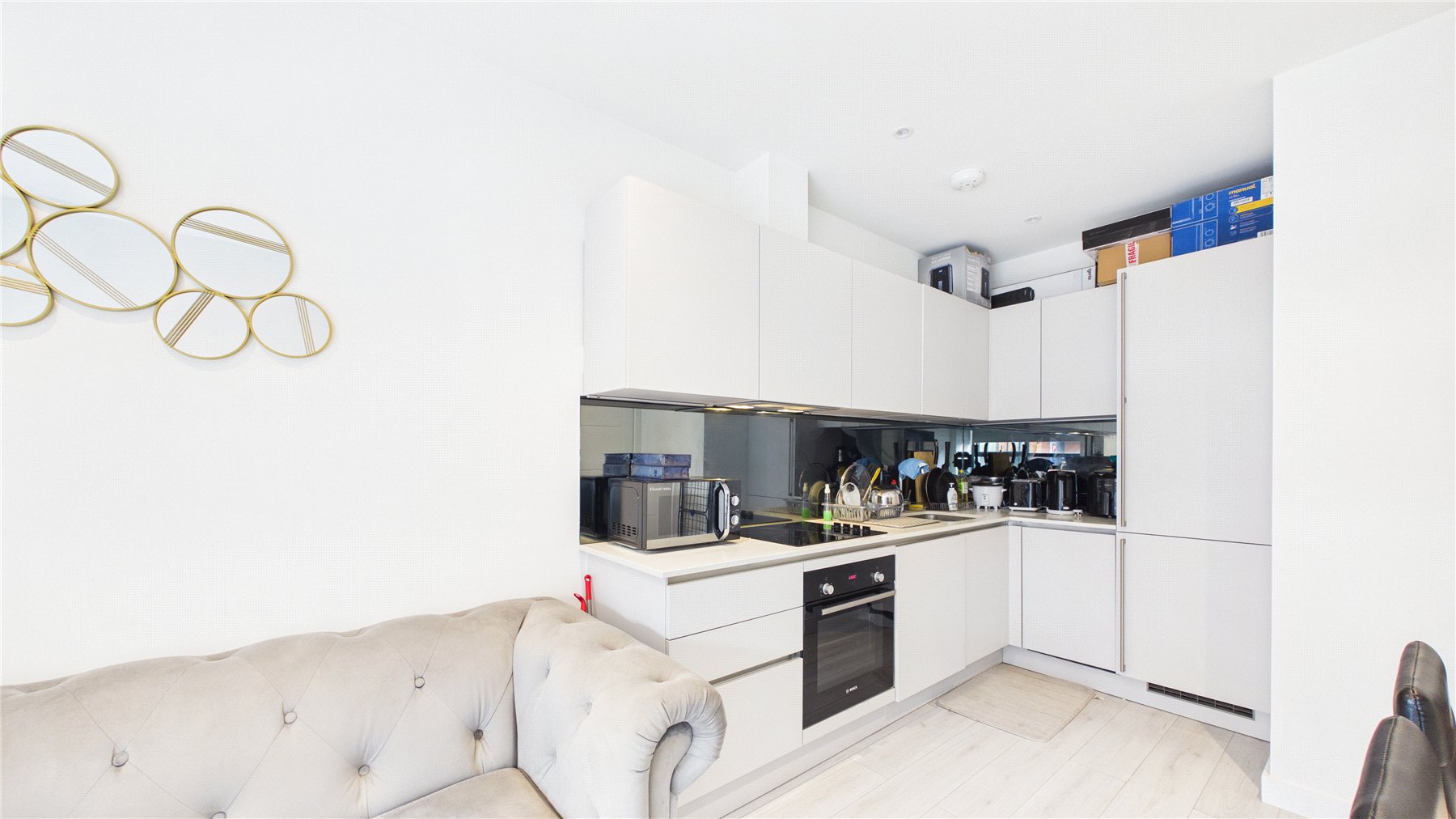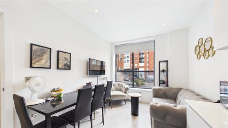 The open plan living / kitchen, which is flooded with natural light via a floor to ceiling window, which outlooks to the road. The contemporary style kitchen benefits from a range of eye and base level storage units, integrated Bosch appliances and quartz worktops, with a glass splashback.