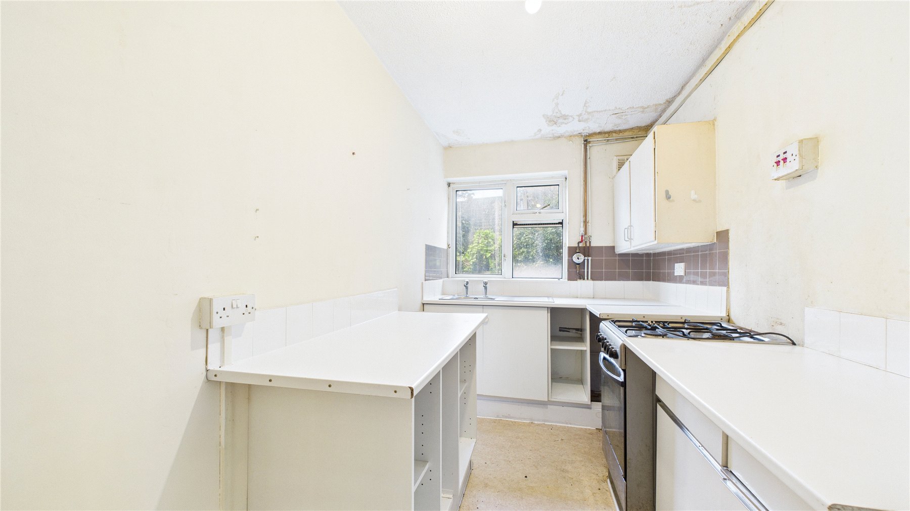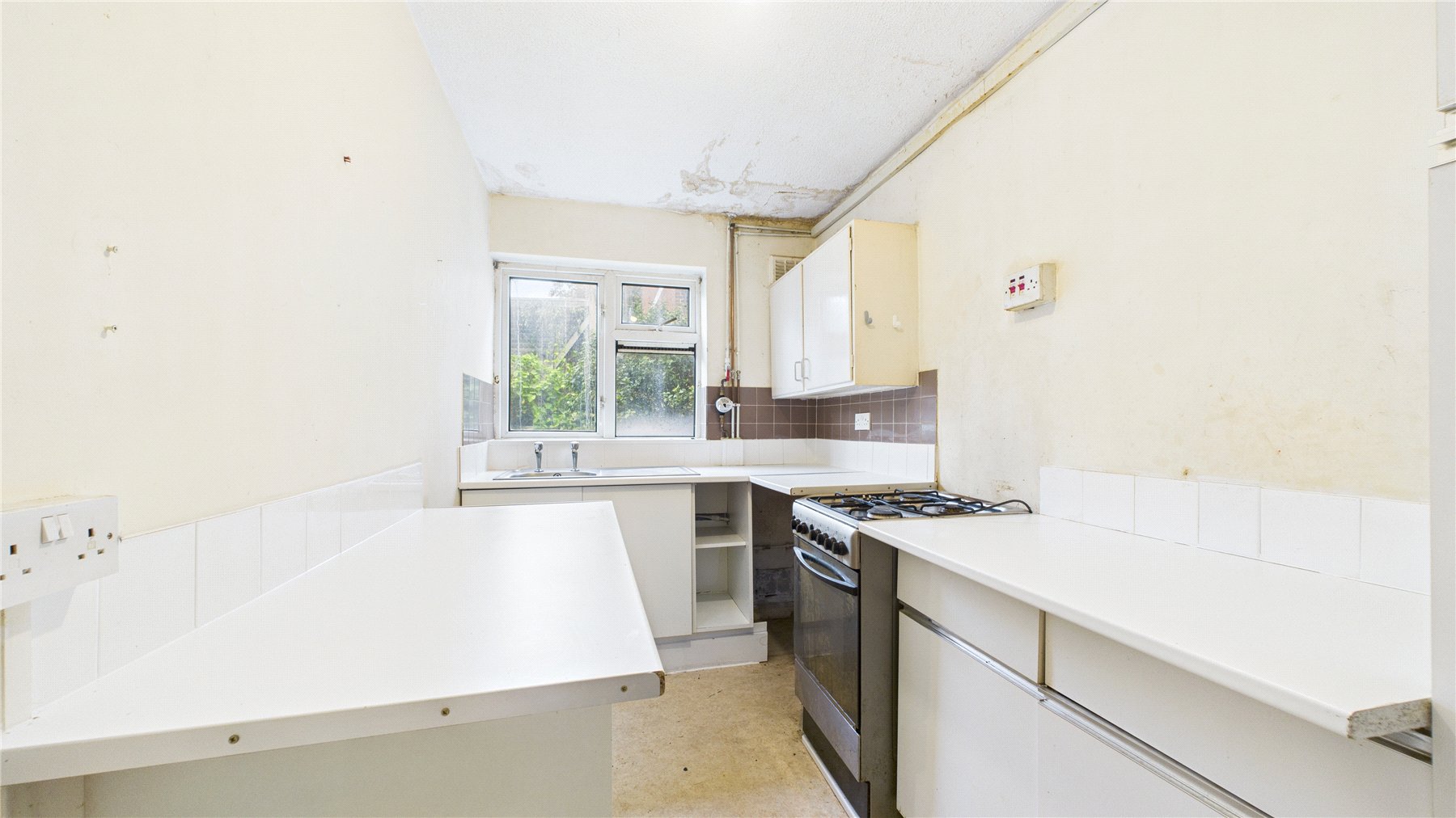 The kitchen offers a practical layout and could easily be reimagined with modern fittings to create a bright and functional cooking area.