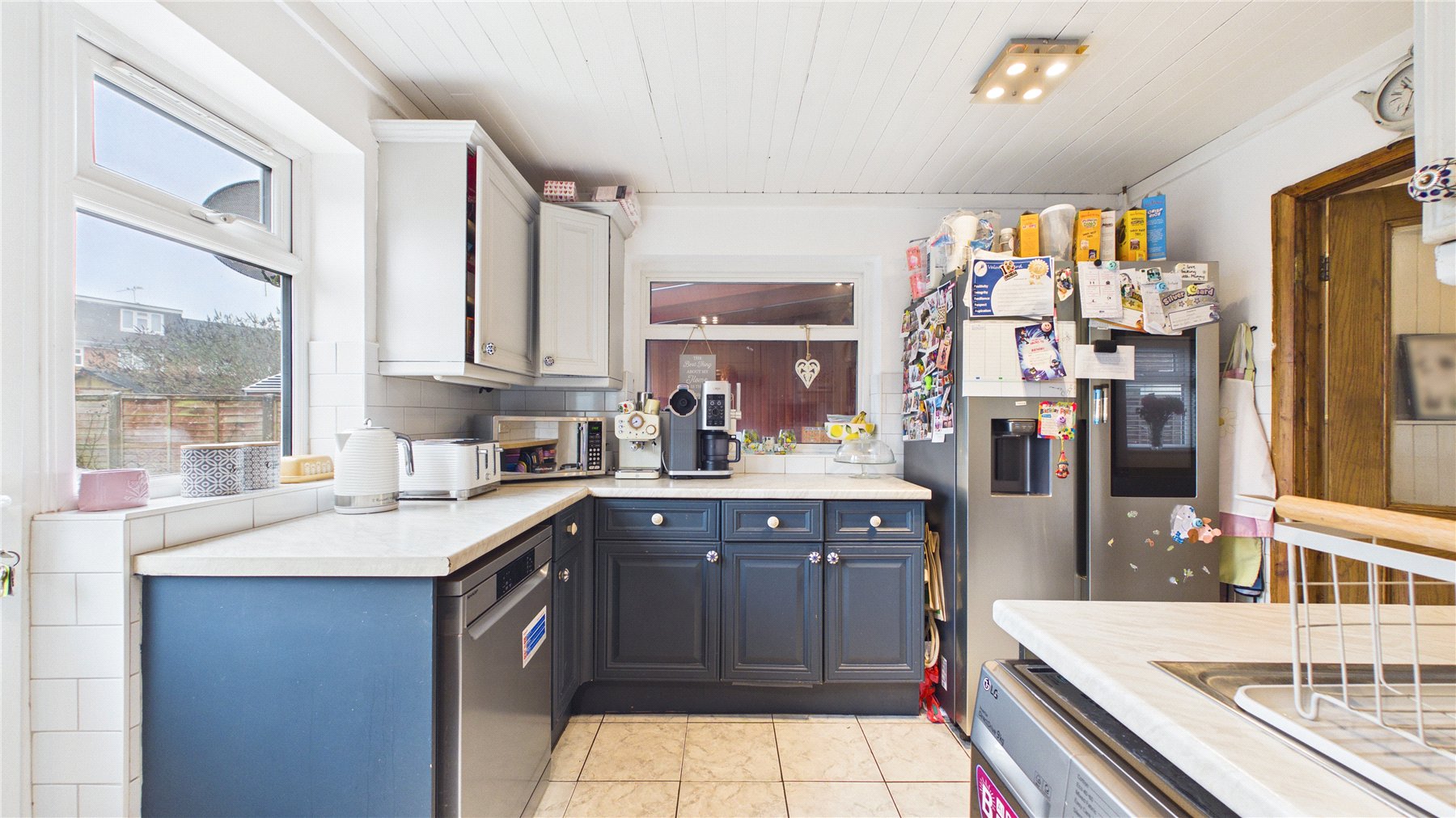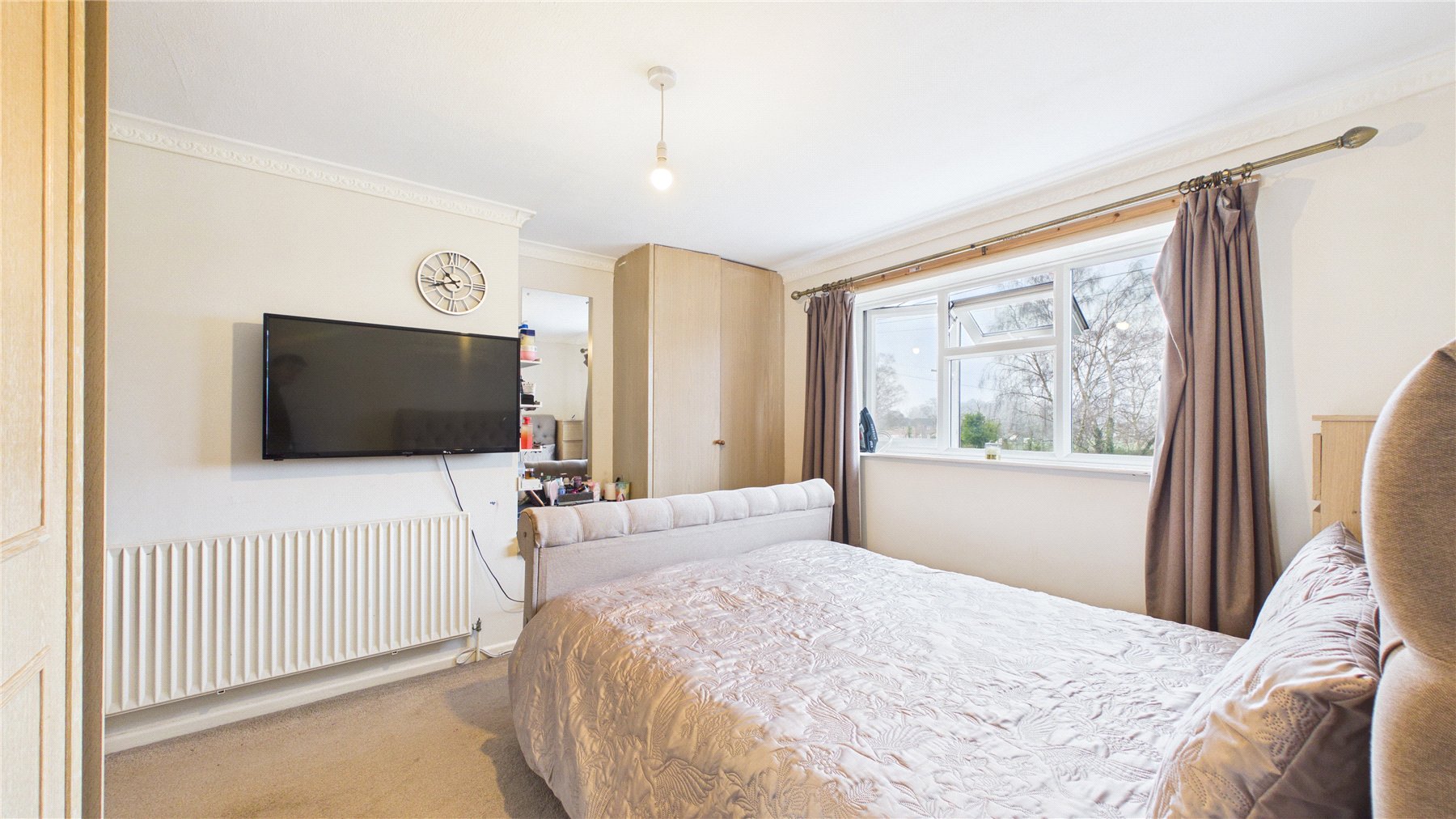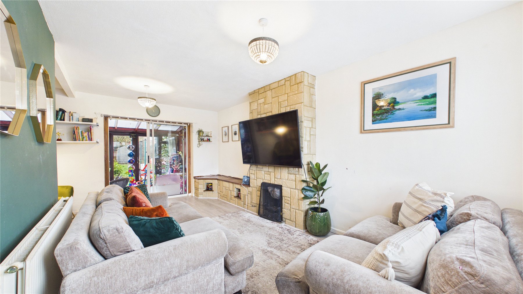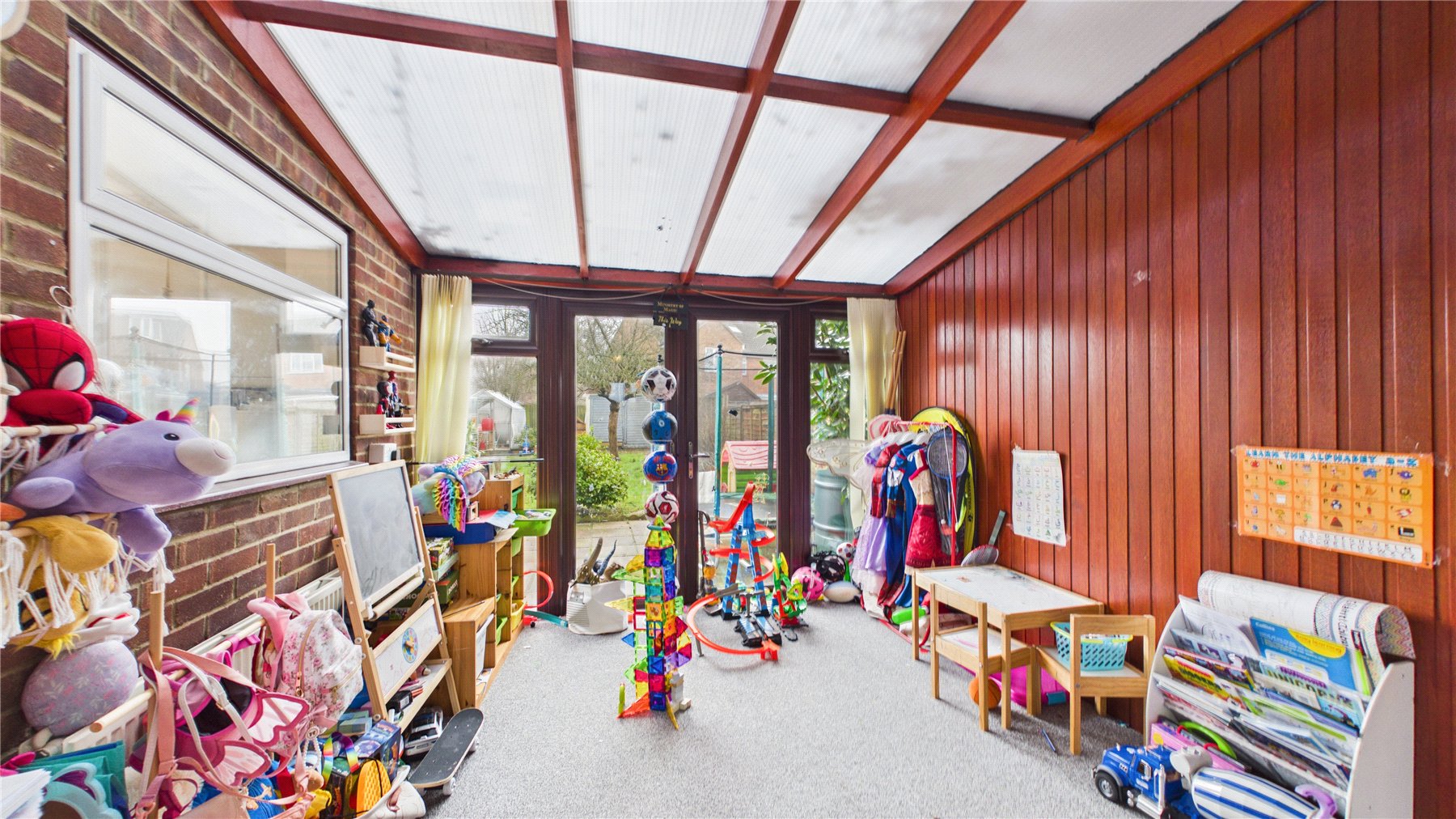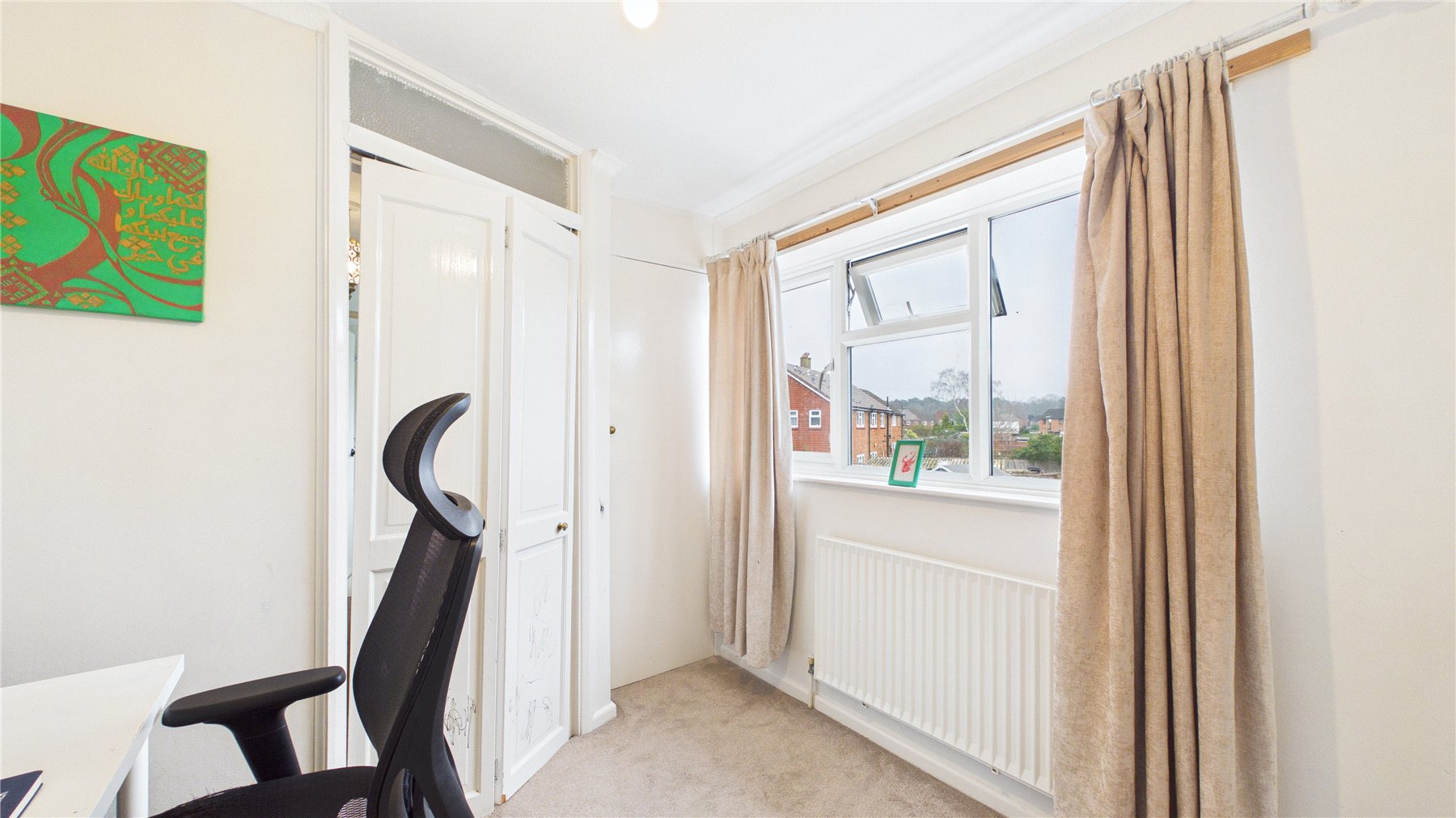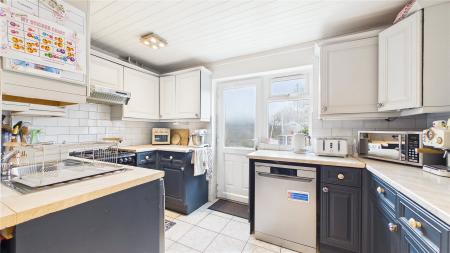 The kitchen is well-proportioned and functional, with ample storage and worktop space. Adjacent to the kitchen, the garden room provides valuable additional space, perfect for use as a playroom, snug or home office. Its position offers exciting potential to create an open-plan kitchen/dining/family space, subject to the usual consents.