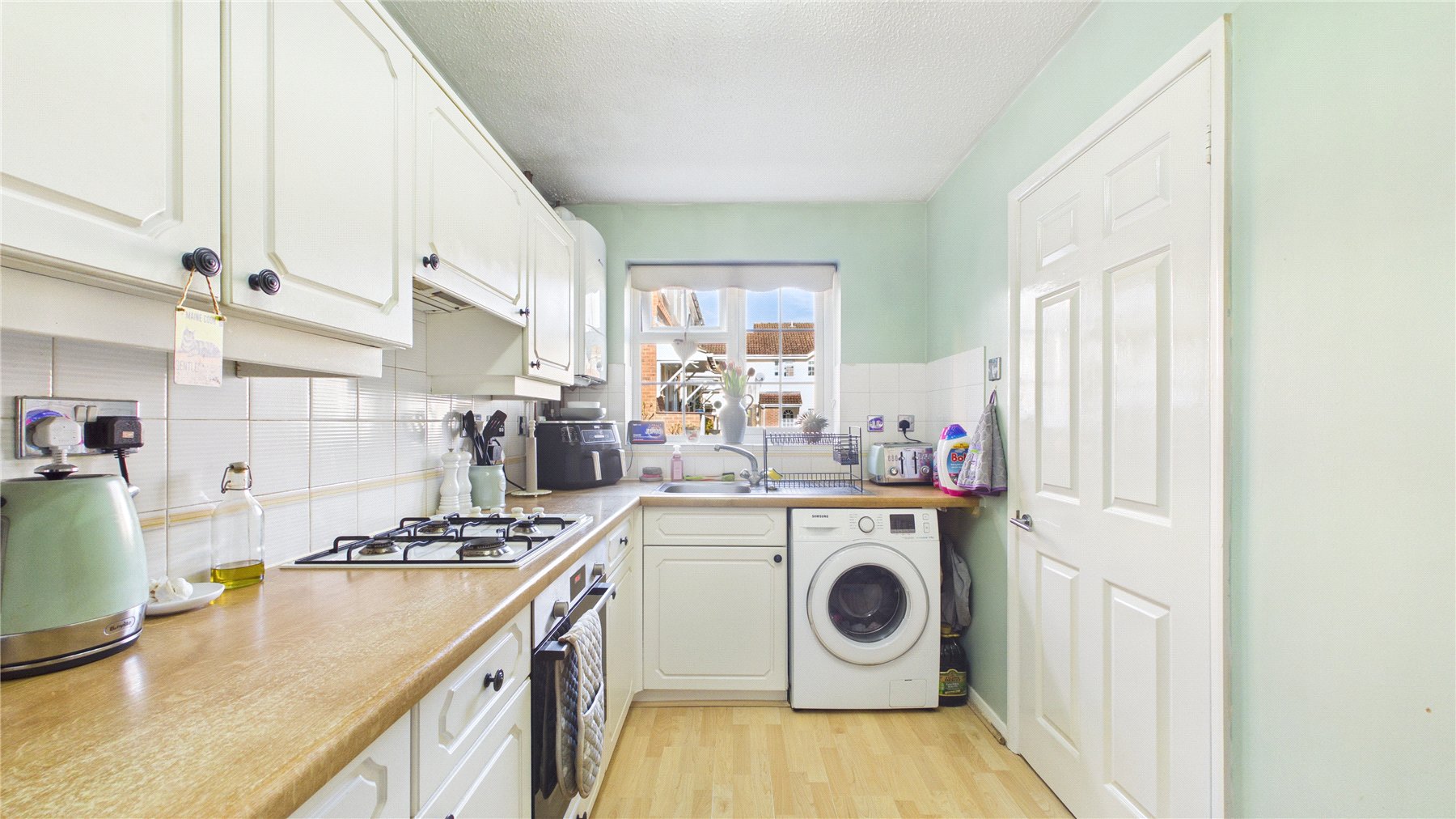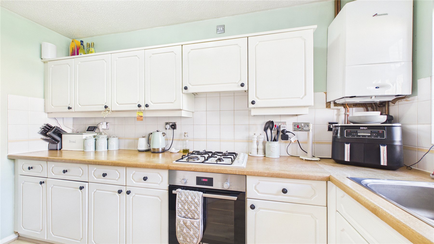 The kitchen is positioned to the front of the property and is fitted with a range of units and work surfaces, overlooking the communal space out the front and offering a practical and well-designed layout.