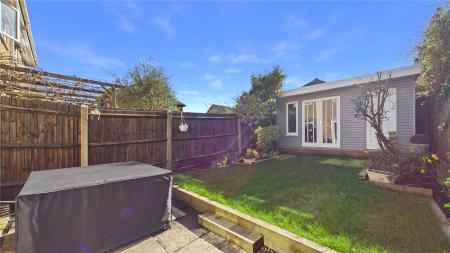 Externally, the rear garden is predominantly laid to lawn with a patio area, creating an ideal setting for outdoor dining and summer enjoyment. A particular feature of the property is the detached garden cabin, currently providing excellent additional space that could suit a home office, gym or studio.