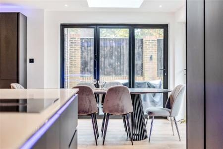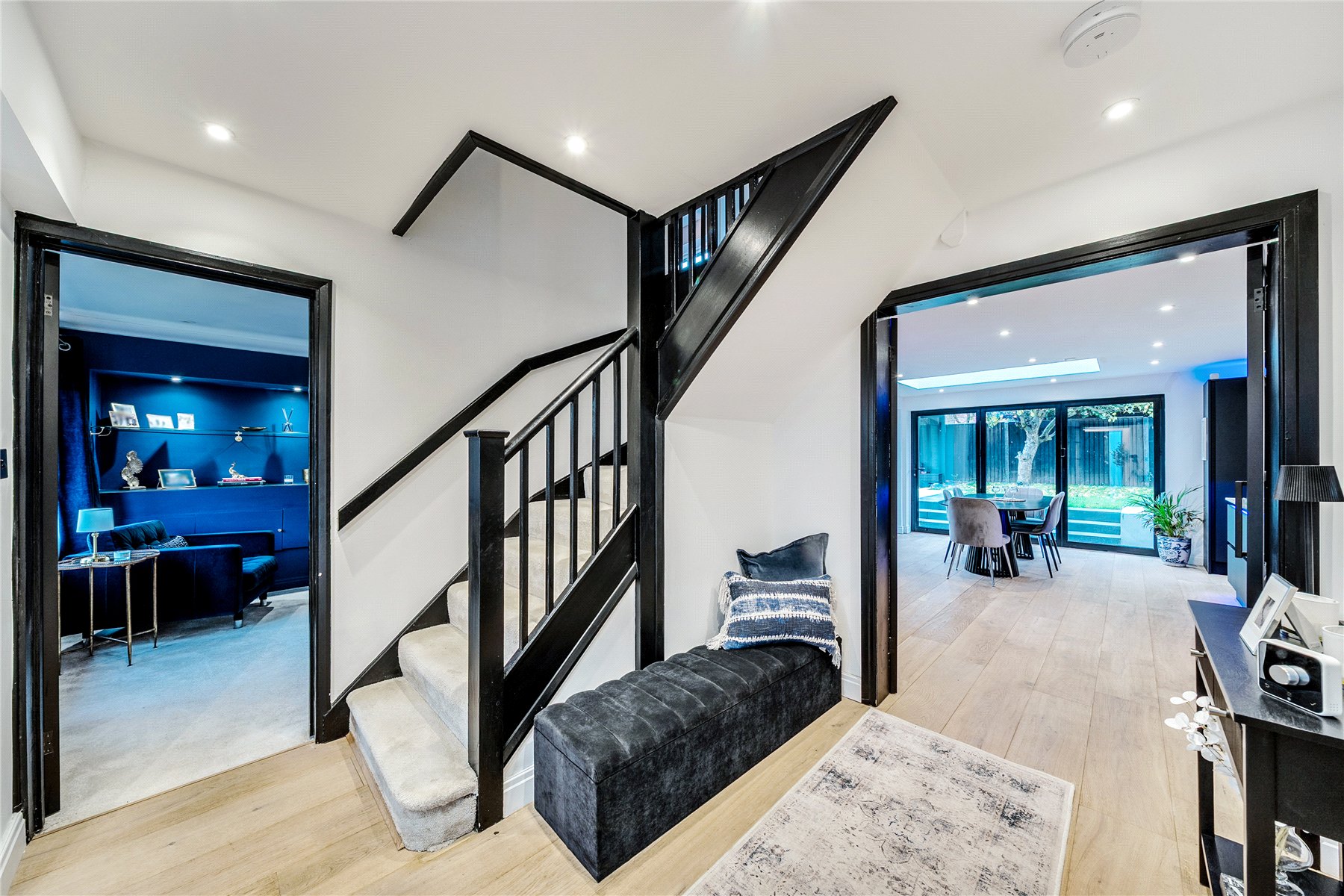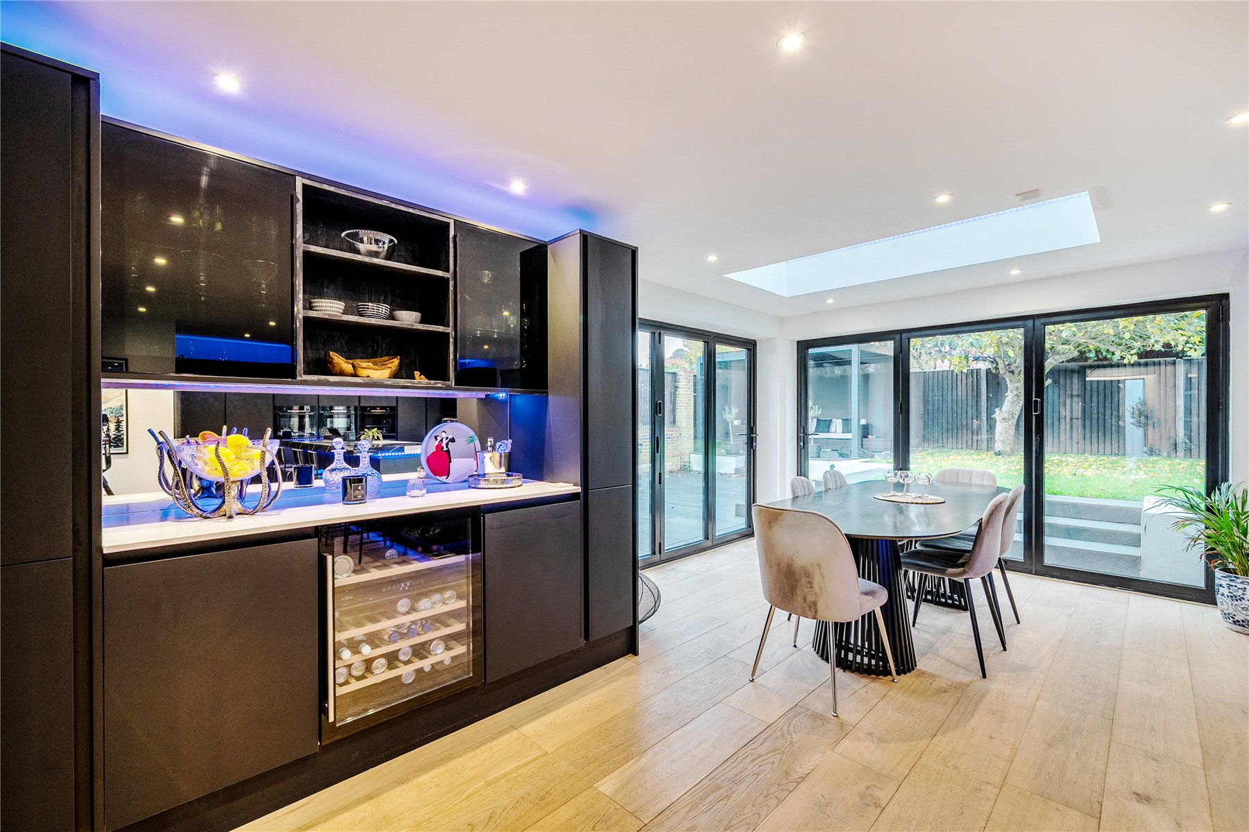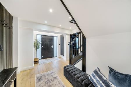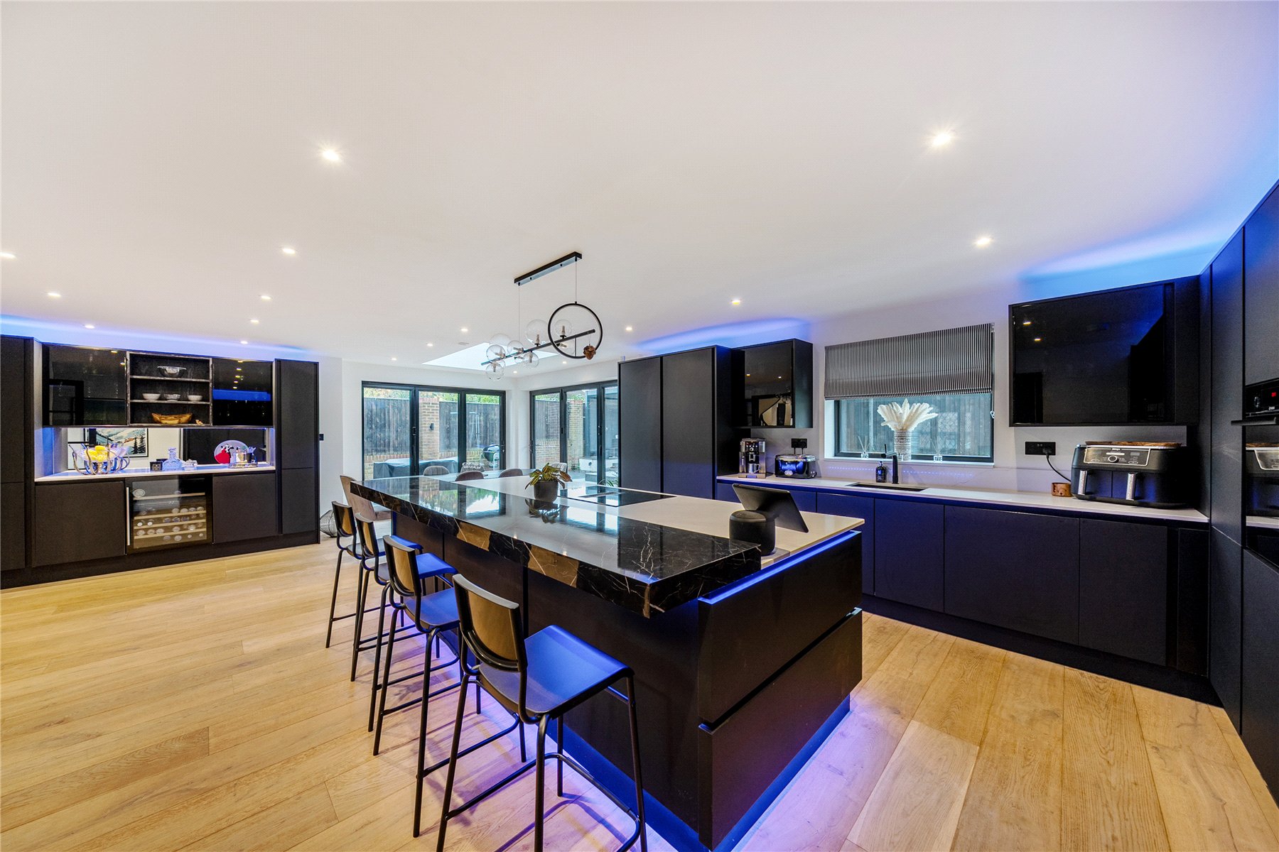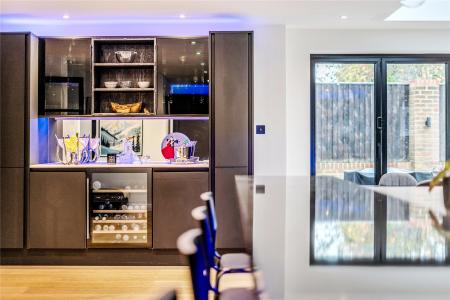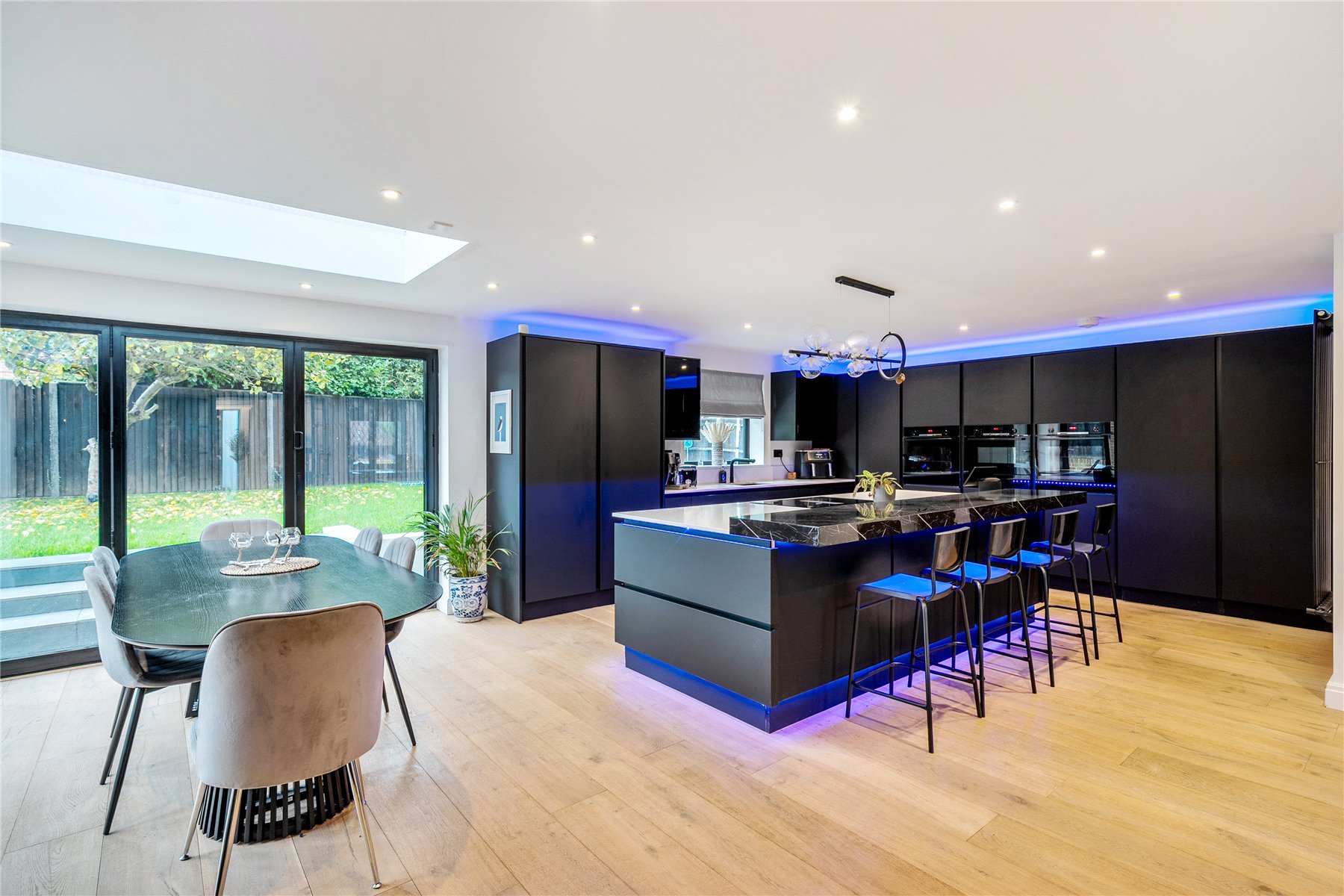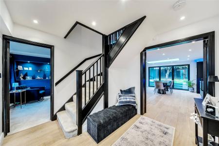 Upon entering, the bright hallway leads to a truly impressive rear facing open-plan kitchen, snug, and dining room truly the heart of the home. This space has been meticulously designed with entertaining and everyday family life in mind, featuring sleek black cabinetry, integrated appliances, a large central island with breakfast bar, and elegant LED feature lighting. Full-width bi-fold doors open onto the rear terrace, seamlessly connecting the indoors with the landscaped garden.