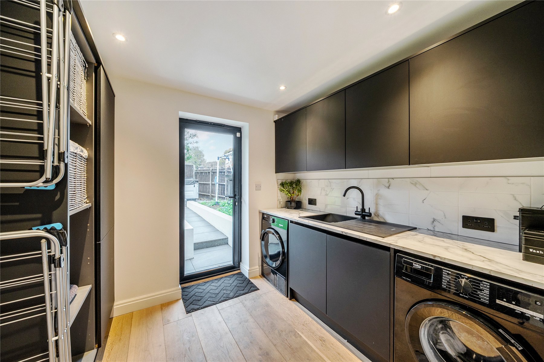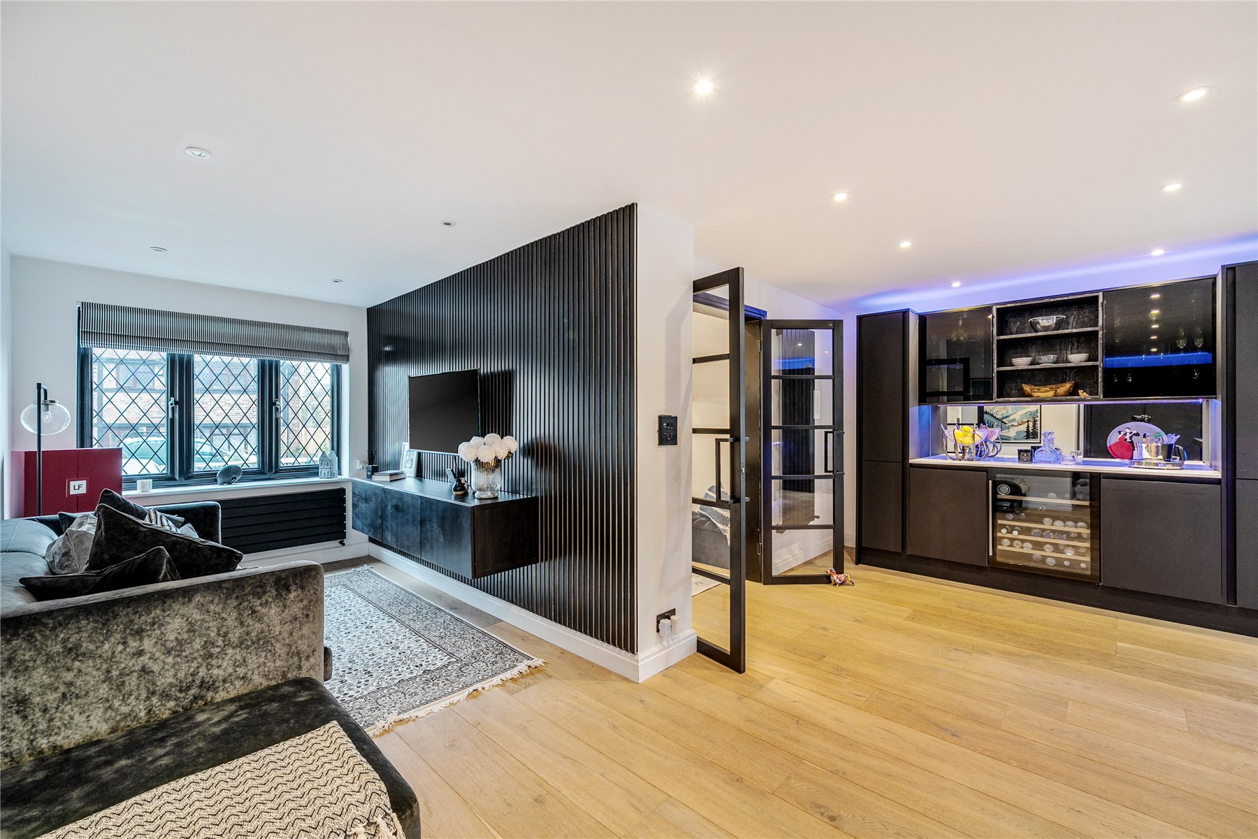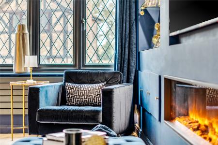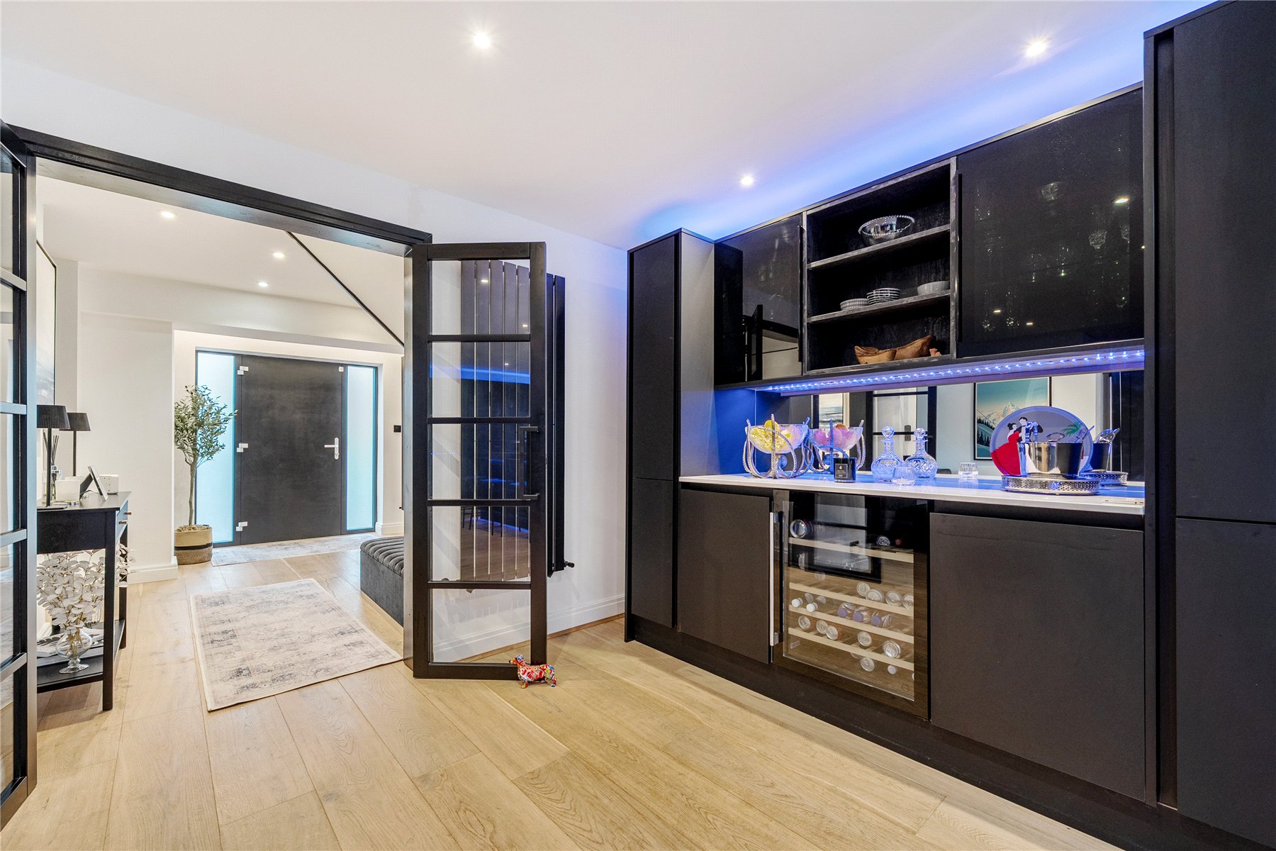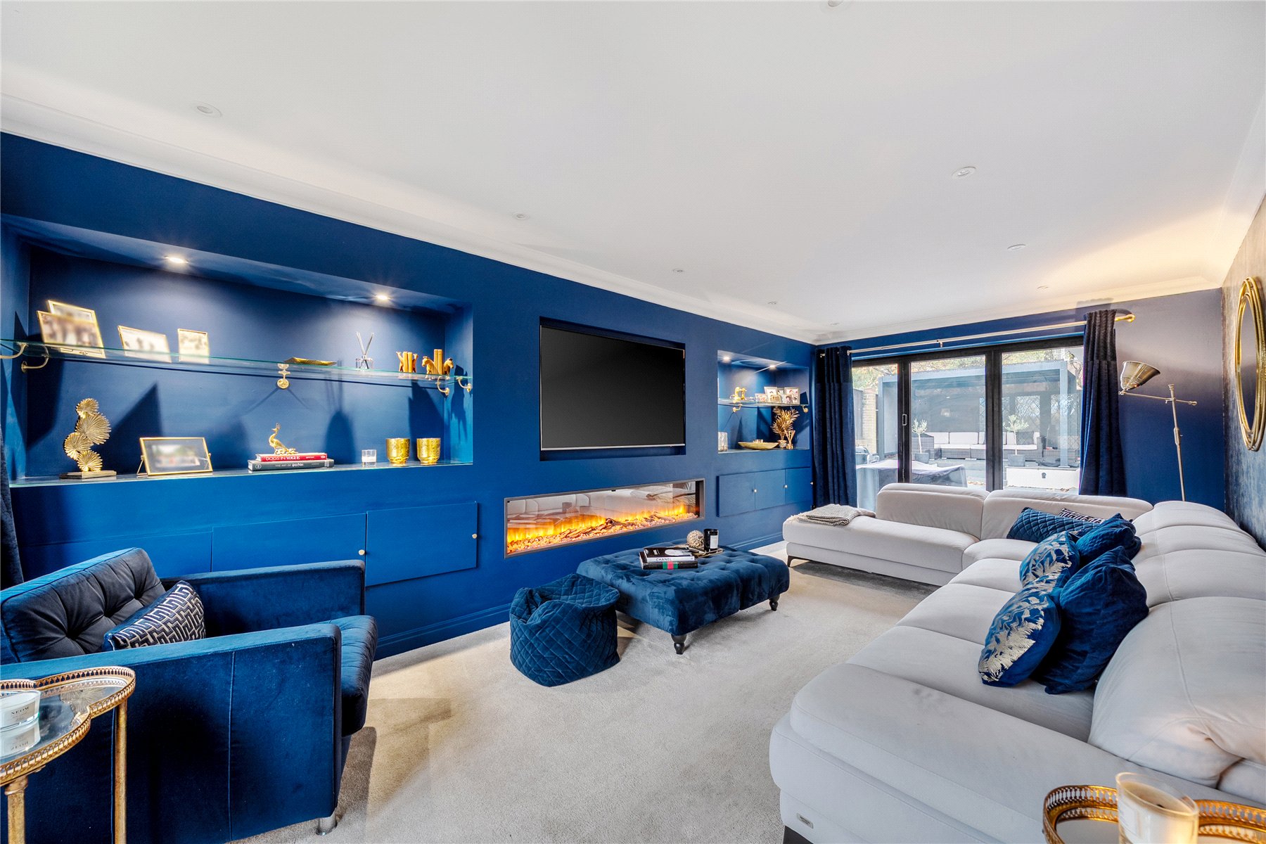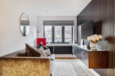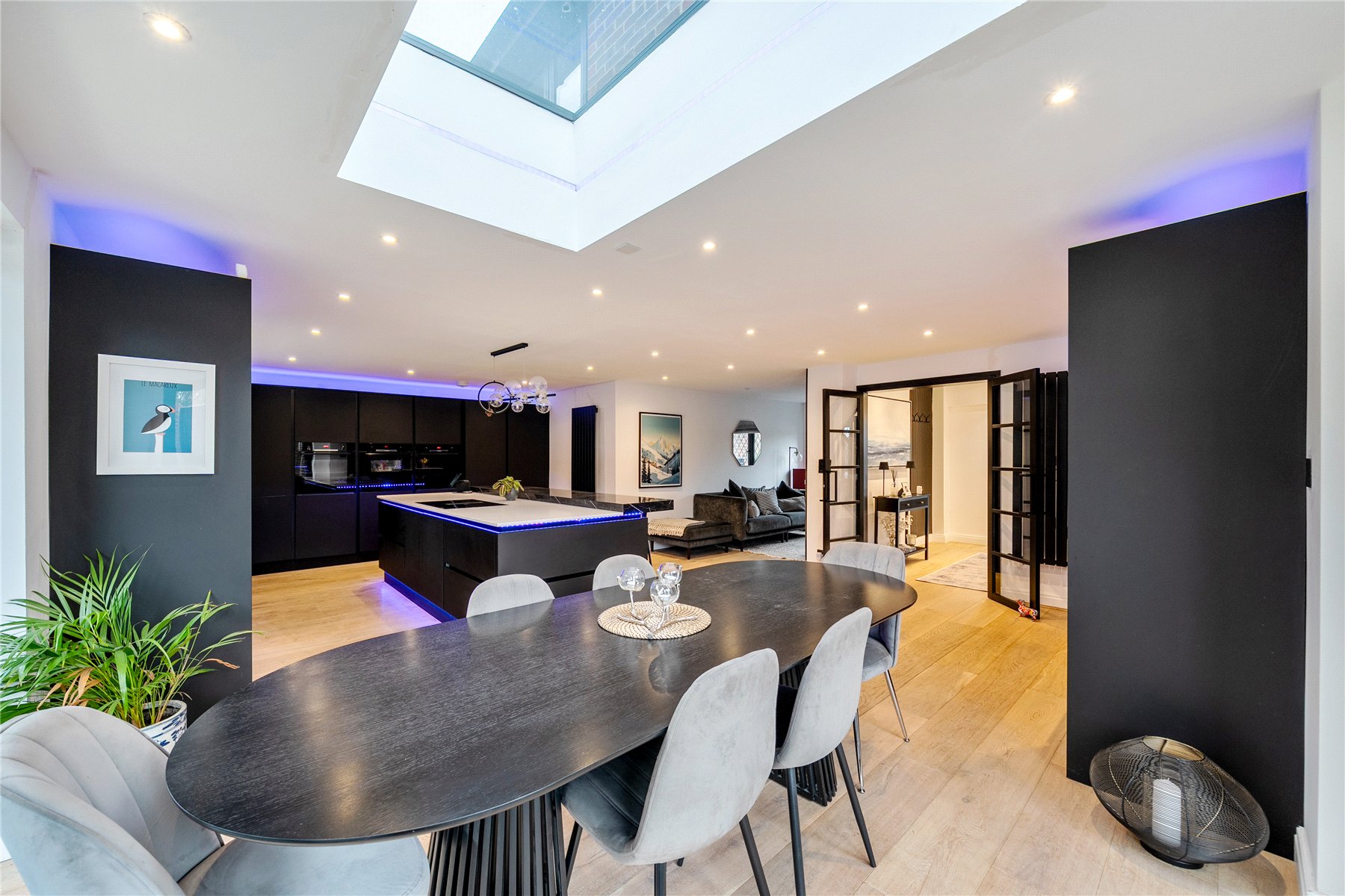 Upon entering, the bright hallway leads to a truly impressive rear facing open-plan kitchen, snug, and dining room truly the heart of the home. This space has been meticulously designed with entertaining and everyday family life in mind, featuring sleek black cabinetry, integrated appliances, a large central island with breakfast bar, and elegant LED feature lighting. Full-width bi-fold doors open onto the rear terrace, seamlessly connecting the indoors with the landscaped garden.