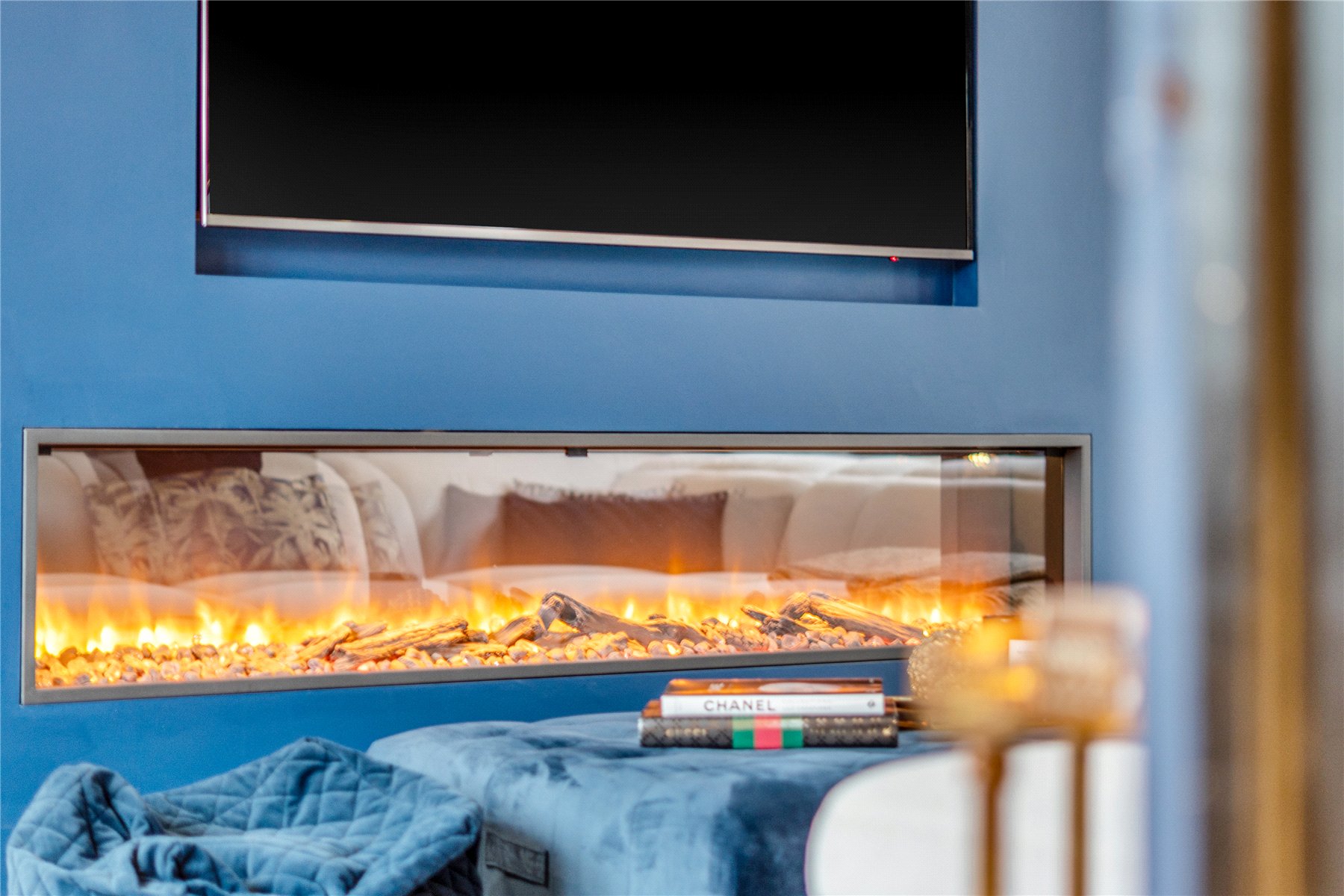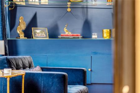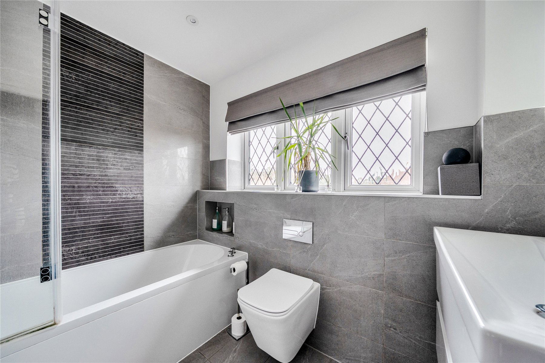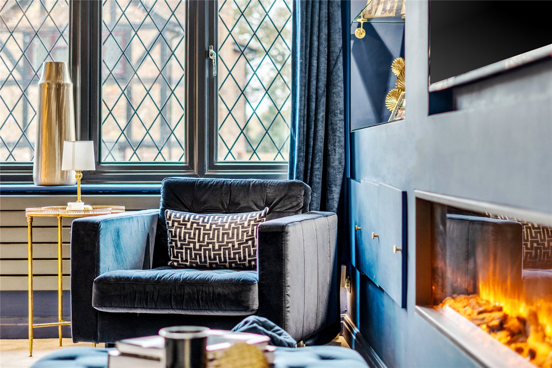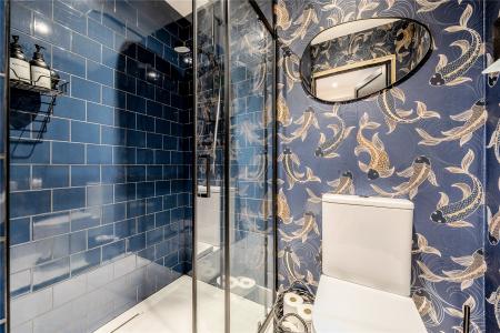 A separate living room, located to the front of the home, offers a more intimate setting, complete with contemporary décor and bespoke built-in storage. There is also a utility room, a cloakroom, and access to the integral double garage, ideal for storage or conversion (subject to planning).