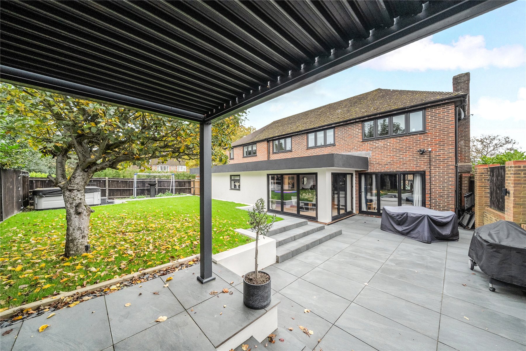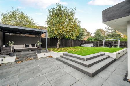 The rear garden has been beautifully landscaped to create a low-maintenance yet stylish outdoor retreat. A large porcelain patio provides space for dining and entertaining, leading up to a raised lawn area bordered by mature trees and fencing for privacy. A covered pergola seating area provides a sheltered spot to relax year-round.
