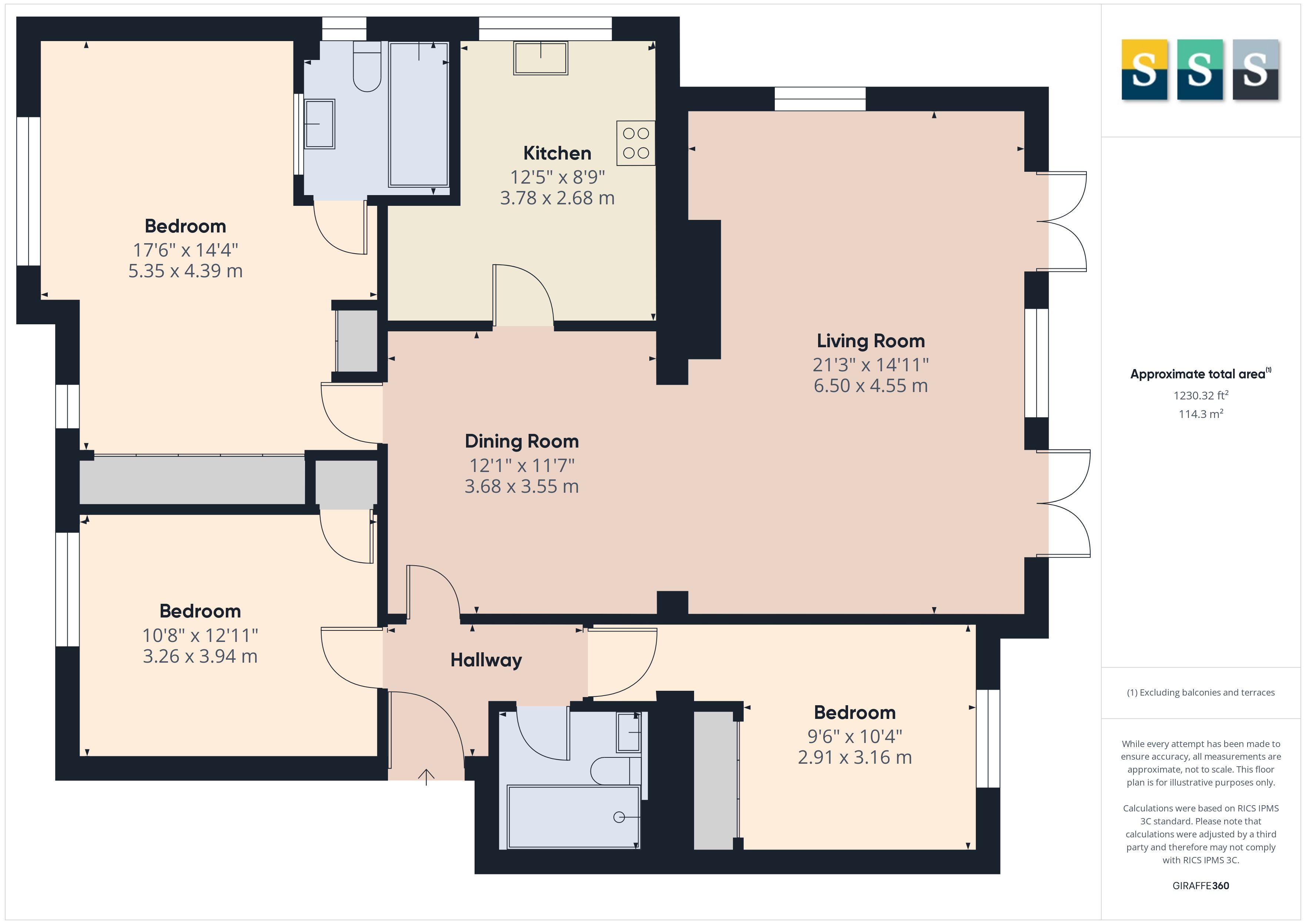 There are three well-sized bedrooms, all boasting fitted wardrobes, and two bathrooms. Bedroom one benefits from an en-suite bathroom.