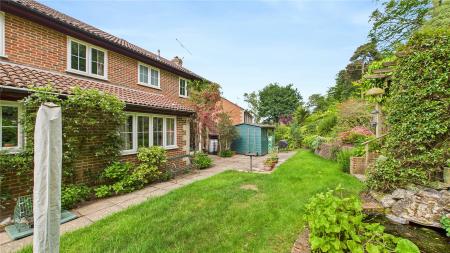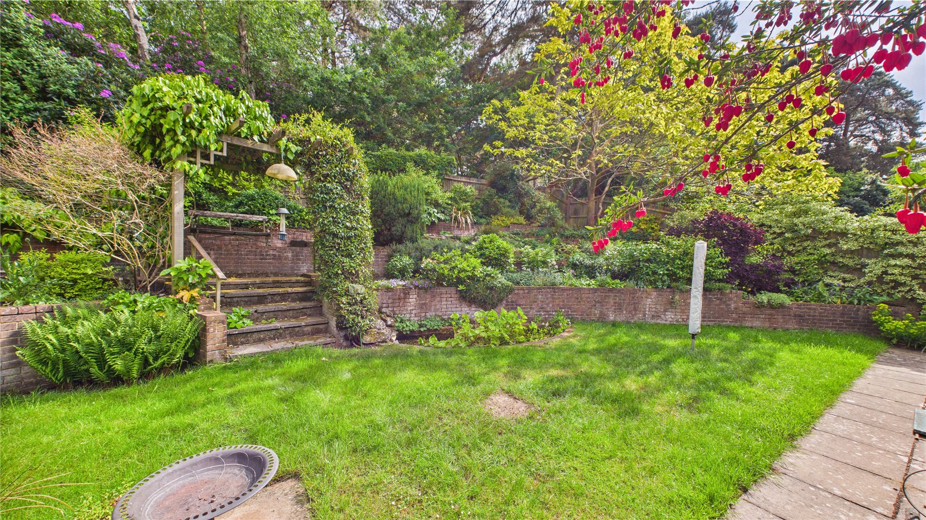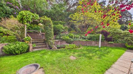 To the rear, the garden is full of colour and enjoys the full width of the plot as it ascends into the bank, creating further seating areas and providing plenty of opportunities for additional planting. Served by a large side access, there is also a double garage with parking in front.