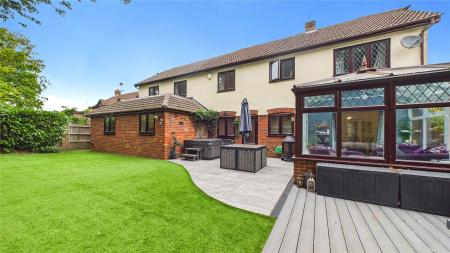 Externally, the property boasts a beautifully landscaped rear garden, perfect for outdoor entertaining and relaxation. A private driveway in front of the double garage offering parking and storage solutions.