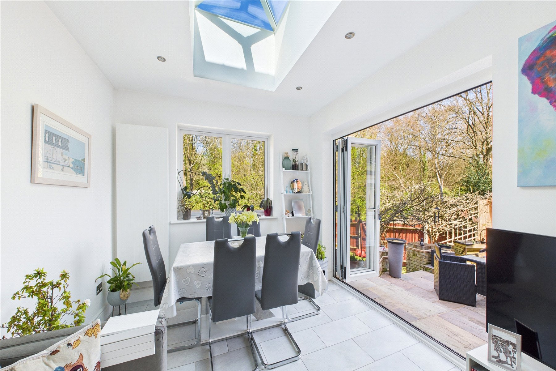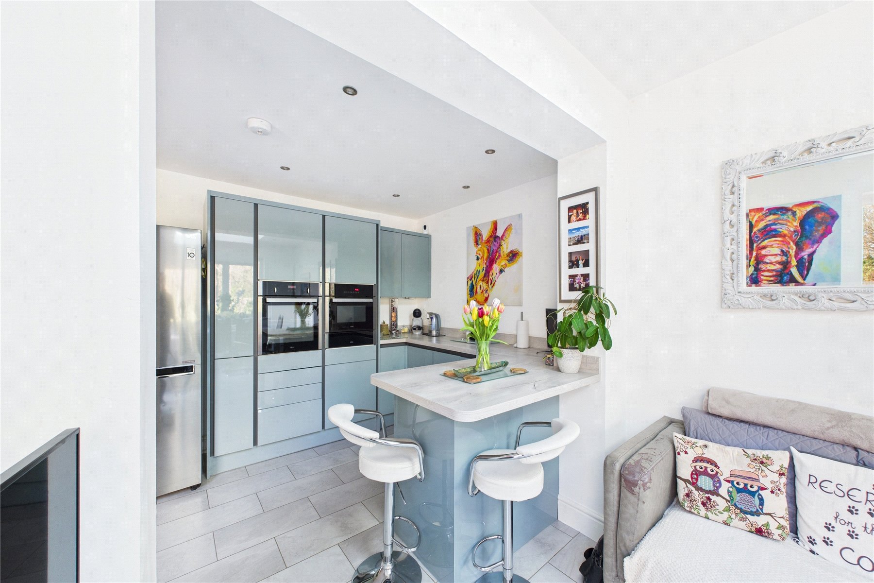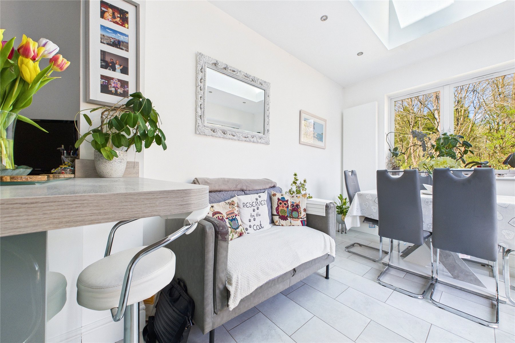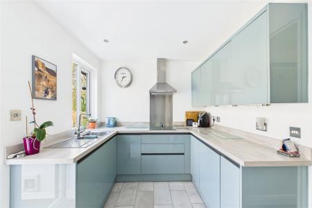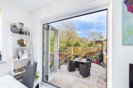 Extended to the rear, the wonderful kitchen/dining room feels like the heart of the home. Overlooking the garden and with bi-fold doors that open onto the patio, natural light floods the property via the overhead lantern. The modern kitchen is fitted with a range of high gloss units and integrated appliances. The sitting room is located at the front of the property and is decorated in neutral tones. There is ample space for relaxed seating. Additionally, there is a ground floor shower room and WC.