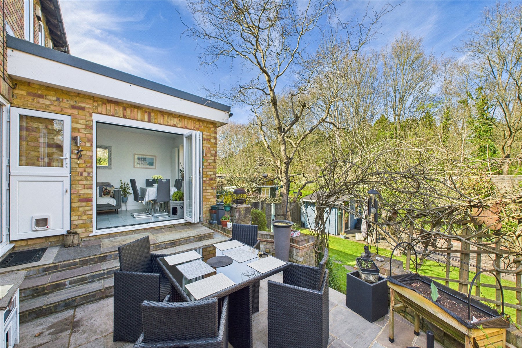 To the rear, the two-tier garden features two patios to enjoy in the summer months and throughout different times of the day, as well as a lawn and summer house with power. Off street parking is located at the front of the property in front of the garage.