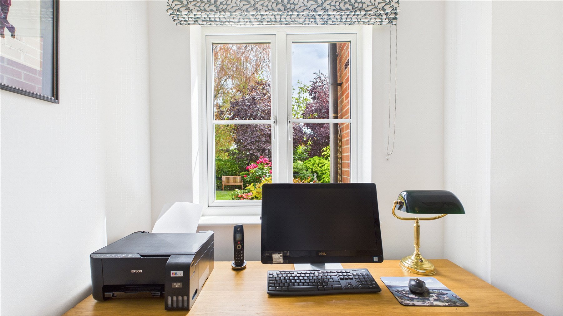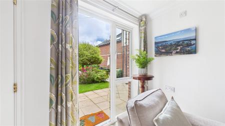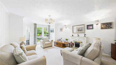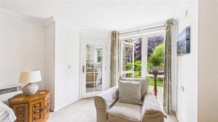 The living room offers ample space for living and dining room furniture and has a feature electric fireplace with attractive surround, boasting access to the rear patio and communal gardens.
