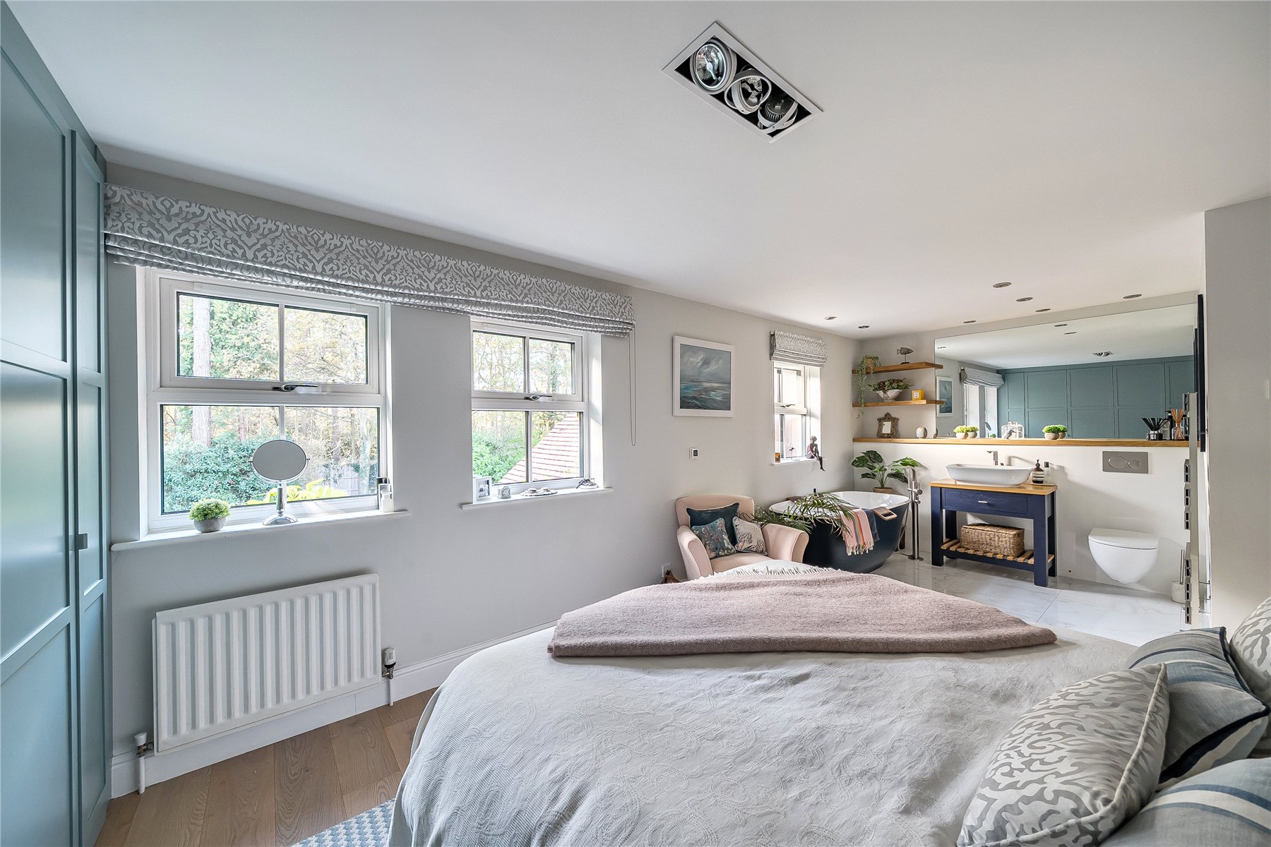 Outdoors, the south-facing landscaped garden and leafy surroundings create an idyllic backdrop, providing a calm and secluded place to unwind, surrounded by mature trees and greenery that reinforce the home's private, countryside feel. The double garage and expansive driveway ensure ample parking and storage.
