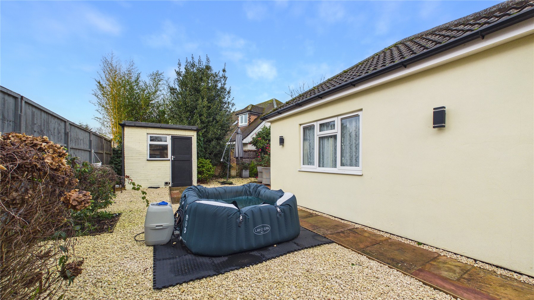 To the rear, the garden has been designed with ease in mind. Landscaped to feature multiple seating areas with a mixture of hard standing and shingle. There are also areas for planting and a brick built storage shed.