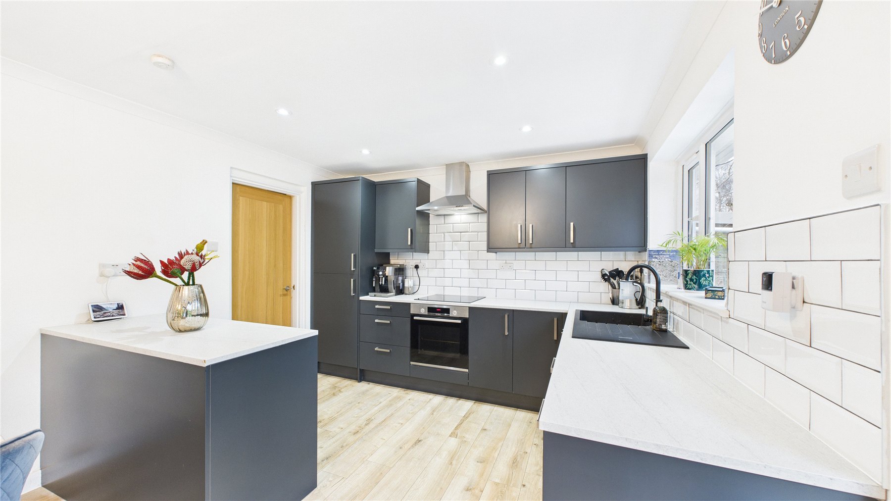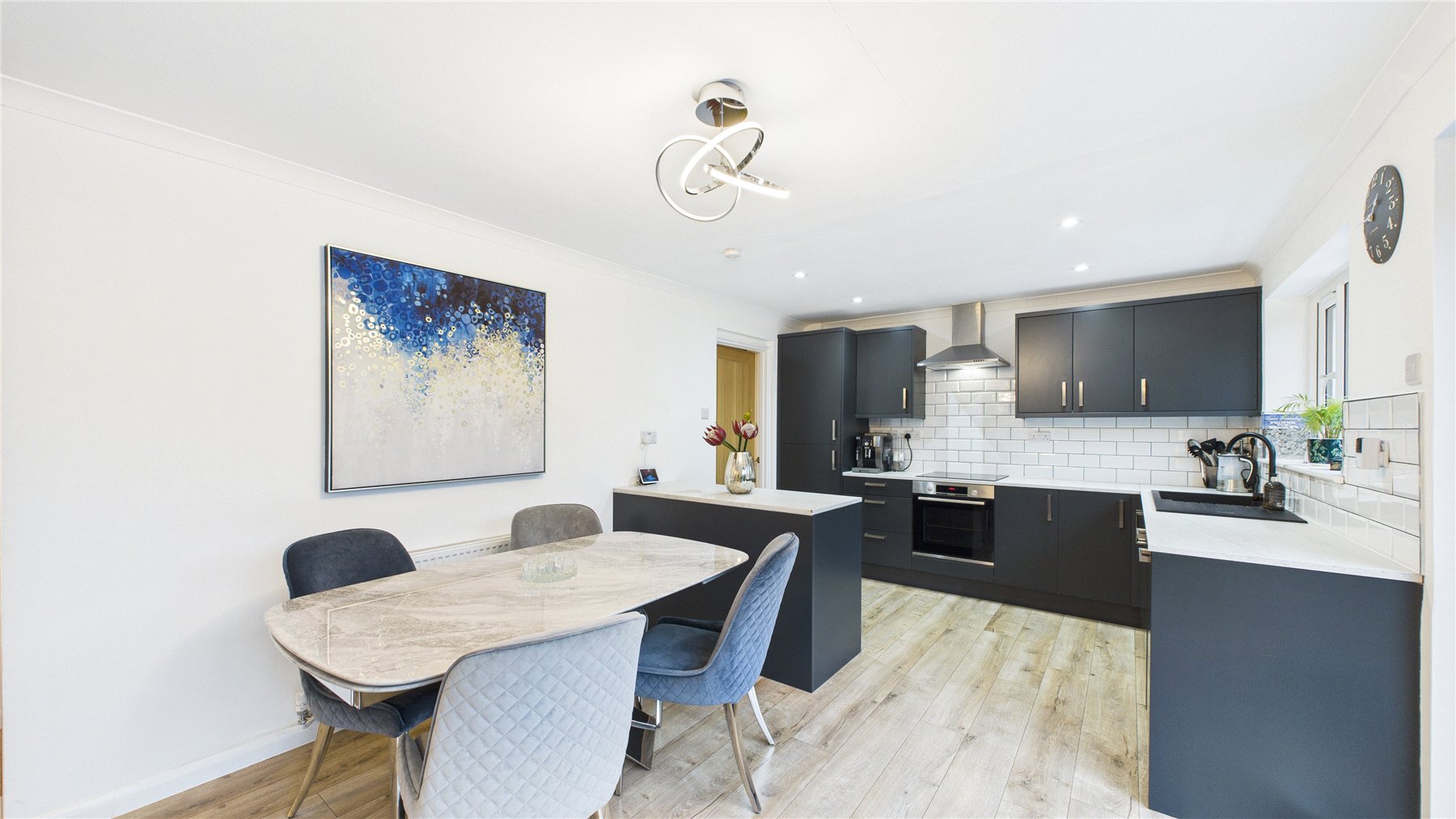 The kitchen features a range of modern eye and base level storage units and integrated appliances, and a separate utility room.