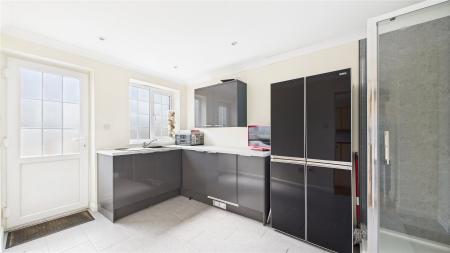 A separate formal dining room to the front elevation provides further flexibility, ideal for entertaining or as a potential playroom or study. To the rear, the kitchen has been updated over the years and features integrated appliances and seamlessly flows to the large utility room.