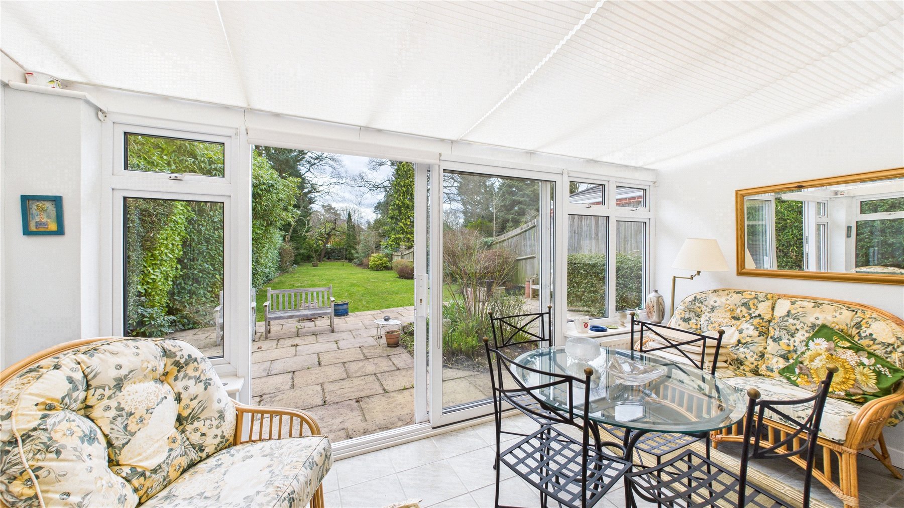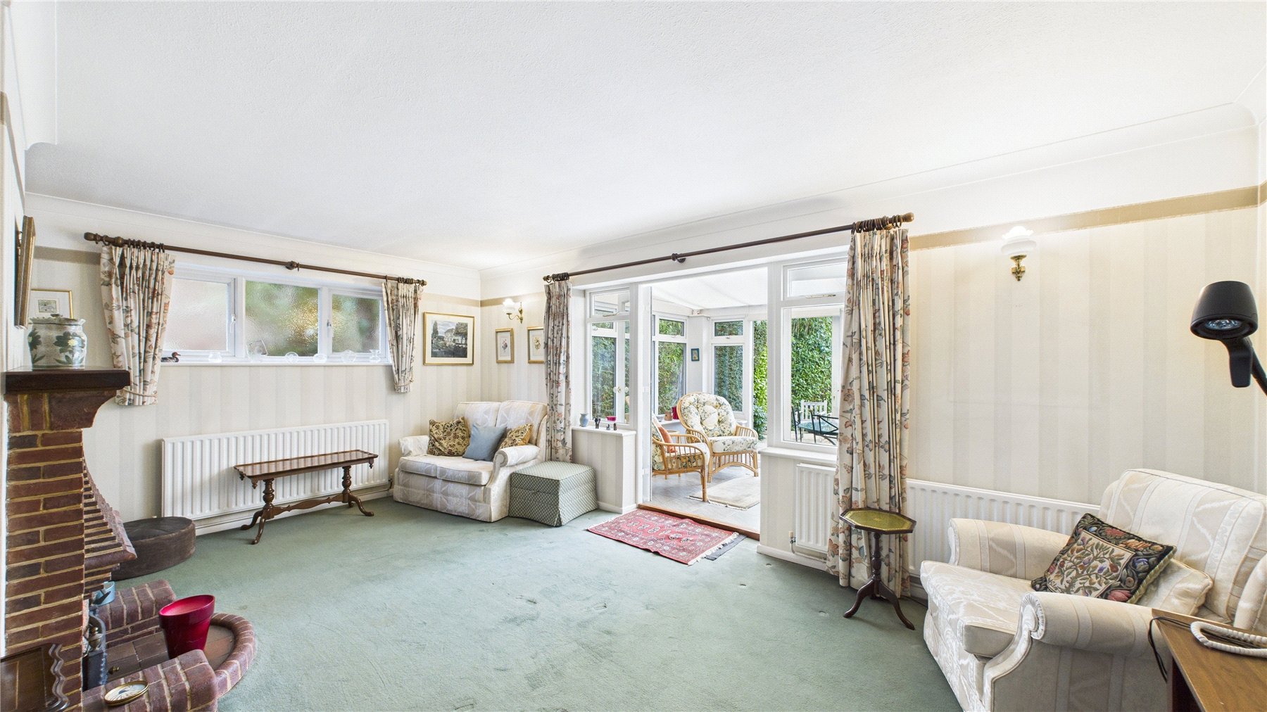 To the rear, the living room overlooks the mature garden and currently leads into a sun room.