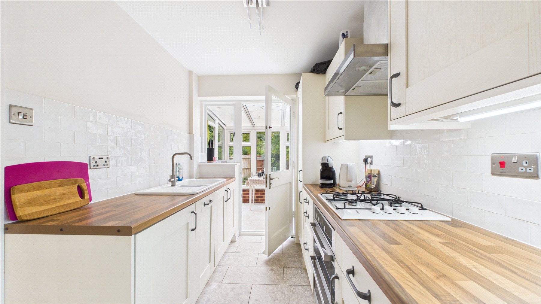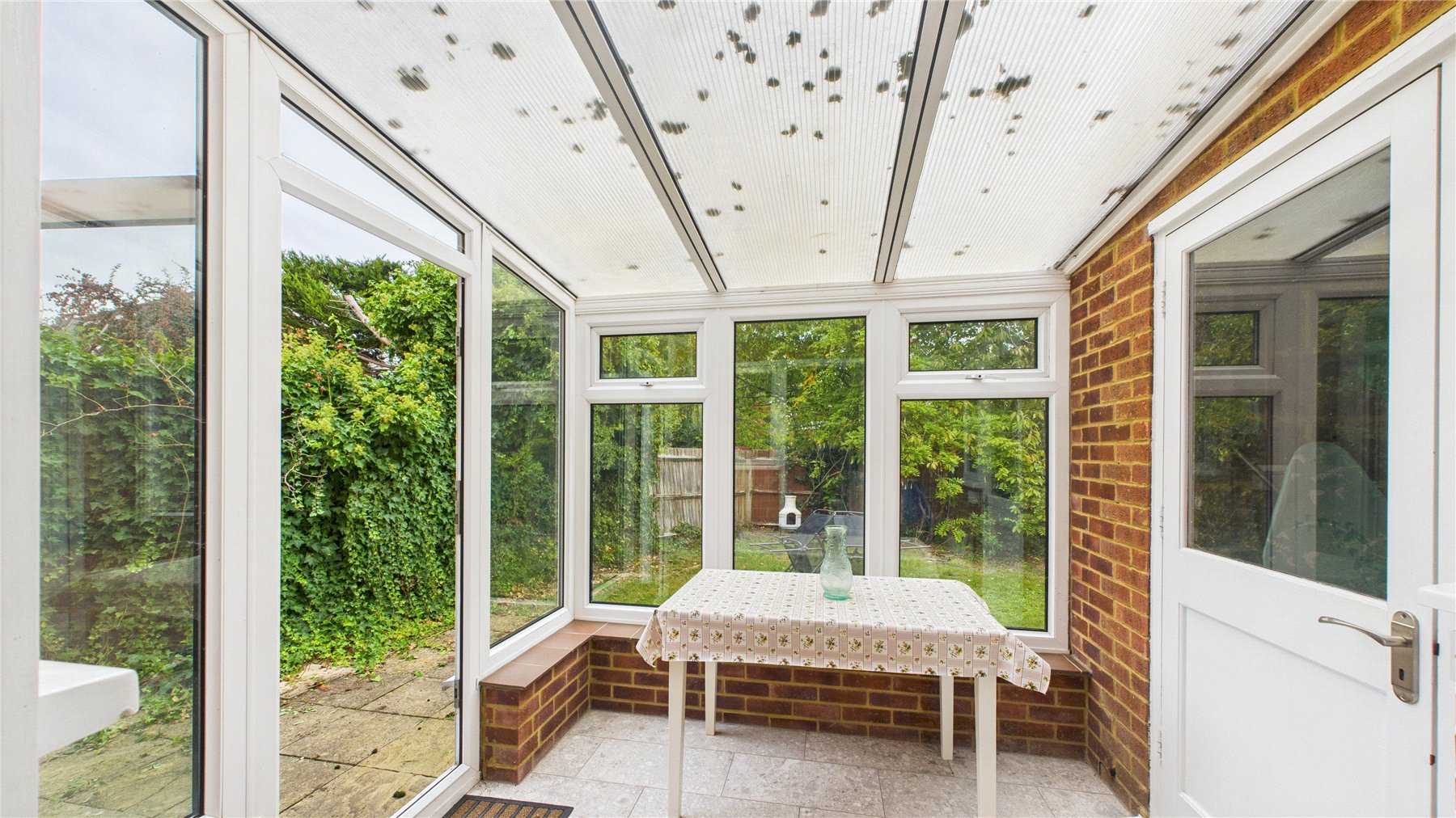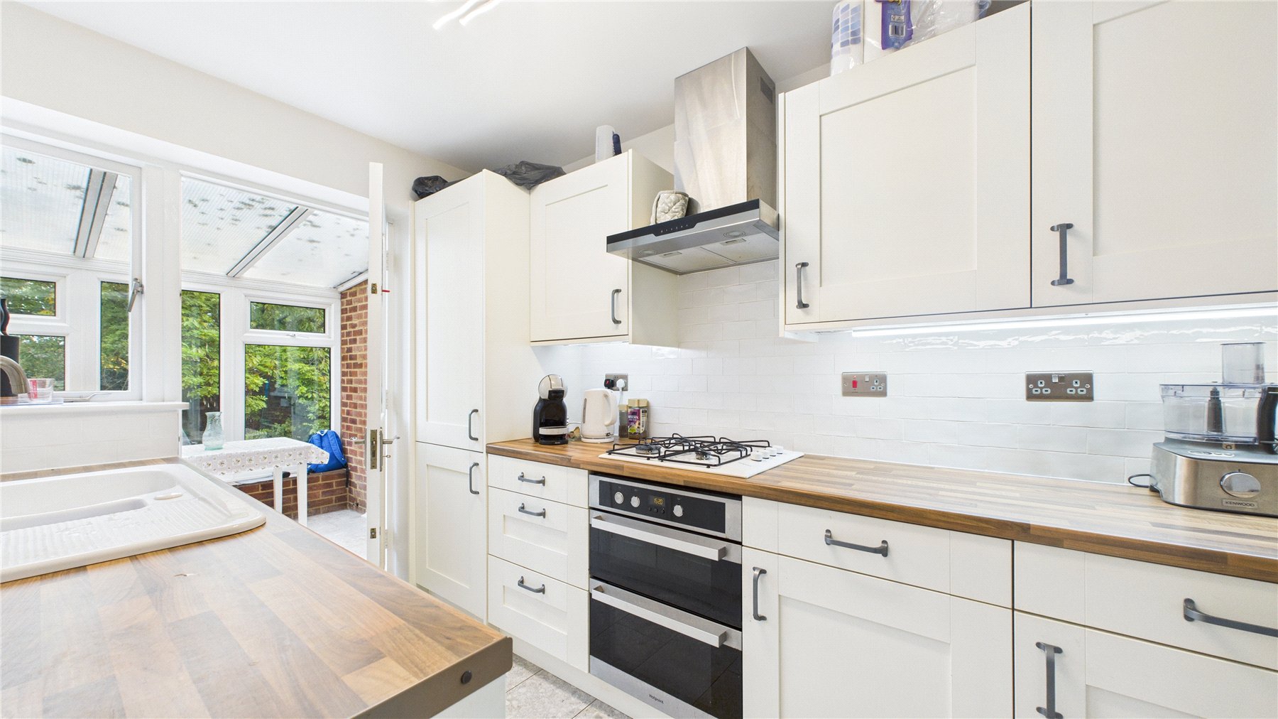 The modern kitchen boasts a range of eye and base level storage, integrated appliances, and direct access to a versatile conservatory that opens to the garden and adjoining garage ideal for storage, a workshop, or potential conversion (STPP).