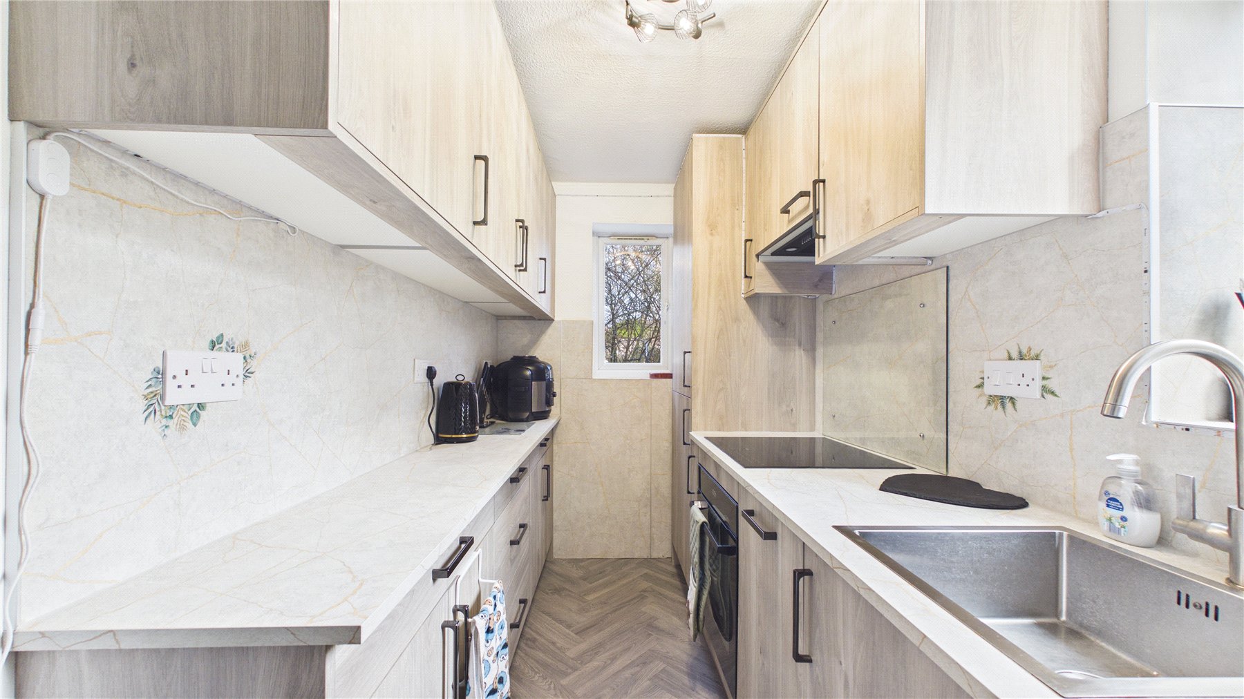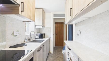 The property benefits from a private entrance with a useful porch area, leading into a bright and well-proportioned living room measuring in excess of 16', providing ample space for both relaxation and dining. Adjacent is a modern galley-style kitchen, fitted with a range of contemporary units, work surfaces, and integrated appliances, making efficient use of the space.