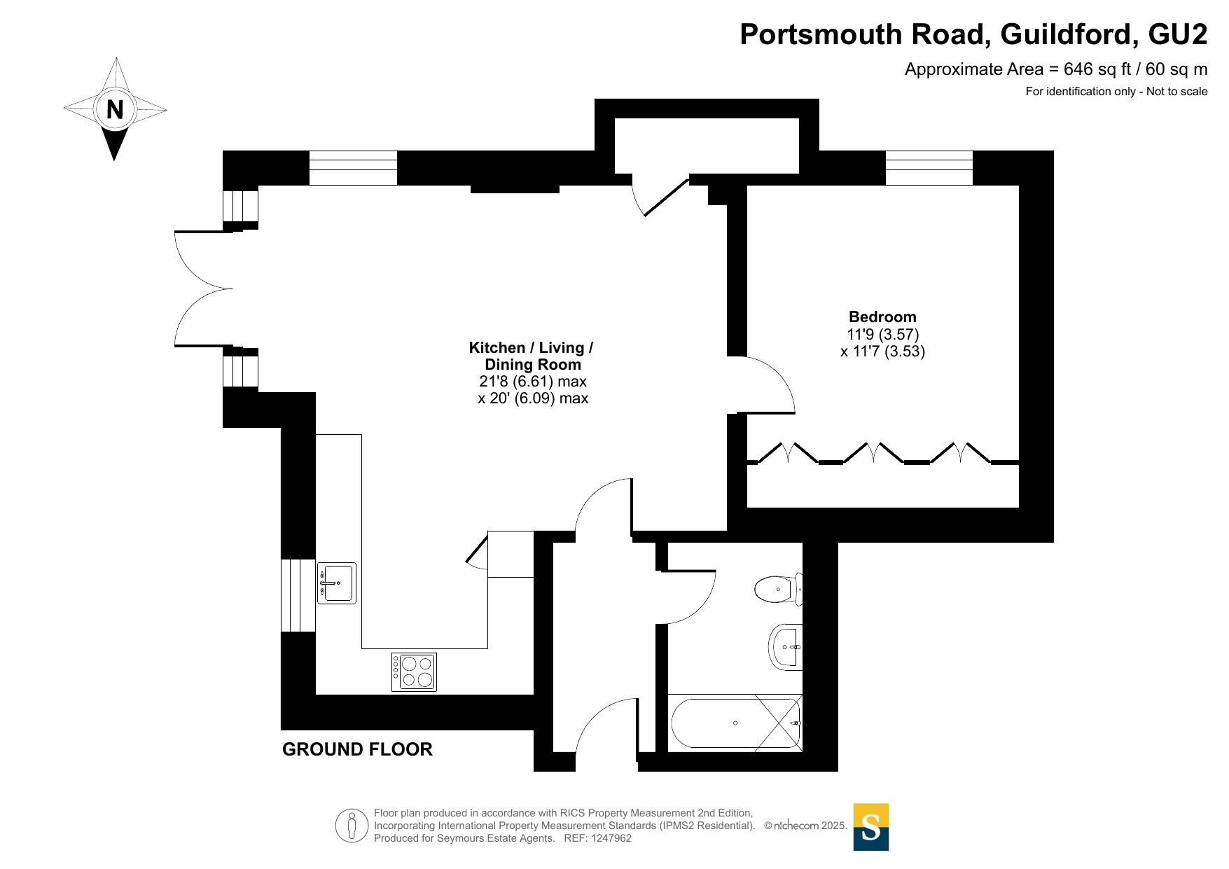 Situated on the ground floor, this apartment offers a perfect blend of character and contemporary living. The spacious reception area and kitchen feature integrated appliances and elegant oak herringbone flooring, complemented by French doors that open onto a private courtyard, flooding the space with natural light. The well-appointed double bedroom includes built-in wardrobes, while the stylish, fully tiled bathroom is fitted with a shower over the bath, a hand basin, and a WC.