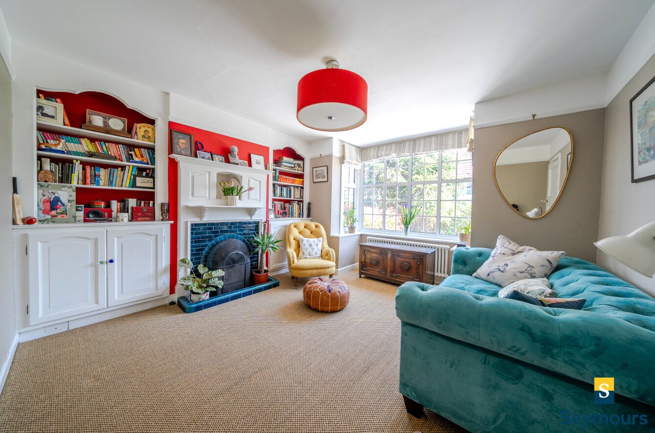 The entrance opens into a welcoming hallway that leads to a bright and spacious living room. This elegant reception space benefits from a bay window that fills the room with natural light and showcases the home's traditional character, while providing a cosy area ideal for relaxation and entertaining. The room also features bespoke fitted shelving and an attractive fireplace, further enhancing its charm.