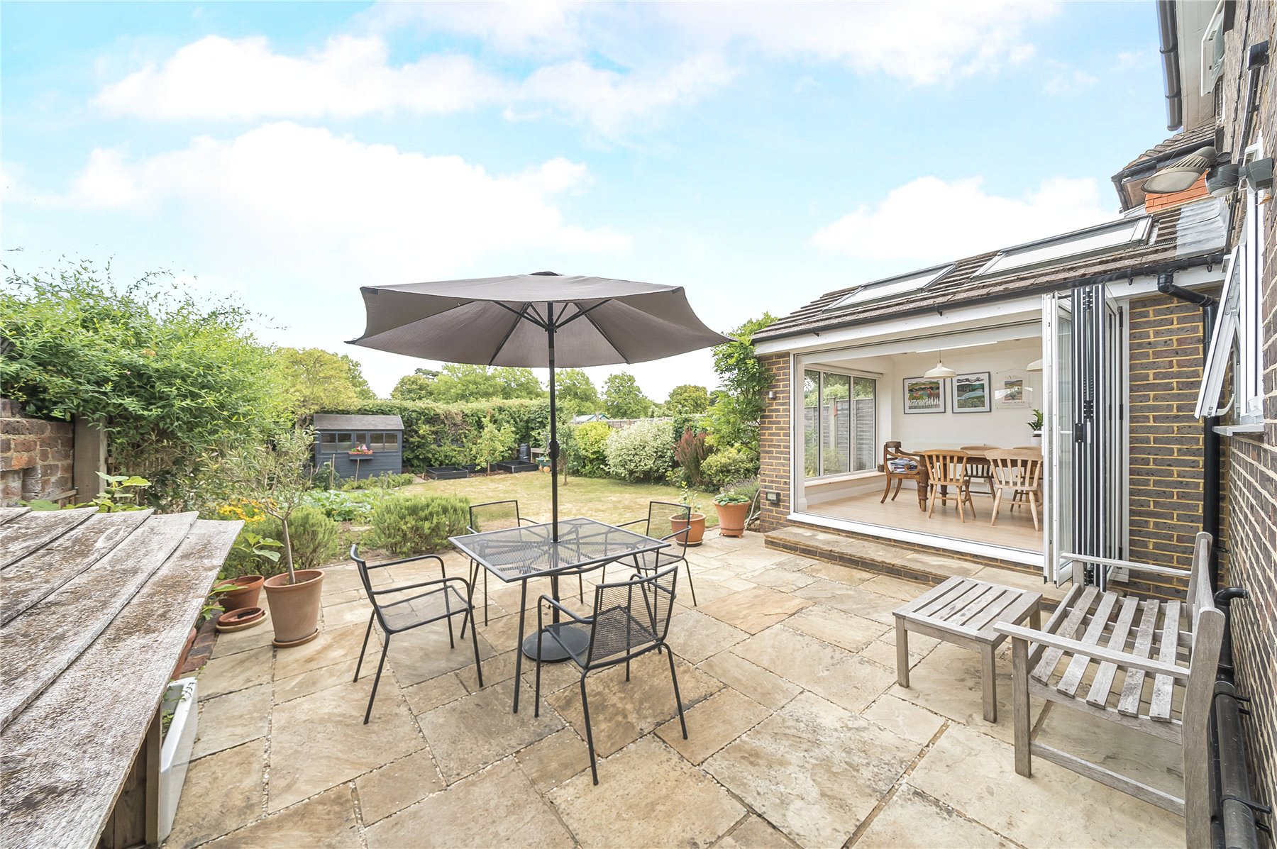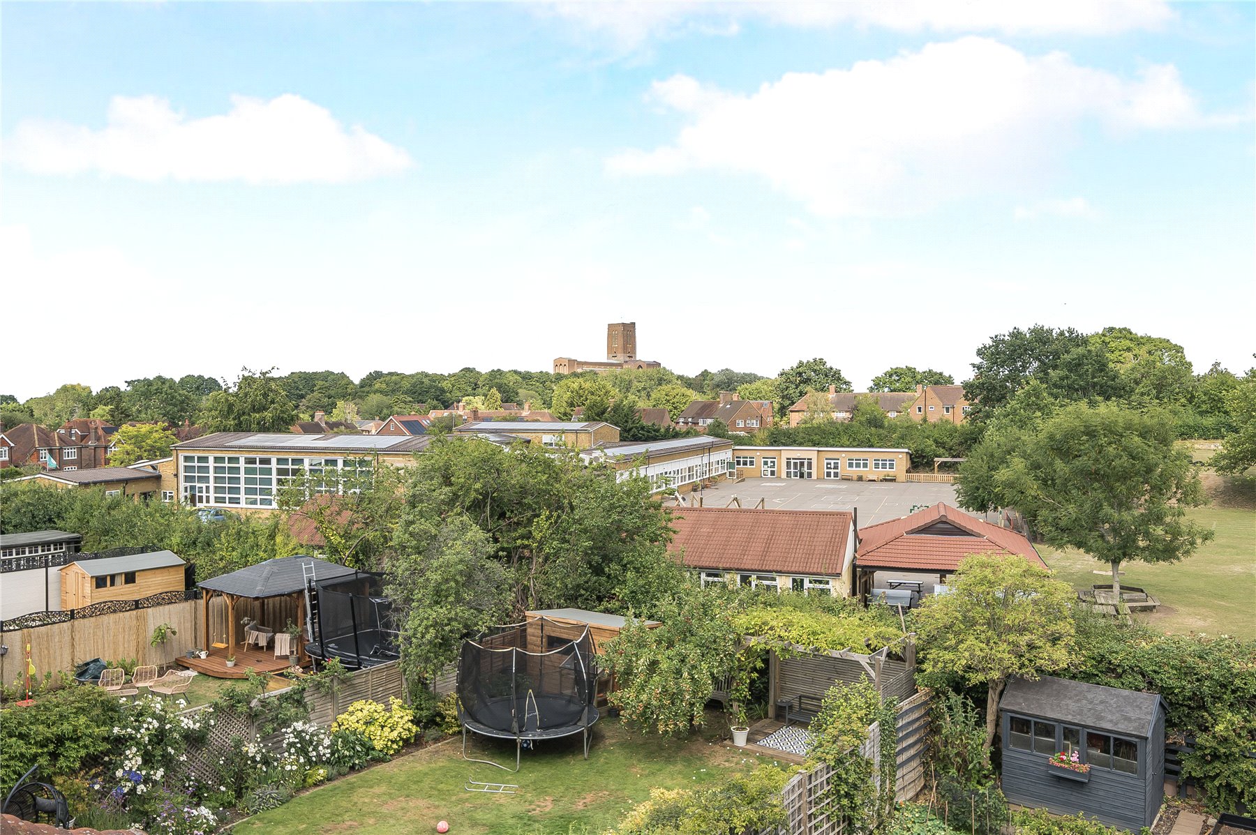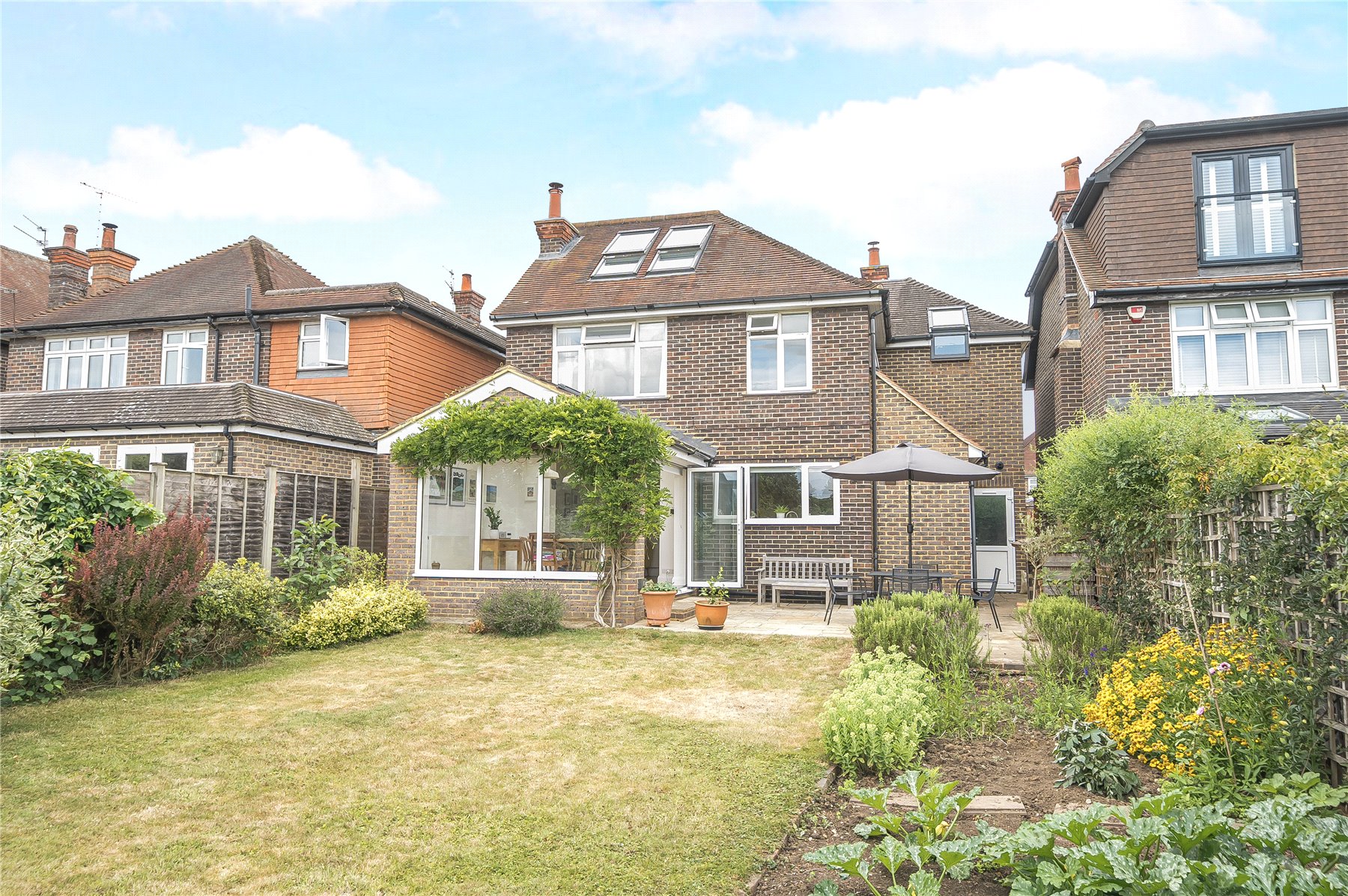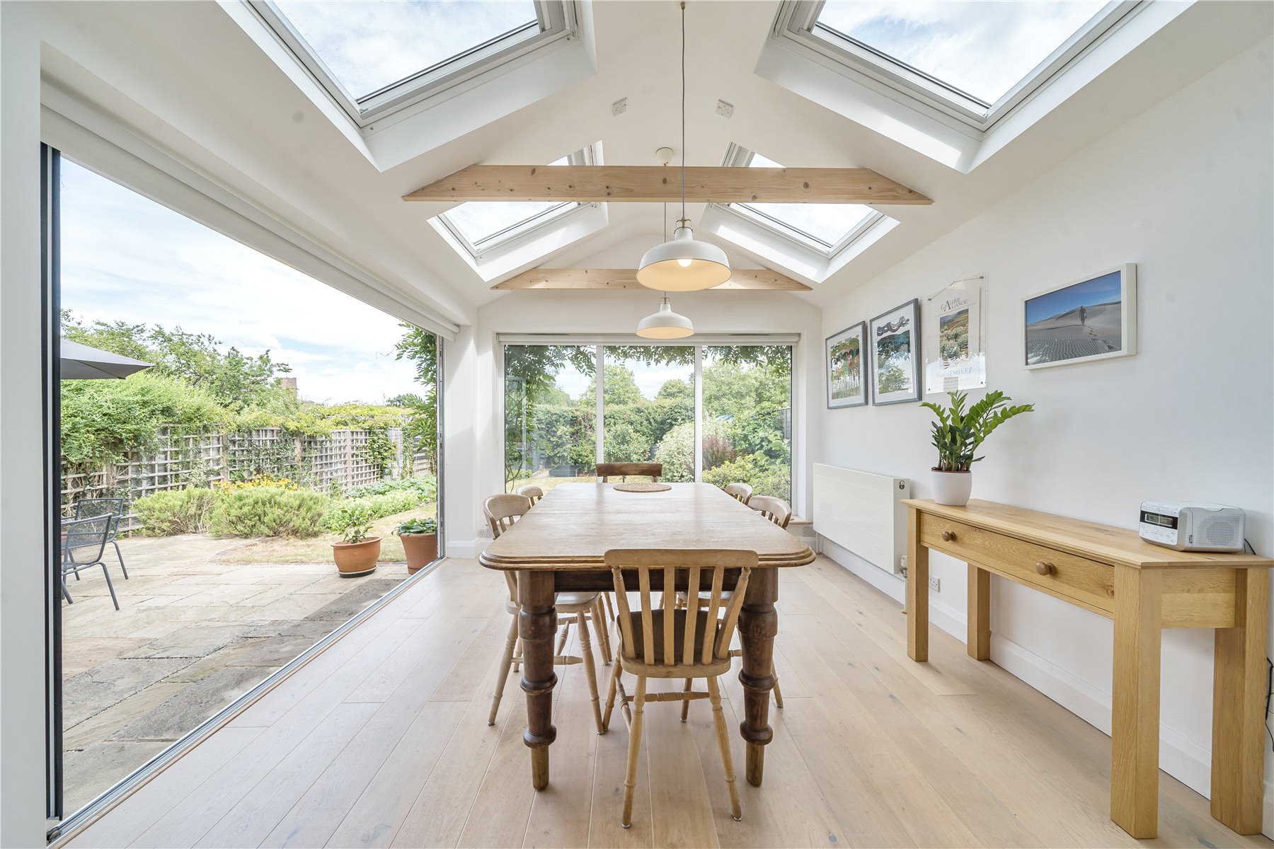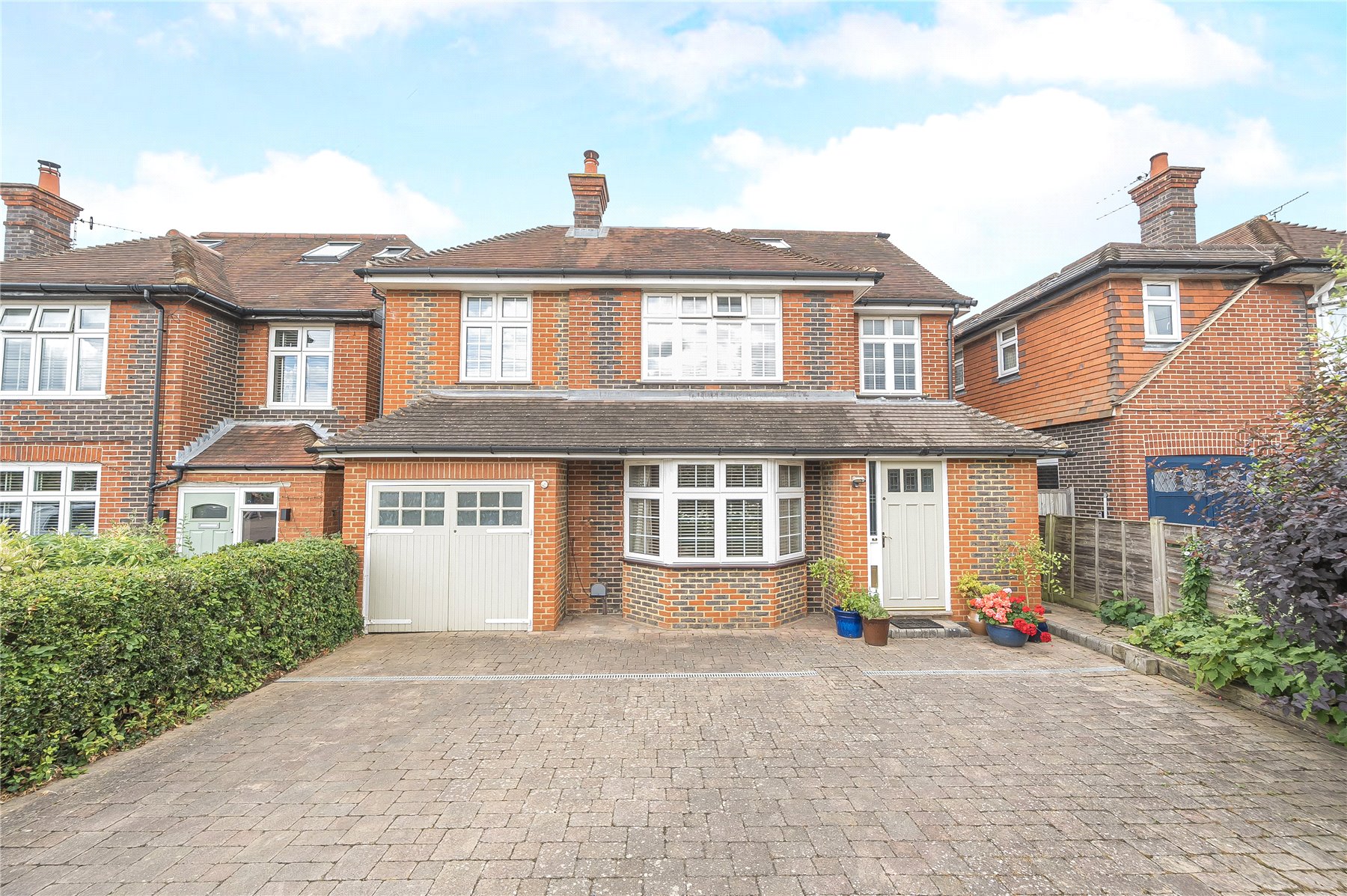 The ground floor features a welcoming entrance hallway leading into a generously sized living room with a bay window and log burner, providing a cosy yet refined space for relaxation. To the rear, the extended kitchen and dining area is a real showstopper, with skylights and bifold doors flooding the space with natural light and seamlessly connecting the indoors with the patio and garden beyond. The kitchen is thoughtfully fitted with high-end appliances and ample cabinetry, centred around a stylish island with open shelving.Upstairs, the first floor offers four beautifully finished bedrooms, each with a bright and airy feel. A contemporary family bathroom and a separate modern shower room ensure comfort and practicality for everyday family life. The second floor, formed through a loft conversion, provides a further spacious bedroom complete with its own en suite shower room and generous eaves storage, ideal as a guest suite, teen retreat, or versatile additional space. Every bathroom throughout the home is immaculately presented, with sleek white tiling and quality fittings that enhance the clean and sophisticated style.Externally, the property is equally appealing, with a charming red-brick facade, off-street parking, and an integral garage. The rear garden is a standout feature, landscaped for ease of maintenance with established borders, raised beds, and both lawn and patio areas ideal for outdoor entertaining. Backing onto the green, the setting offers a tranquil outlook while remaining conveniently close to Guildford's extensive amenities, excellent schooling, and transport links.