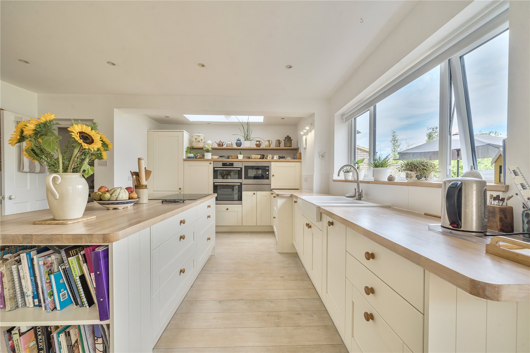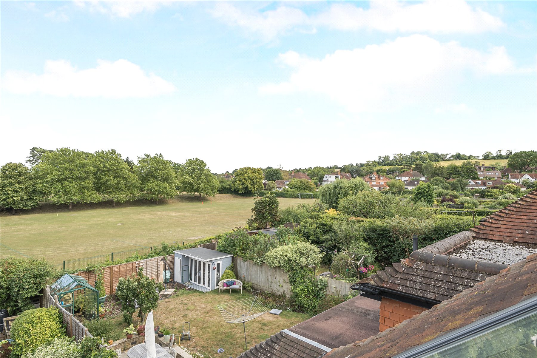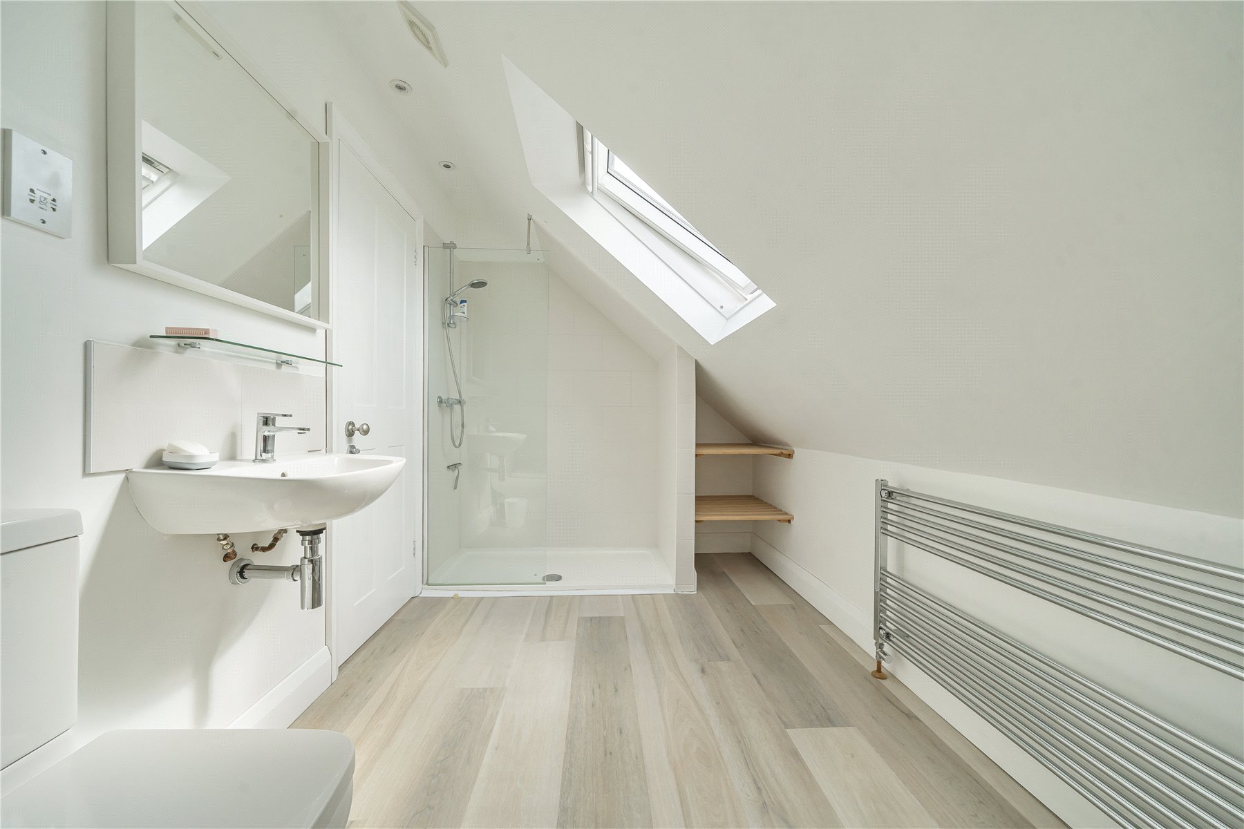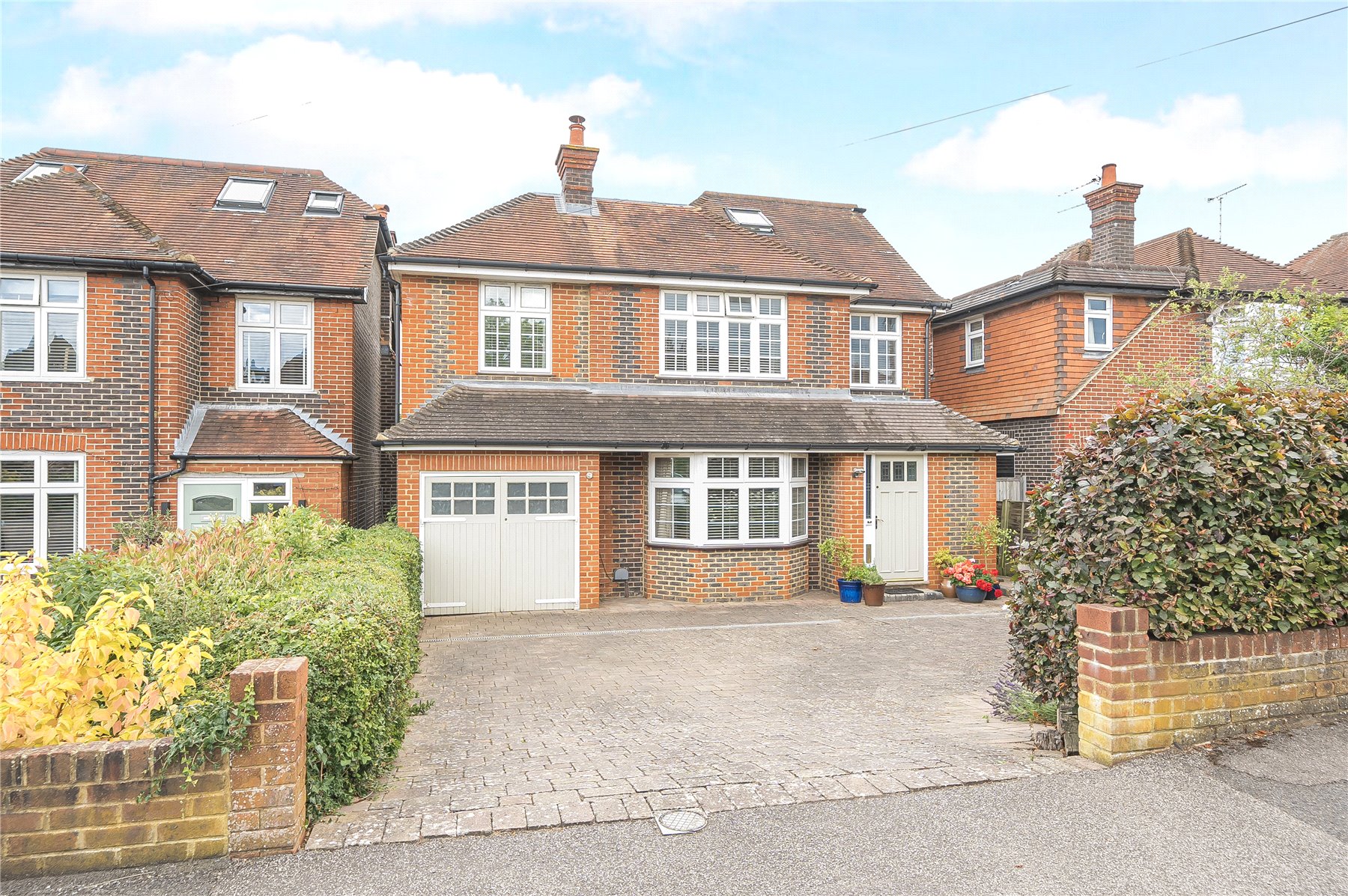 The ground floor features a welcoming entrance hallway leading into a generously sized living room with a bay window and log burner, providing a cosy yet refined space for relaxation. To the rear, the extended kitchen and dining area is a real showstopper, with skylights and bifold doors flooding the space with natural light and seamlessly connecting the indoors with the patio and garden beyond. The kitchen is thoughtfully fitted with high-end appliances and ample cabinetry, centred around a stylish island with open shelving.Upstairs, the first floor offers four beautifully finished bedrooms, each with a bright and airy feel. A contemporary family bathroom and a separate modern shower room ensure comfort and practicality for everyday family life. The second floor, formed through a loft conversion, provides a further spacious bedroom complete with its own en suite shower room and generous eaves storage, ideal as a guest suite, teen retreat, or versatile additional space. Every bathroom throughout the home is immaculately presented, with sleek white tiling and quality fittings that enhance the clean and sophisticated style.Externally, the property is equally appealing, with a charming red-brick facade, off-street parking, and an integral garage. The rear garden is a standout feature, landscaped for ease of maintenance with established borders, raised beds, and both lawn and patio areas ideal for outdoor entertaining. Backing onto the green, the setting offers a tranquil outlook while remaining conveniently close to Guildford's extensive amenities, excellent schooling, and transport links.
