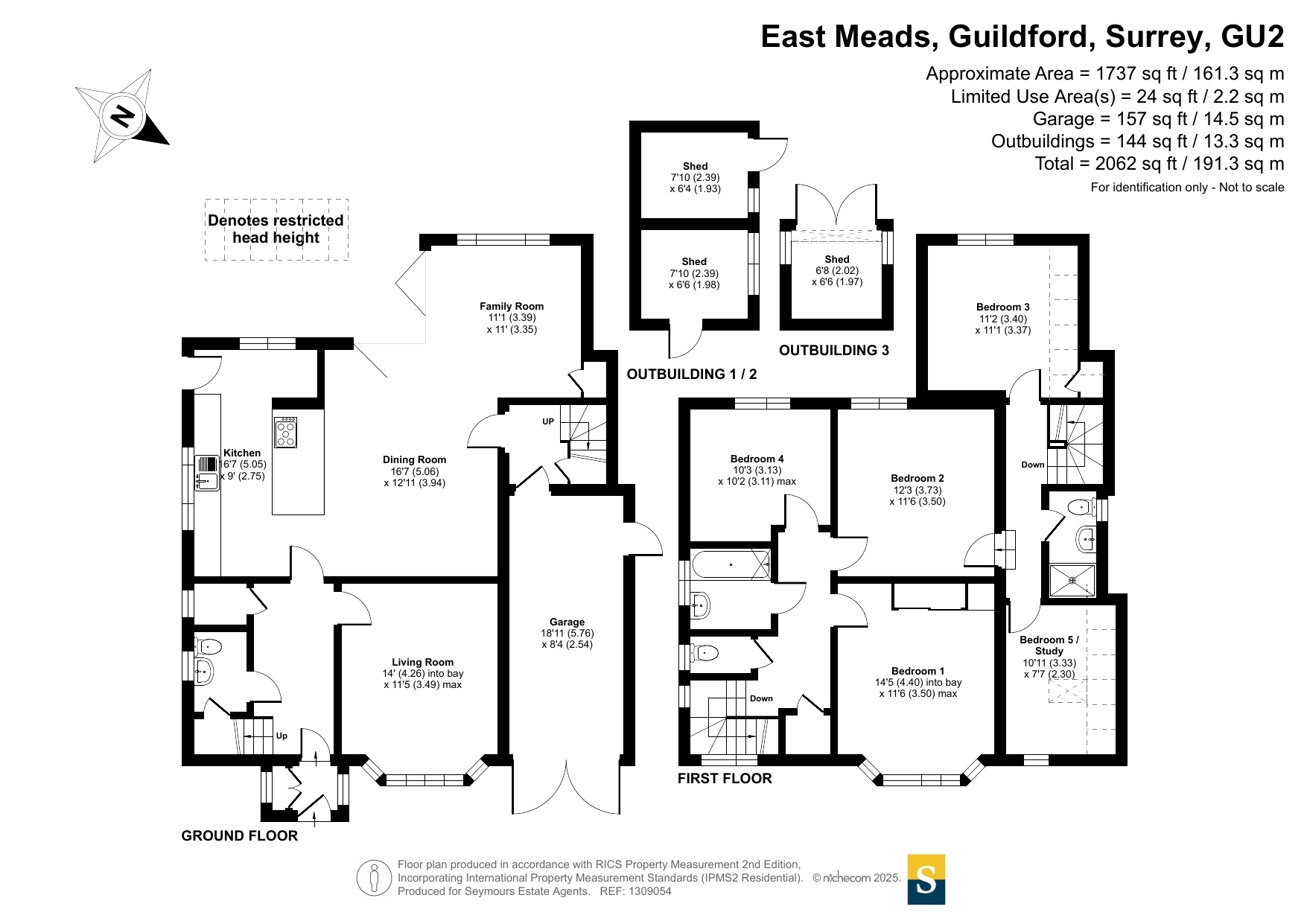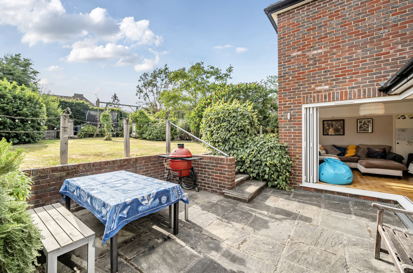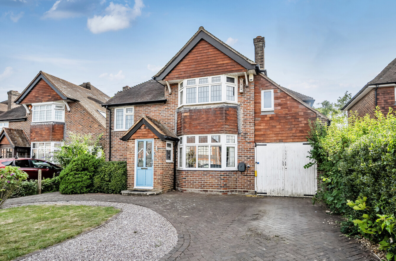 This is a beautifully presented and extended detached family home, within a short distance to Onslow Village, Queen Elenor's and Guildford County schools., Guildford. Just 0.75 miles from the mainline train station and the town centre, it offers the perfect balance of tranquillity and convenience. The house exudes charm and character from the outset with a classic red-brick facade, a pitched tiled roof, and an inviting porch entrance framed by well-maintained greenery and a neatly paved driveway offering ample off-street parking.Internally, the property showcases a harmonious blend of contemporary style and traditional elements. The heart of the home lies in its expansive open-plan kitchen and dining area, featuring a sleek modern design, abundant natural light, and direct access to the rear garden through wide bi-fold doors. This seamless indoor-outdoor connection creates an ideal setting for entertaining or family living. Adjacent to the dining space is a cosy family room with garden views, and a generous living room at the front of the property benefits from a charming bay window.Upstairs, the home comprises five well-sized bedrooms, including a principal bedroom with bay window and three further spacious doubles, all finished to a high standard. A stylish modern family bathroom and an additional shower room provide excellent convenience for busy households. The layout is practical and well-considered, catering to the needs of a growing family or those seeking flexible home-working space.Externally, the property boasts a delightful rear garden with a paved terrace for al fresco dining and a large lawn area enclosed by mature shrubs and trees for privacy. Additional features include a garage and useful outbuildings, offering extra storage or potential for workshop use. This exceptional home combines location, style and space in a setting perfect for family life.