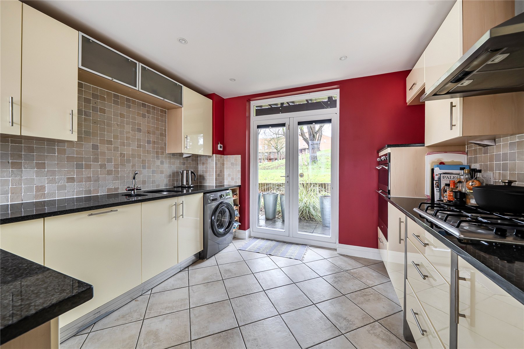 This stylish town house in Queen Elizabeth Park blends contemporary design with impressive internal space and thoughtful layout. Built in 2004 by Linden Homes, it feels bright and modern from the moment you step inside, and benefits from a spectacular double-height conservatory, a private garage and a balcony overlooking the green.The ground floor is largely open plan, creating an inviting flow between the kitchen and the living/dining space. The living room, finished in a bold red with laminate flooring, feels both warm and spacious. The tall conservatory fills the room with natural light, while a mezzanine above enhances the sense of height and openness. The kitchen combines sleek cream cabinetry with tiled finishes and black quartz countertops for a clean, contemporary look. A handy WC completes this level.The first floor offers great flexibility, with three rooms arranged around the landing, ideal as two bedrooms plus a study, or as three bedrooms depending on need, together with a family bathroom. The palette of white walls and red carpets continues throughout, creating a cohesive aesthetic. One of the bedrooms enjoys a fitted wardrobe and opens onto a balcony with a pleasant outlook over the green.The top floor is dedicated to the substantial master bedroom with ensuite bathroom. There are ample fitted wardrobes with additional eaves storage and an airing cupboardOutside, the rear garden offers a low-maintenance yet attractive setting. A paved patio provides space for outdoor seating and entertaining, while sleeper-edged raised beds bring shape and planting interest to the space. There is an outdoor tap and electricity.