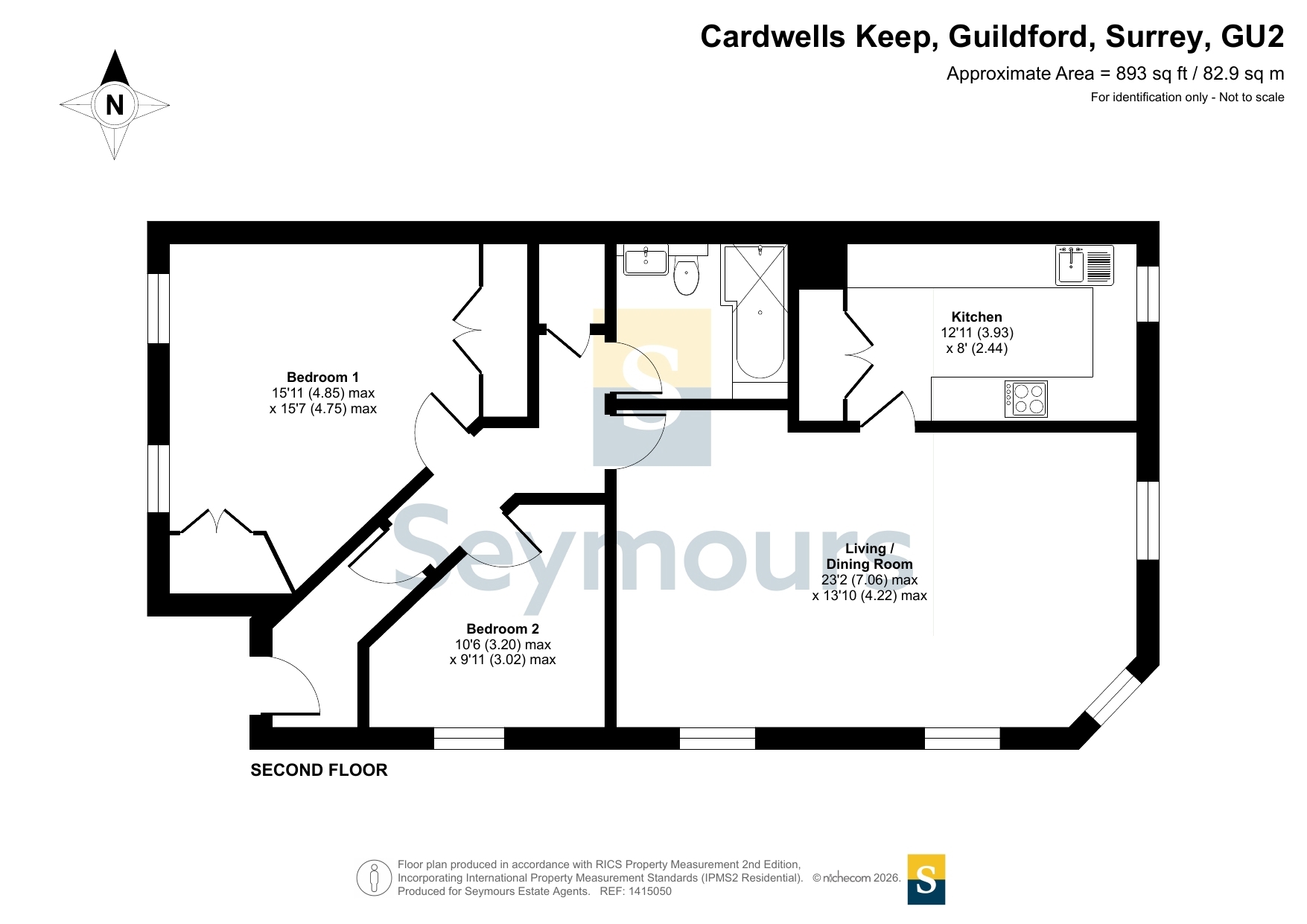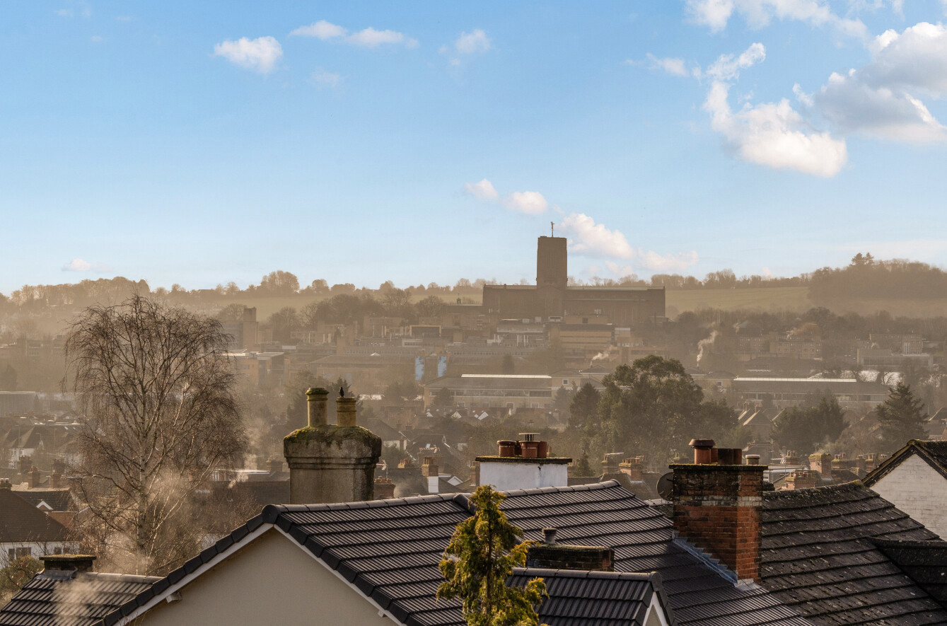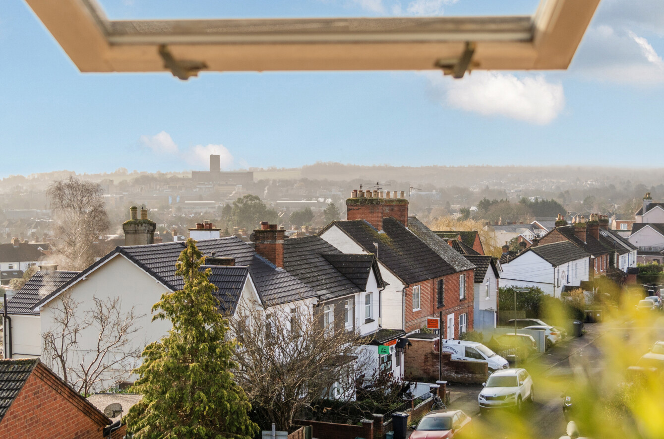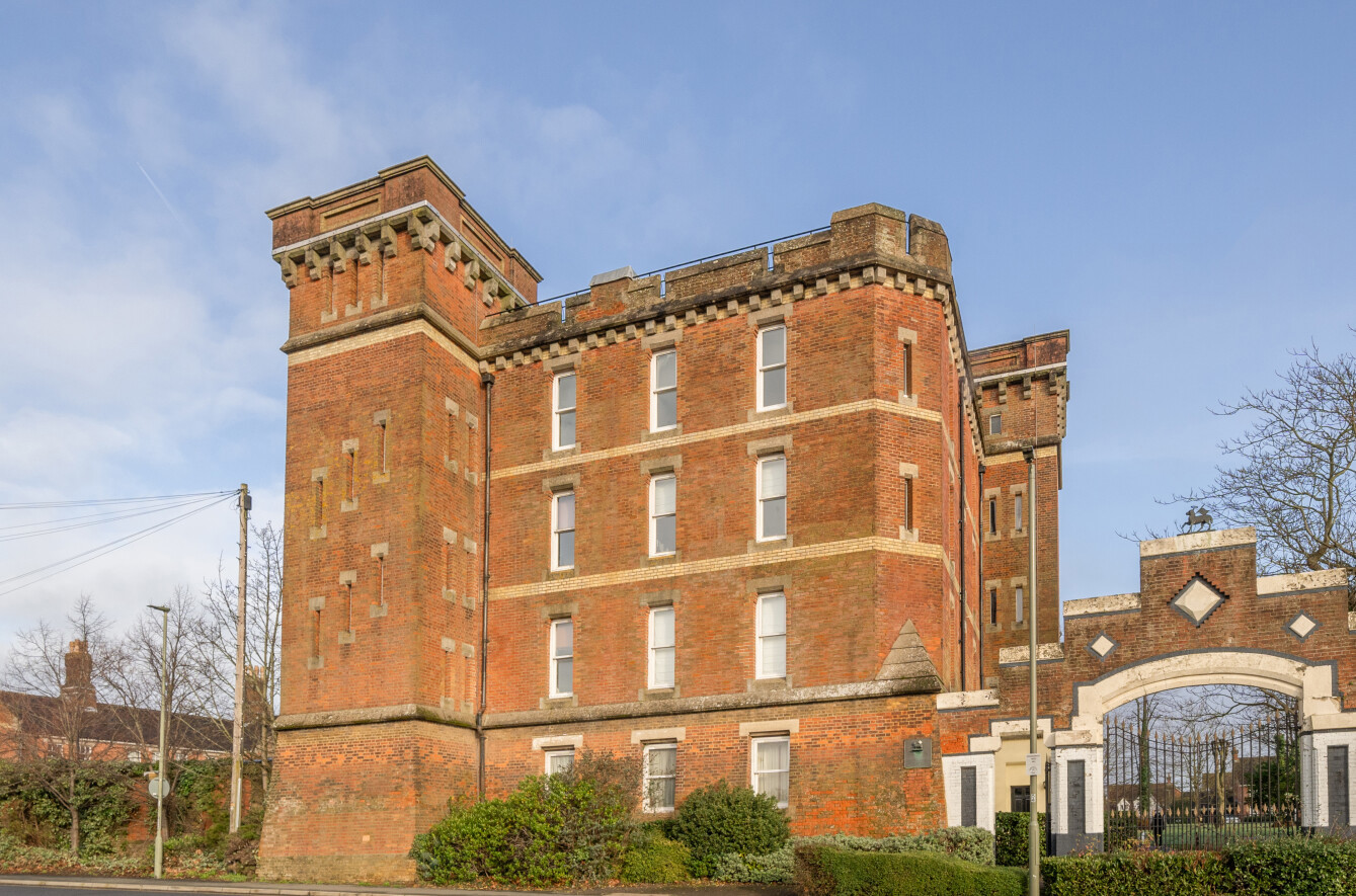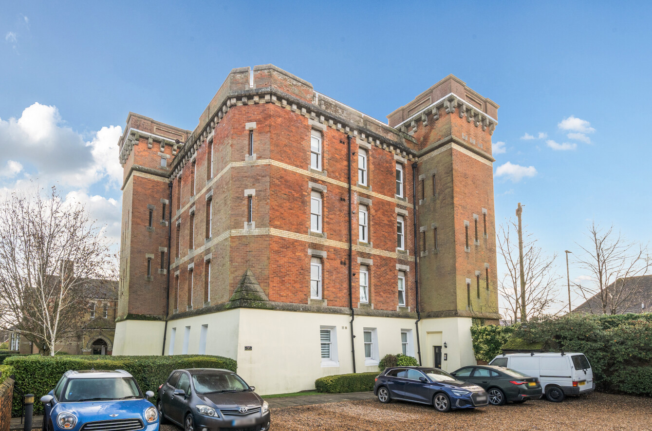 Set within the striking and characterful Cardwells Keep, this impressive apartment offers beautifully presented accommodation arranged on the upper level, enjoying an elevated position with far-reaching views across Guildford and beyond. The building itself is instantly recognisable, with its distinctive red brick elevations and turreted design, creating a real landmark home that combines period charm with modern living. Access is via a secure entry phone system, offering both privacy and peace of mind.The apartment is accessed through a well-maintained communal entrance and opens into a central hallway which leads through to a generous open plan living and dining room. This is a fantastic everyday space, filled with natural light from multiple windows and offering plenty of room for both relaxing and entertaining, while making the most of the outlook across the town. The kitchen is set separately and provides a practical and well-planned layout with ample storage and preparation space.There are two bedrooms, both well-proportioned and offering flexible use, whether as a main bedroom, guest room or home office. The main bedroom benefits from a bright aspect, while the second bedroom provides an ideal additional sleeping space or study. The accommodation is completed by a stylish and contemporary bathroom, finished to a high standard with sleek fittings and a modern suite, giving the apartment a luxurious feel.Outside, The Keep is surrounded by beautifully maintained gardens, enclosed by wrought iron railings, and overlooks the park-like grounds of Cardwells Keep, adding to the appeal and historic charm of this unique residence. The property further benefits from residential parking, providing added convenience for day-to-day living.Cardwells Keep is situated in a popular residential area of Guildford, well positioned for access to local amenities, schools and transport links. Guildford offers an excellent range of shops, restaurants and cafes, as well as a lively cultural scene and easy access to the Surrey Hills for countryside walks. The area is also well connected by road, with the A3 providing direct links to London and the South Coast.Historically, Cardwells Keep is one of Guildford's most notable buildings, designed in a bold and fortress-like style that reflects the town's rich architectural heritage. Its impressive proportions, decorative brickwork and castellated features give it a timeless presence, and it remains a standout example of Guildford's period architecture. Today, it provides a rare opportunity to enjoy modern apartment living within a building full of history and character.