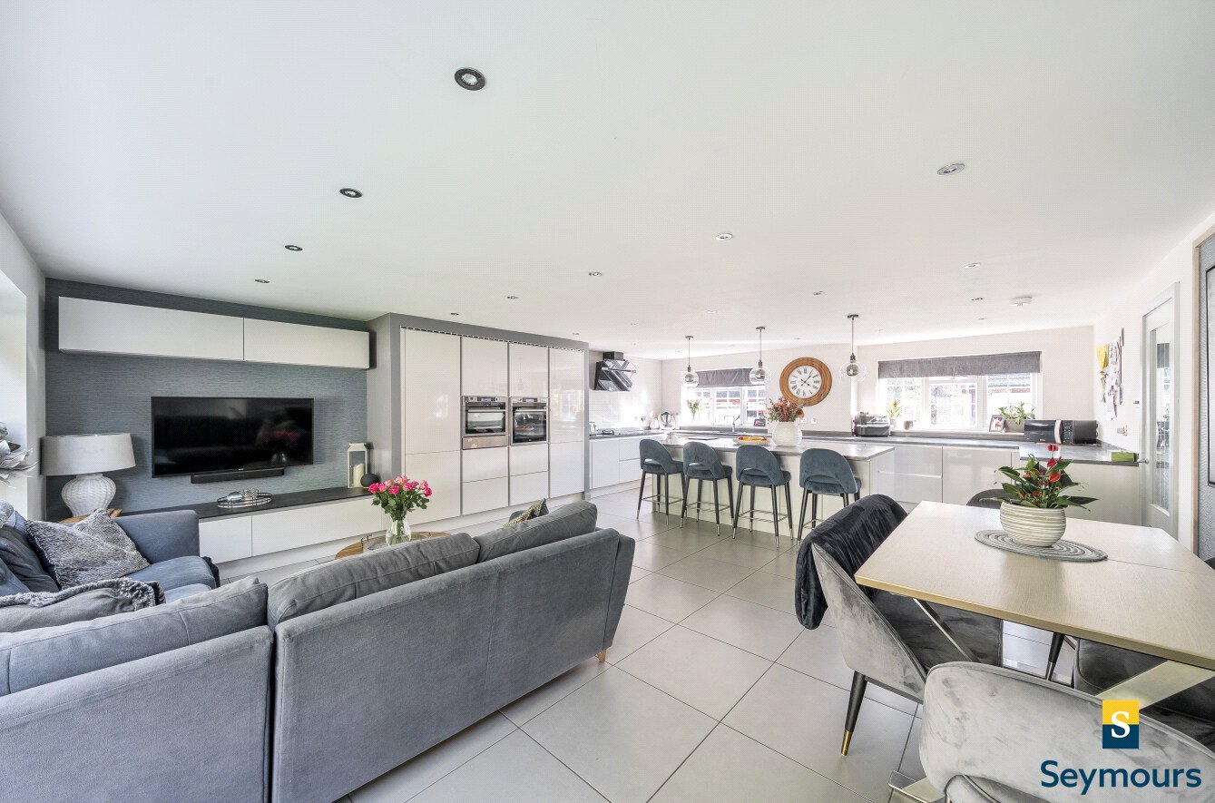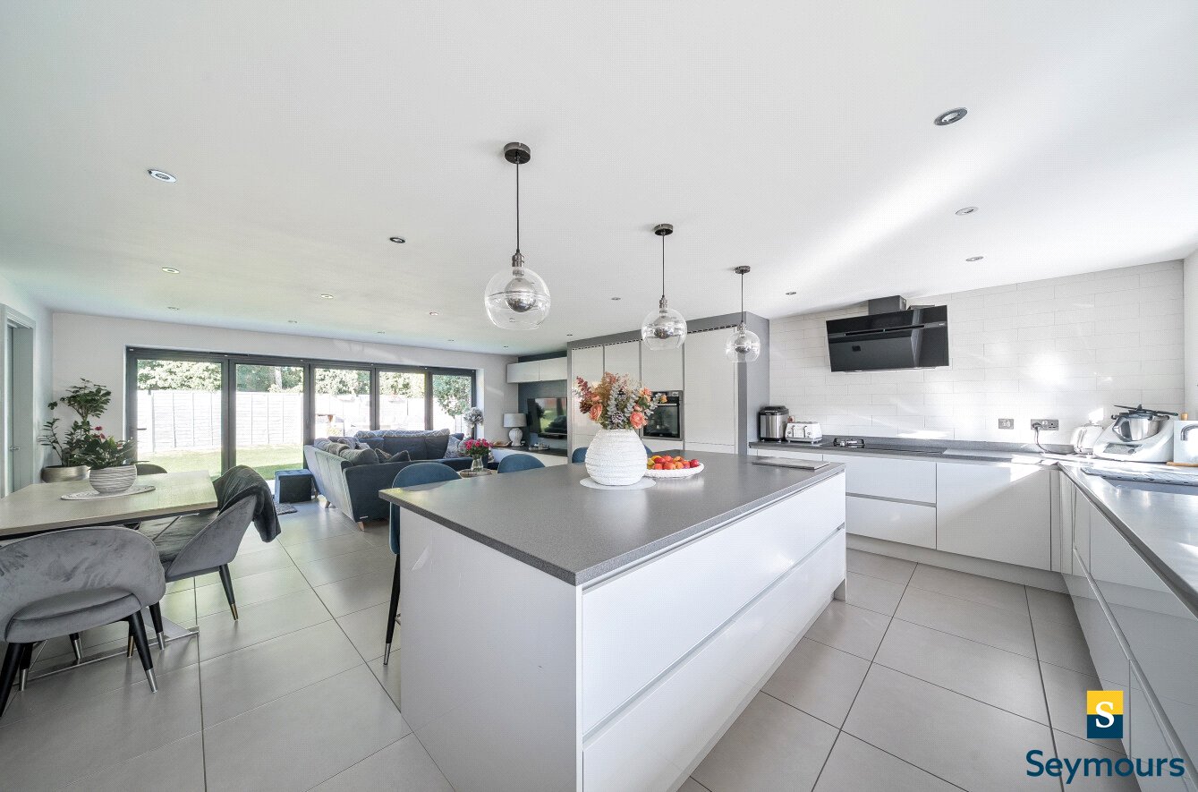 Situated within two miles of Guildford town centre and the mainline railway station, this beautifully presented four-bedroom detached home combines generous living space with a stylish modern finish. Extended and upgraded, the property offers versatile accommodation ideally suited to family life.The ground floor is arranged around a spacious entrance hall leading into a superb open-plan kitchen, dining, and living space. This impressive room forms the heart of the home, featuring a large central island with breakfast bar, extensive fitted cabinetry, and integrated appliances. Expansive glazing with bi-fold doors allows natural light to flood the area and opens directly onto the rear garden, creating a seamless indooroutdoor flow. A further separate lounge provides additional reception space, perfect for more formal entertaining or relaxation. A utility room and downstairs cloakroom add to the practicality of the layout.Upstairs, the property continues to impress with four well-proportioned bedrooms. The principal suite enjoys the benefit of a contemporary en suite shower room, while the remaining three bedrooms are served by a stylish family bathroom with a raised bath and sleek tiling. Each bedroom has been thoughtfully decorated, offering both comfort and flexibility for family needs, with plenty of space for home working or study areas if desired.Externally, the house is approached via a wide paved driveway providing generous off-street parking. The rear garden offers a large lawn, ideal for children to play, alongside a smartly designed seating terrace and decked entertaining area. Mature borders and fencing provide privacy, creating an attractive setting for outdoor living.This modern family home is ideally located for access to Guildford's excellent shopping, dining, and leisure amenities, as well as highly regarded local schools and the mainline station.