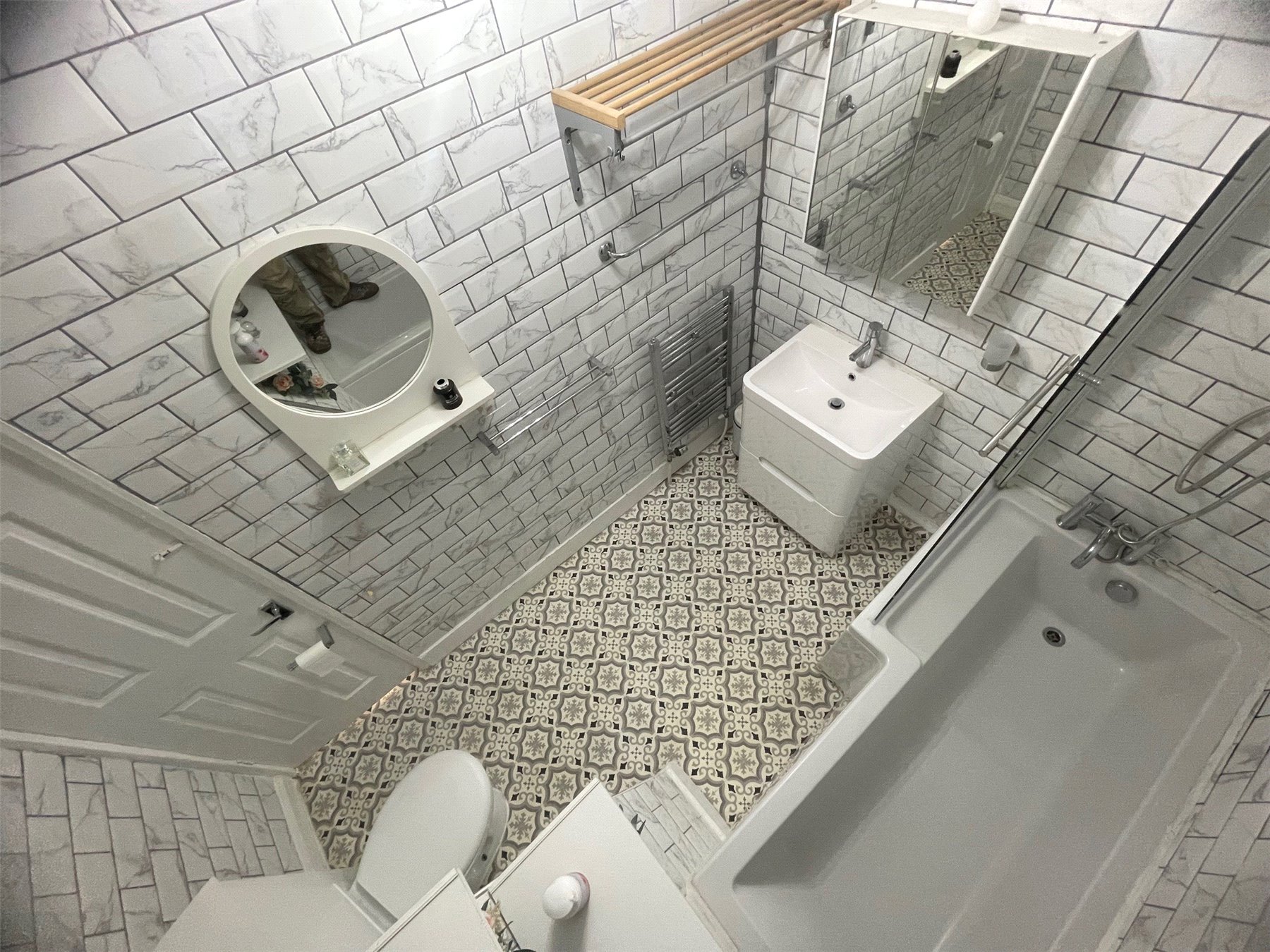 Upstairs, the first floor comprises three bedrooms, all of which are well-proportioned. The primary bedroom is particularly spacious and benefits from wide windows that provide an abundance of light. The remaining two bedrooms offer versatility, whether for family use, guests or home office space. A modern family bathroom completes the upstairs accommodation, fitted with a contemporary suite and finished with stylish tiling and thoughtful shelving under the staircase bulkhead for added practicality and storage.