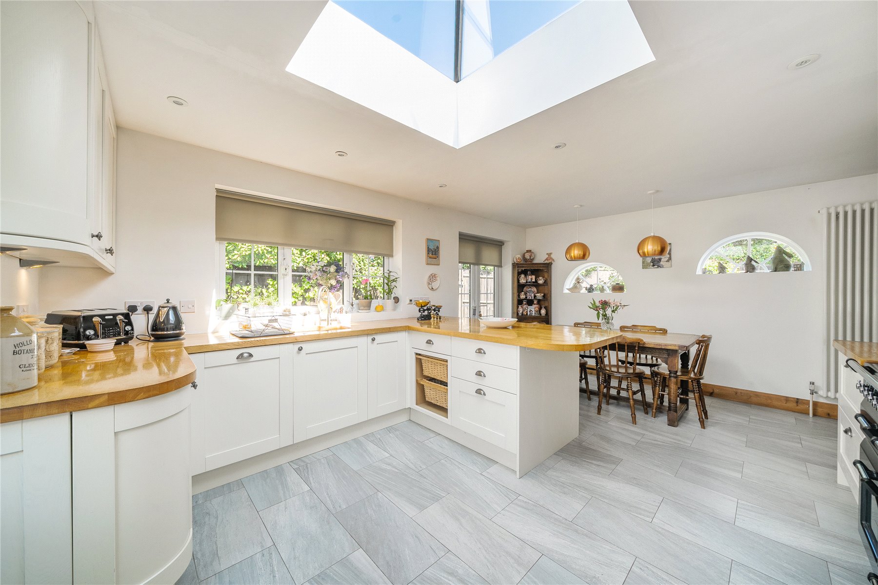 Triple aspect, with doors to the gardens, the kitchen features high quality units with integrated appliances, a breakfast bar and ample space for a good sized table.