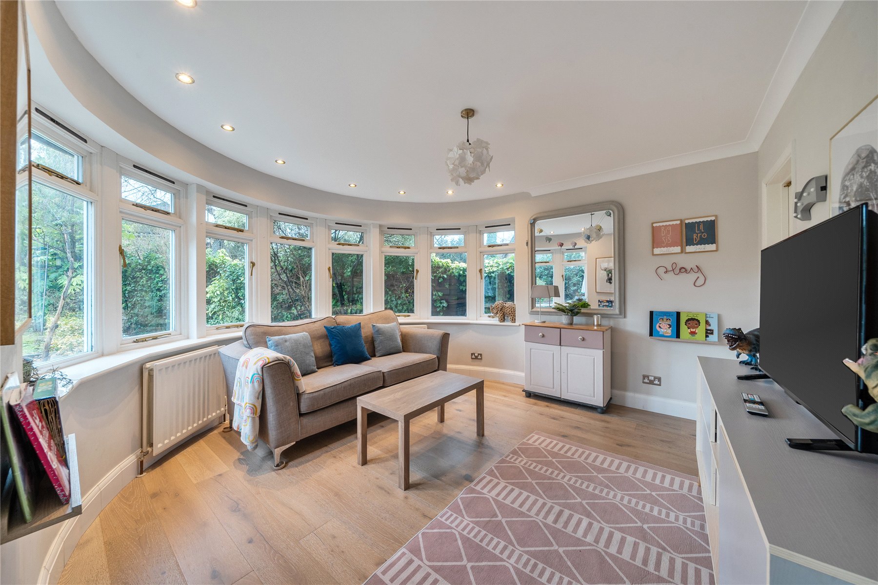 This space leads effortlessly into a bright and airy family room, featuring a distinctive bay design and enjoying pleasant views over the garden, creating the perfect setting to relax and catch up on the day's activities.