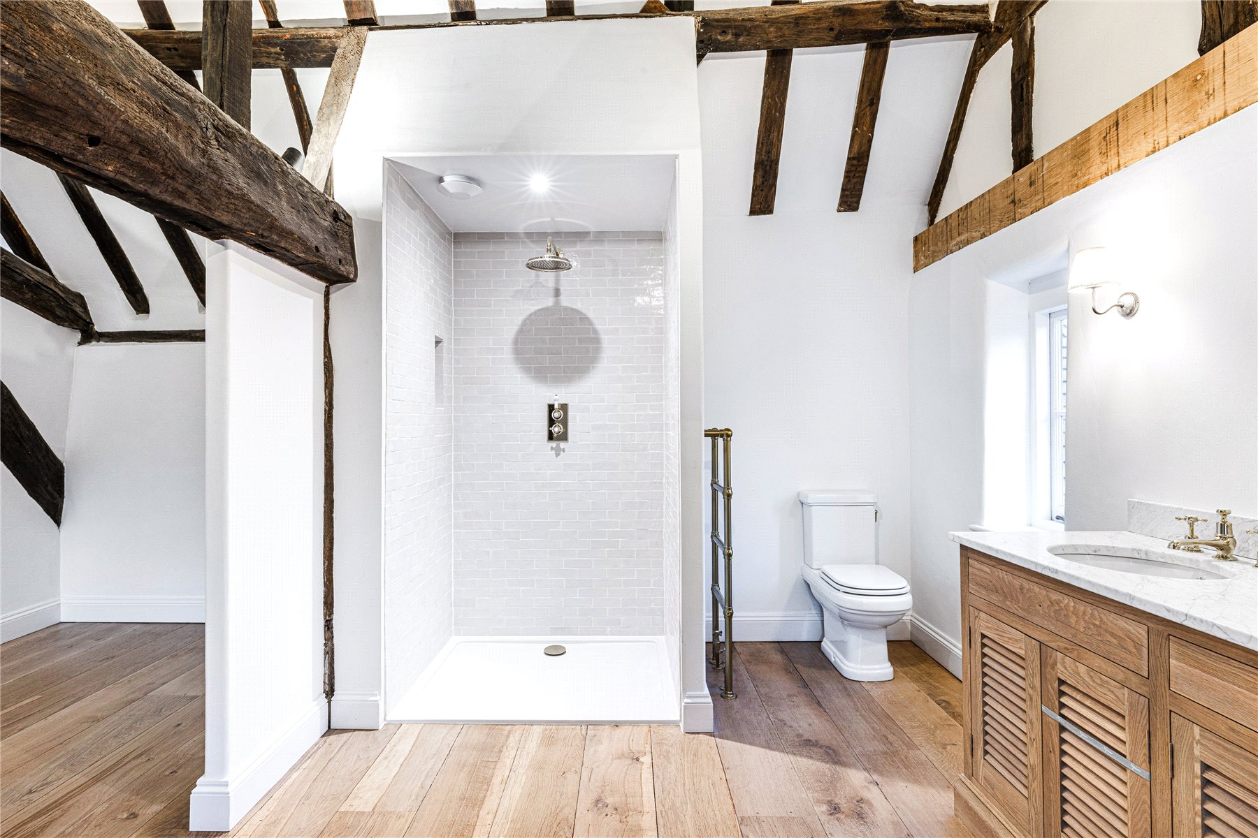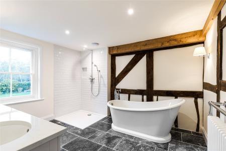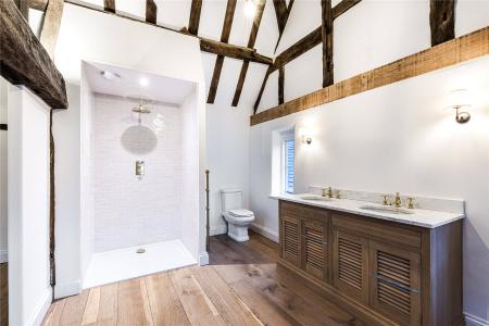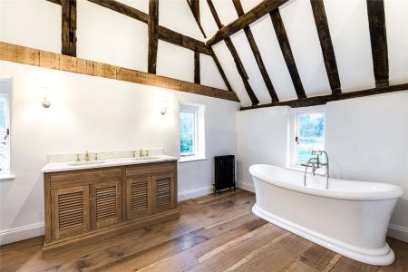 Upstairs an enviable triple aspect principal bedroom suite stretches out beneath the copious beams of a vaulted ceiling that effortlessly engenders a majestically voluminous feel. Sitting peacefully away from the main accommodation, it incorporates a considerable dressing room area and extends down to an en suite that offers 21st century luxury with its waterfall shower and glorious freestanding bathtub.