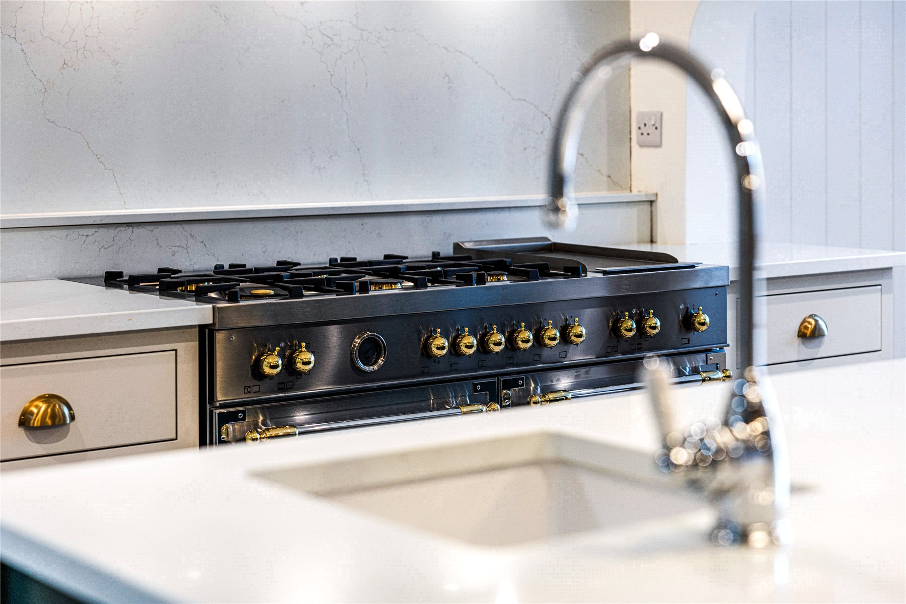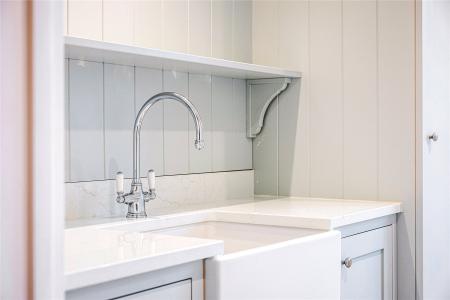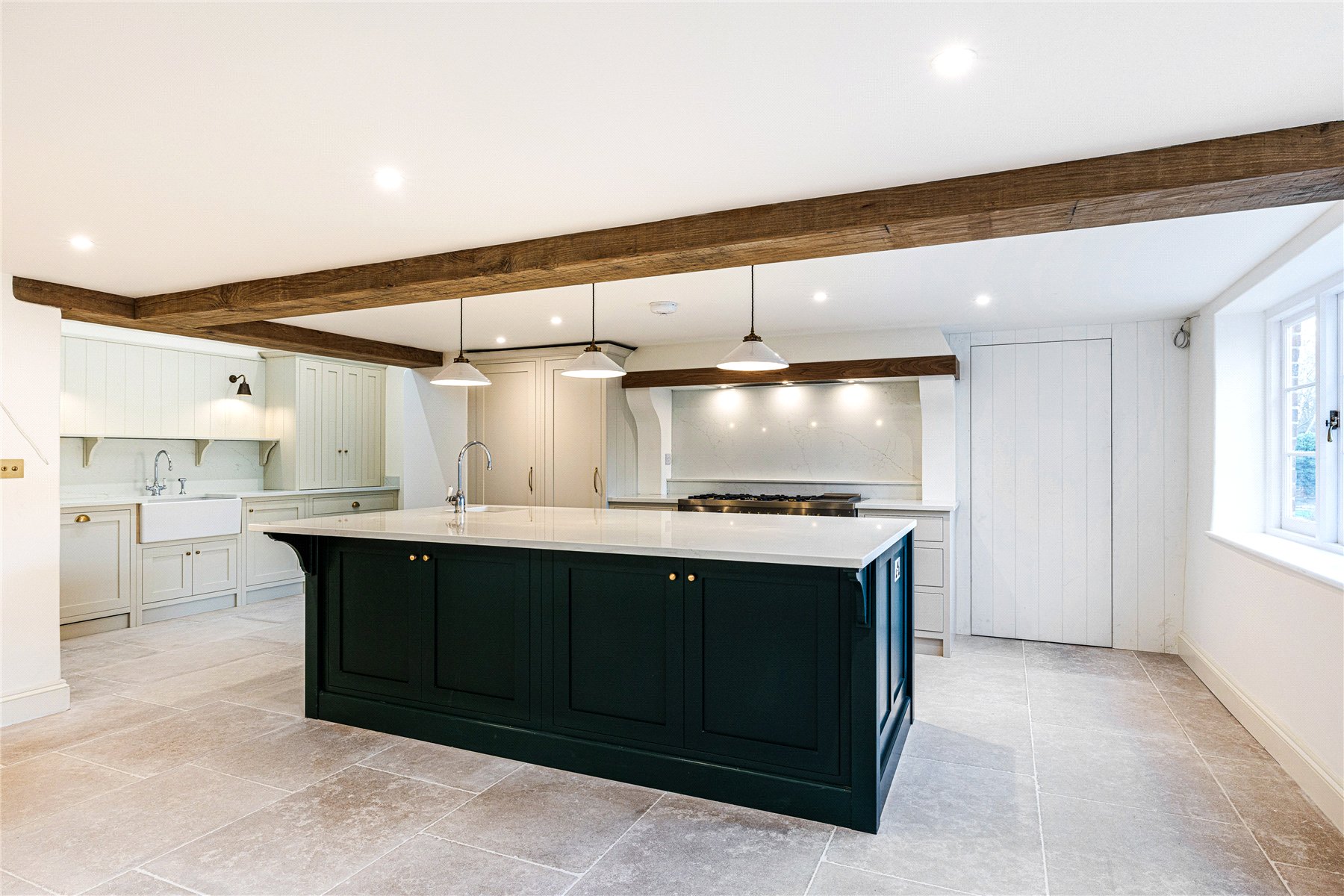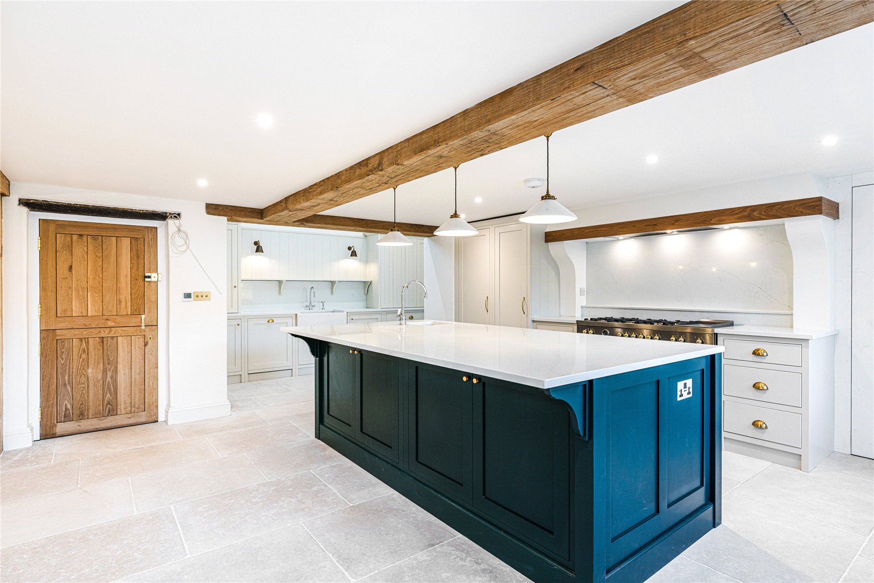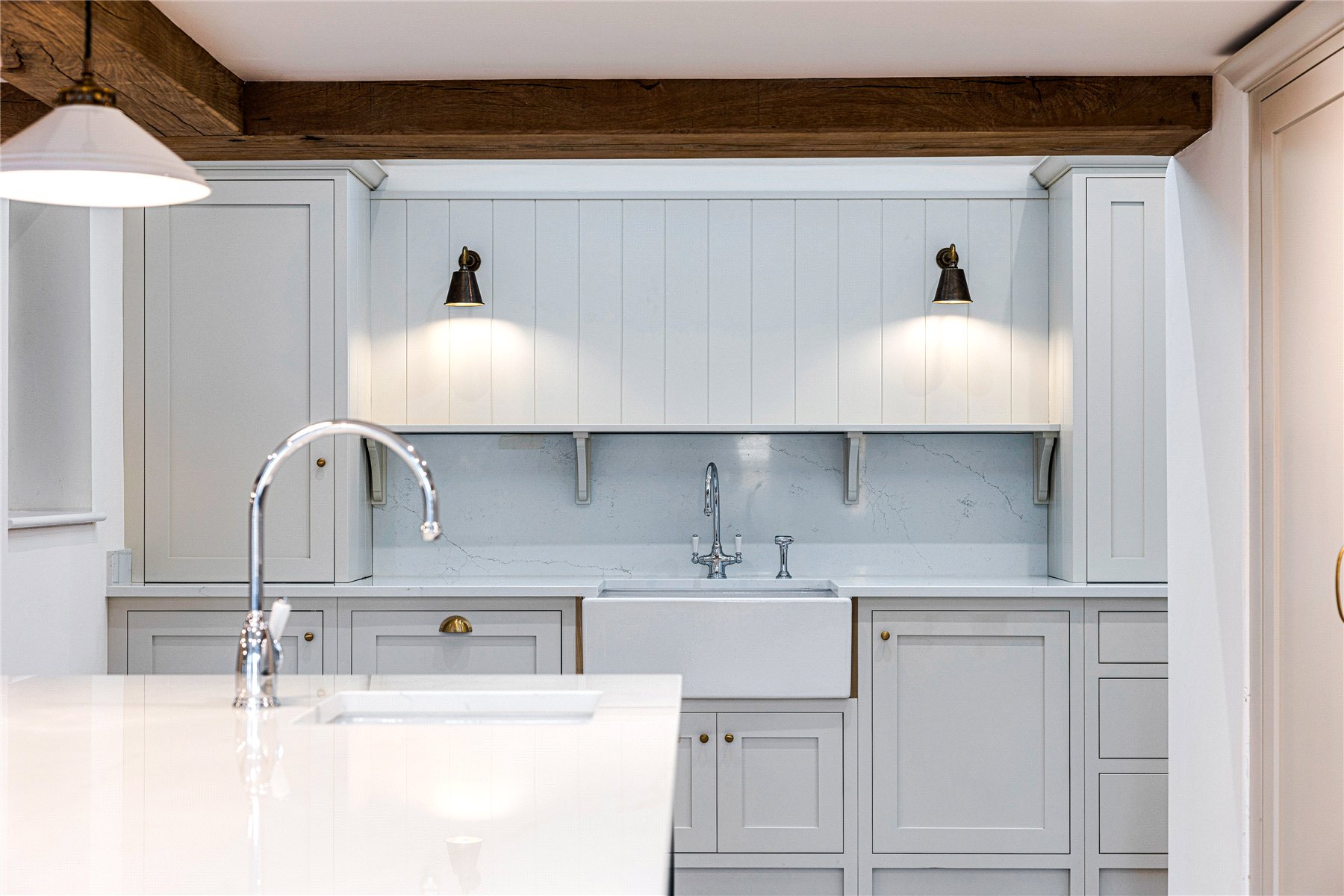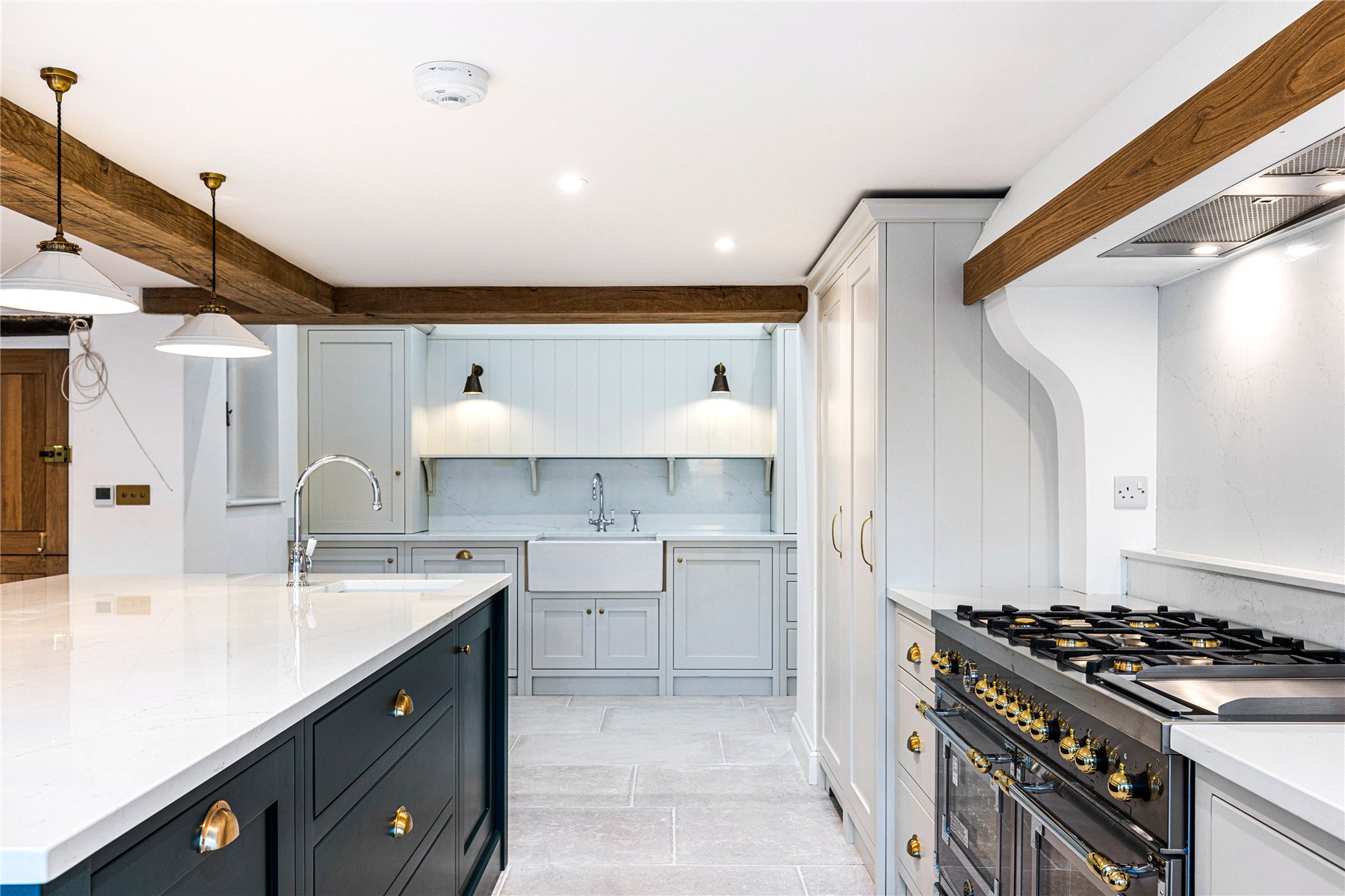 The breathtaking central entrance hall gives all the encouragement you need to explore a hugely fluid wing where a capacious double aspect living room is filled with sunlight from majestically tall bay windows. Behind its tremendous inglenook fireplace the layout extends into the elegantly understated pared-back design of a superior Shaker kitchen/dining room where double aspect doors tempt you out into the walled garden. A range cooker nestles under a classic mantel extractor, beams stretch out overhead and the stone tiled floor has been exquisitely chosen.