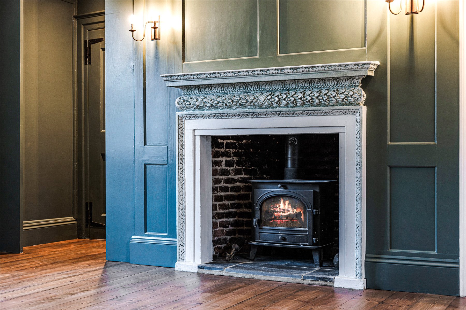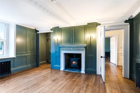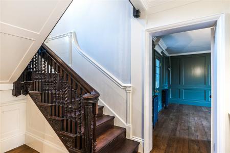 Follow the hallway to the rest of the expansive ground floor and you will find the beautiful carpentry of an original dog leg staircase with open string twisted balustrades and a swept handrail. Two further reception rooms sit side by side colour drenched in inspired heritage hues that together with the accomplished wall panelling, conjure discerning places in which to relax and entertain. One has the graceful simplicity of its cornicing and fireplace, while the other has the intricate detailing of architraves and those that extend above the surround of a fireplace that has the glow of a wood burner.
