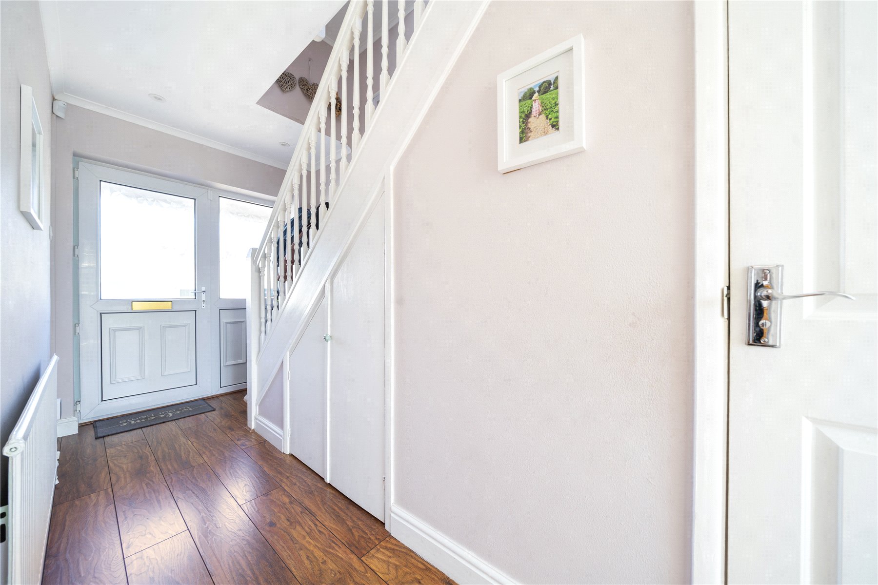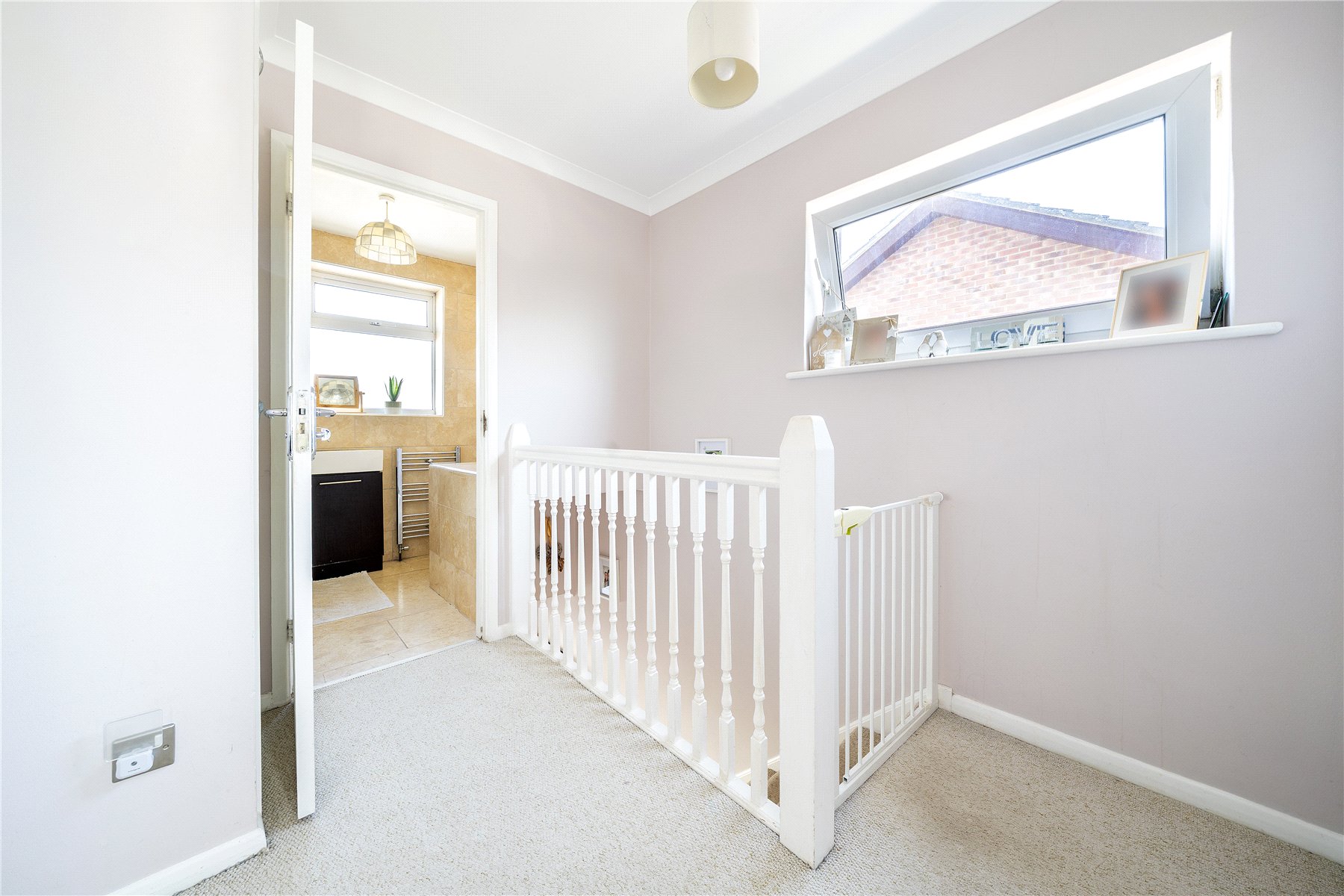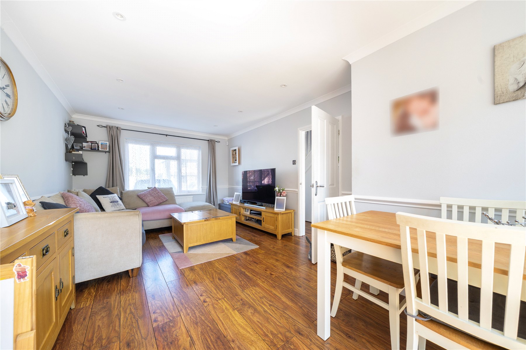 The property is offered to the market in excellent condition, having been well maintained by the current owners. The ground floor accommodation includes a bright and airy front-to-back lounge with double doors that open onto the garden, allowing for plenty of natural light. To the rear is a stylish kitchen, fitted with a range of high-gloss base and eye-level units, an integrated oven, and a four-ring gas hob. A downstairs cloakroom completes the ground floor.