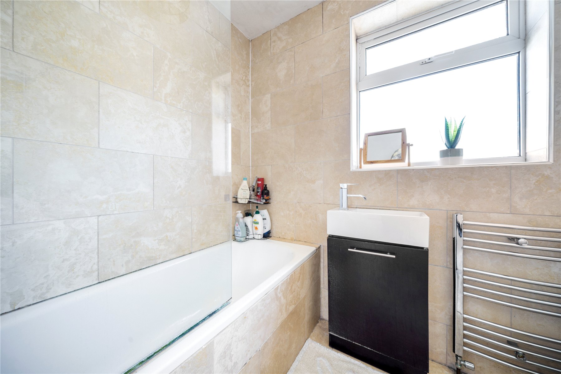 Upstairs, the home offers three bedrooms, two of which are generous doubles. These share a modern family bathroom, fitted with a three-piece suite comprising a WC, wash hand basin with vanity unit, and a bath with wall-mounted shower. The room is finished with attractive floor-to-ceiling tiling.