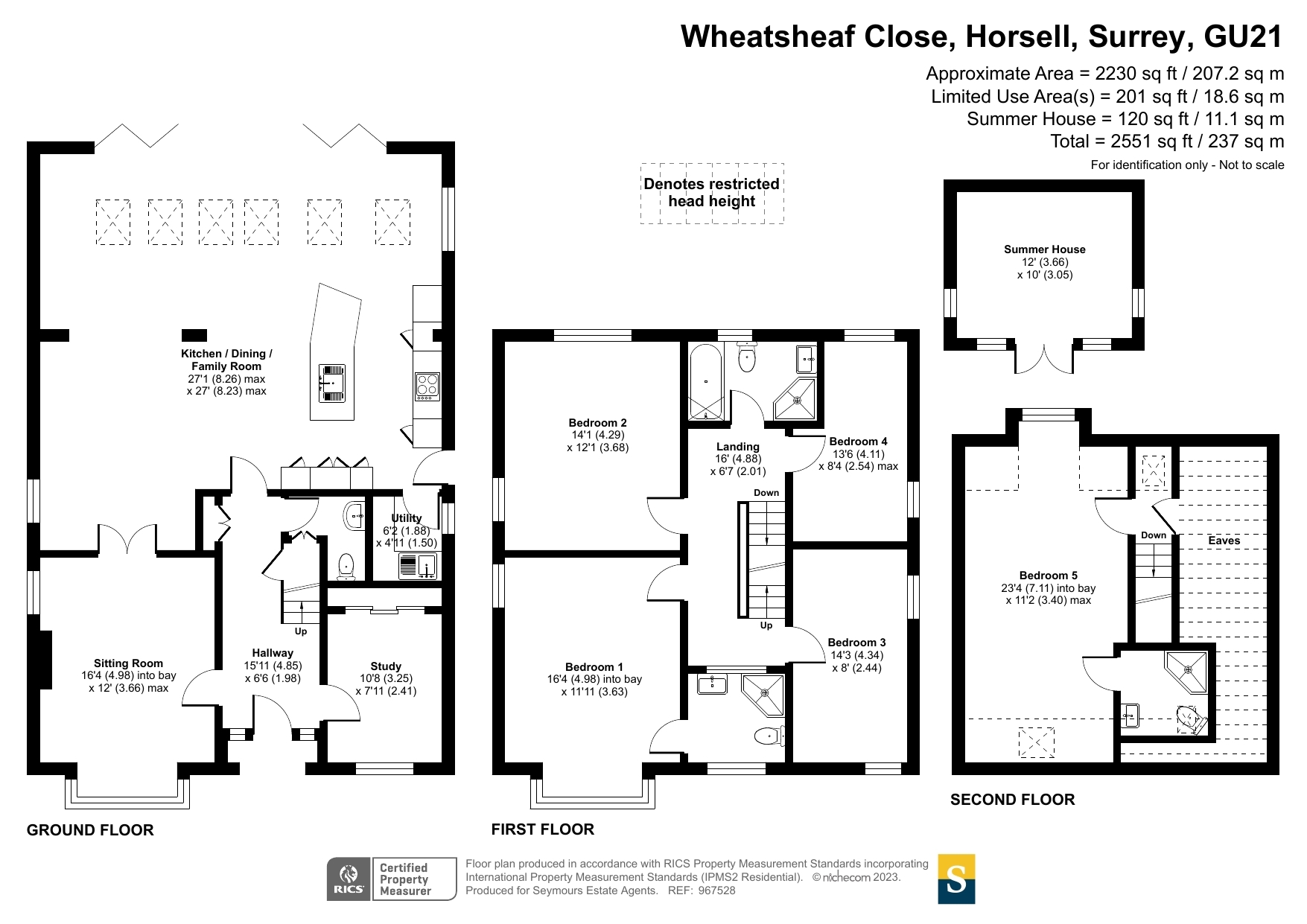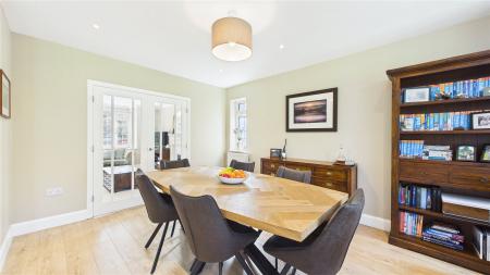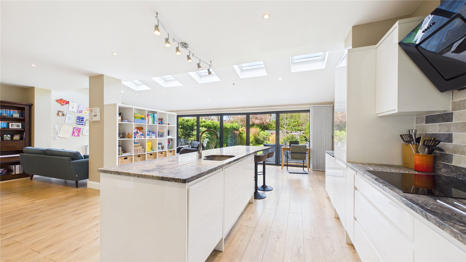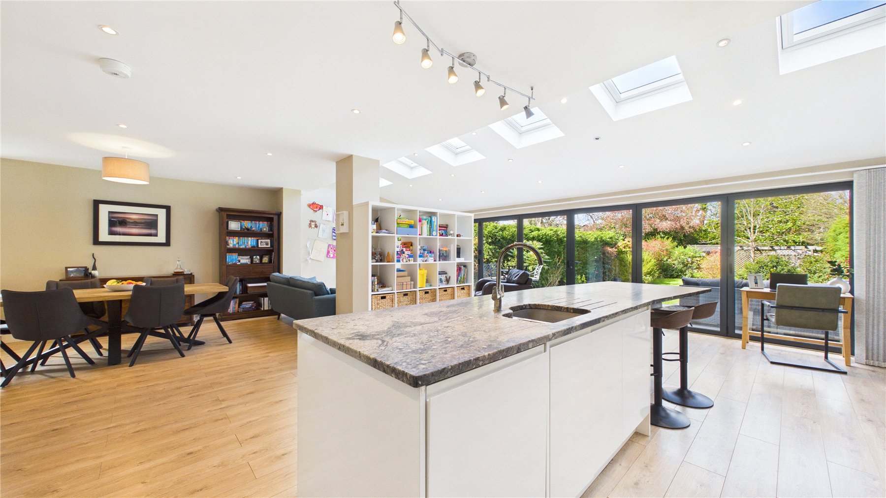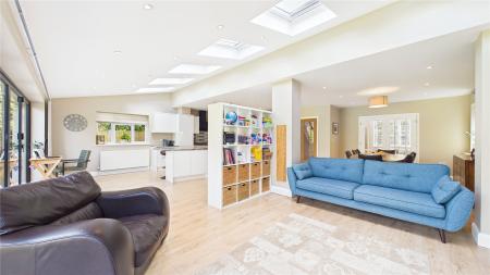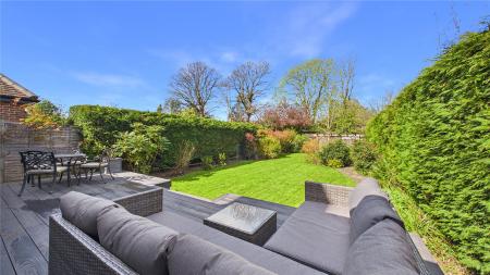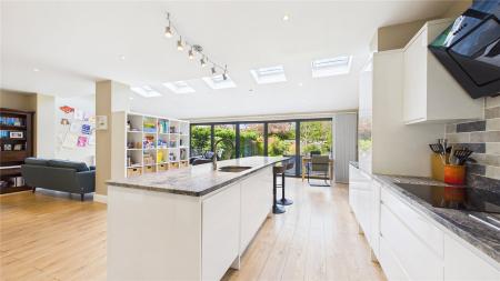 An impressive five-bedroom detached family home, ideally positioned on a popular tree-lined no-through road just moments from Woking town centre. Set on a generous plot, the property offers spacious and well-balanced accommodation, perfectly suited to modern family living.The standout feature is the expansive open-plan kitchen, dining and family space to the rear. Flooded with natural light from multiple skylights and full-width bi-fold doors, this area provides an ideal setting for both everyday living and entertaining. The contemporary kitchen is fitted with sleek units, granite worktops, integrated appliances and a large central island, while a separate utility room adds further practicality.Double glass doors lead through to a welcoming sitting room, complete with a bay window and an elegant central fireplace, creating a cosy yet refined space. A separate study to the front of the house offers the perfect work-from-home solution.Upstairs, the first floor comprises four generously sized double bedrooms, including a principal bedroom with en-suite shower room. A modern family bathroom with both bath and separate shower serves the remaining bedrooms. The second floor provides an additional spacious bedroom with en-suite, along with useful eaves storage.Externally, the property continues to impress. A raised decked terrace spans the rear of the house, ideal for outdoor dining and relaxation, leading down to a well-maintained lawn bordered by mature planting for privacy. A further seating area and pergola-covered terrace offer additional spaces to enjoy the garden. To the front, there is ample off-street parking.Wheatsheaf Close is a highly regarded residential location within easy reach of Woking town centre, which offers a wide range of shopping, dining and leisure facilities. The mainline station provides a fast and frequent service to London Waterloo (approximately 26 minutes), while the M25 and M3 are also easily accessible.