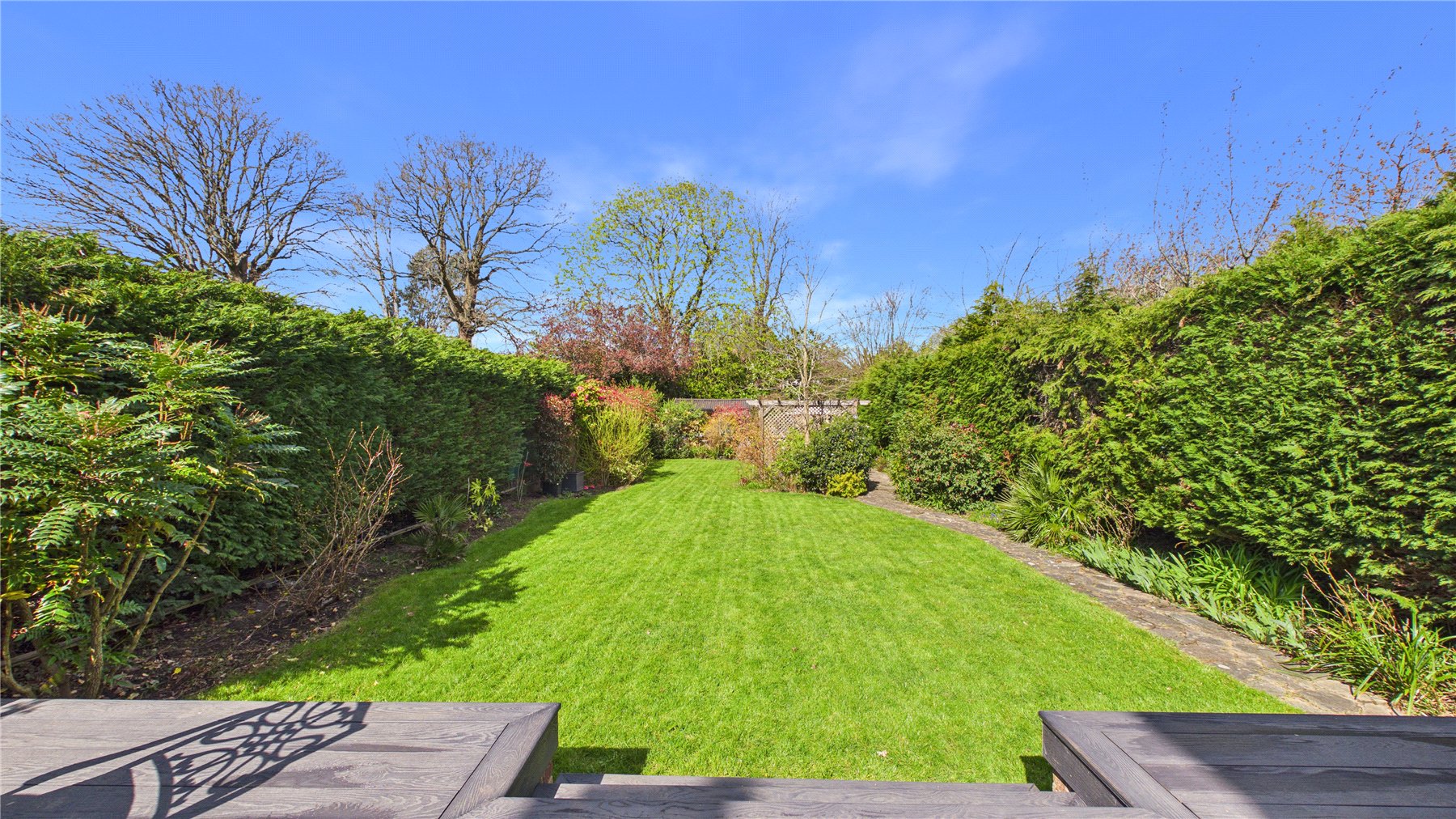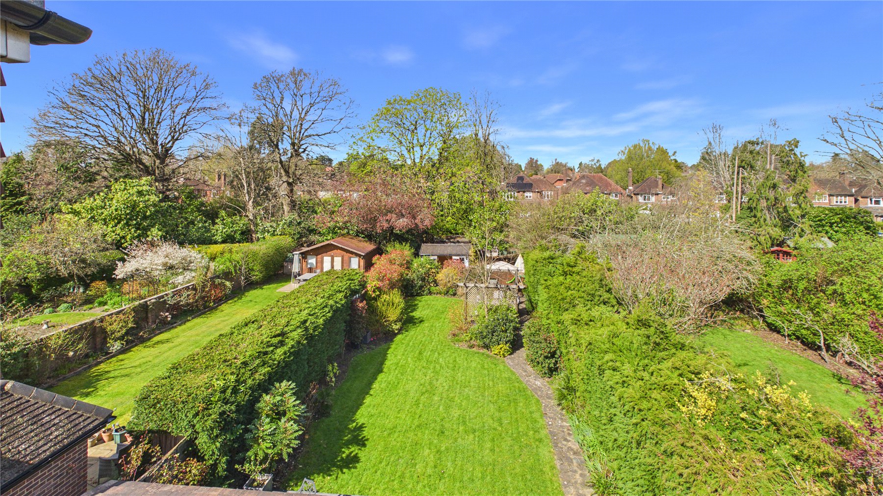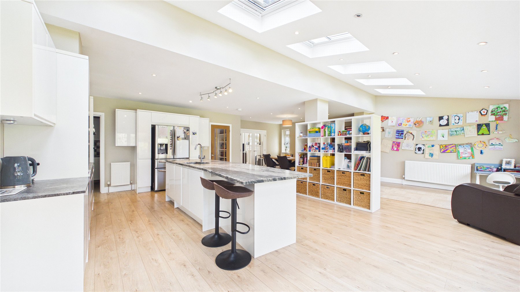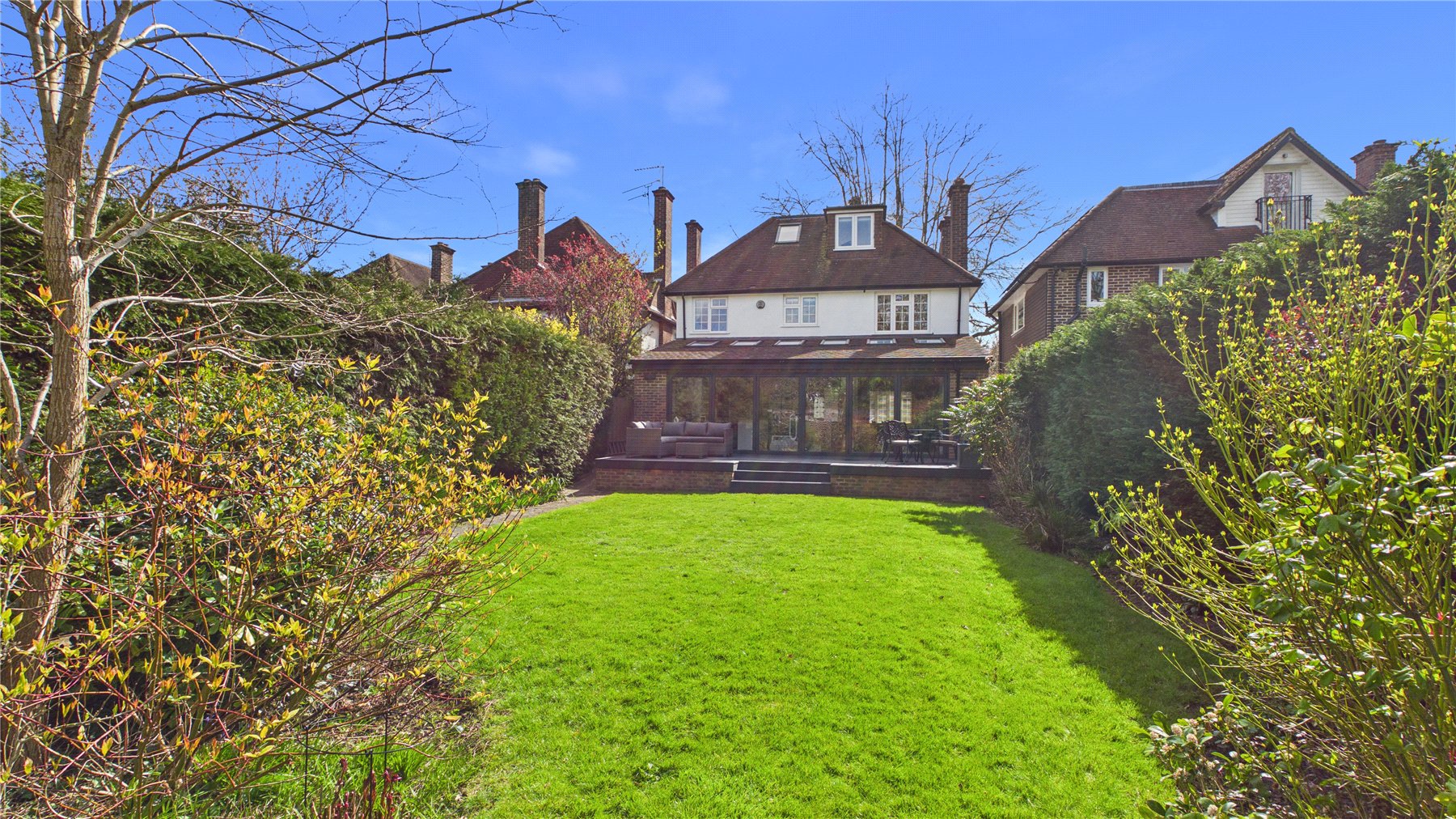 An impressive five-bedroom detached family home, ideally positioned on a popular tree-lined no-through road just moments from Woking town centre. Set on a generous plot, the property offers spacious and well-balanced accommodation, perfectly suited to modern family living.The standout feature is the expansive open-plan kitchen, dining and family space to the rear. Flooded with natural light from multiple skylights and full-width bi-fold doors, this area provides an ideal setting for both everyday living and entertaining. The contemporary kitchen is fitted with sleek units, granite worktops, integrated appliances and a large central island, while a separate utility room adds further practicality.Double glass doors lead through to a welcoming sitting room, complete with a bay window and an elegant central fireplace, creating a cosy yet refined space. A separate study to the front of the house offers the perfect work-from-home solution.Upstairs, the first floor comprises four generously sized double bedrooms, including a principal bedroom with en-suite shower room. A modern family bathroom with both bath and separate shower serves the remaining bedrooms. The second floor provides an additional spacious bedroom with en-suite, along with useful eaves storage.Externally, the property continues to impress. A raised decked terrace spans the rear of the house, ideal for outdoor dining and relaxation, leading down to a well-maintained lawn bordered by mature planting for privacy. A further seating area and pergola-covered terrace offer additional spaces to enjoy the garden. To the front, there is ample off-street parking.Wheatsheaf Close is a highly regarded residential location within easy reach of Woking town centre, which offers a wide range of shopping, dining and leisure facilities. The mainline station provides a fast and frequent service to London Waterloo (approximately 26 minutes), while the M25 and M3 are also easily accessible.