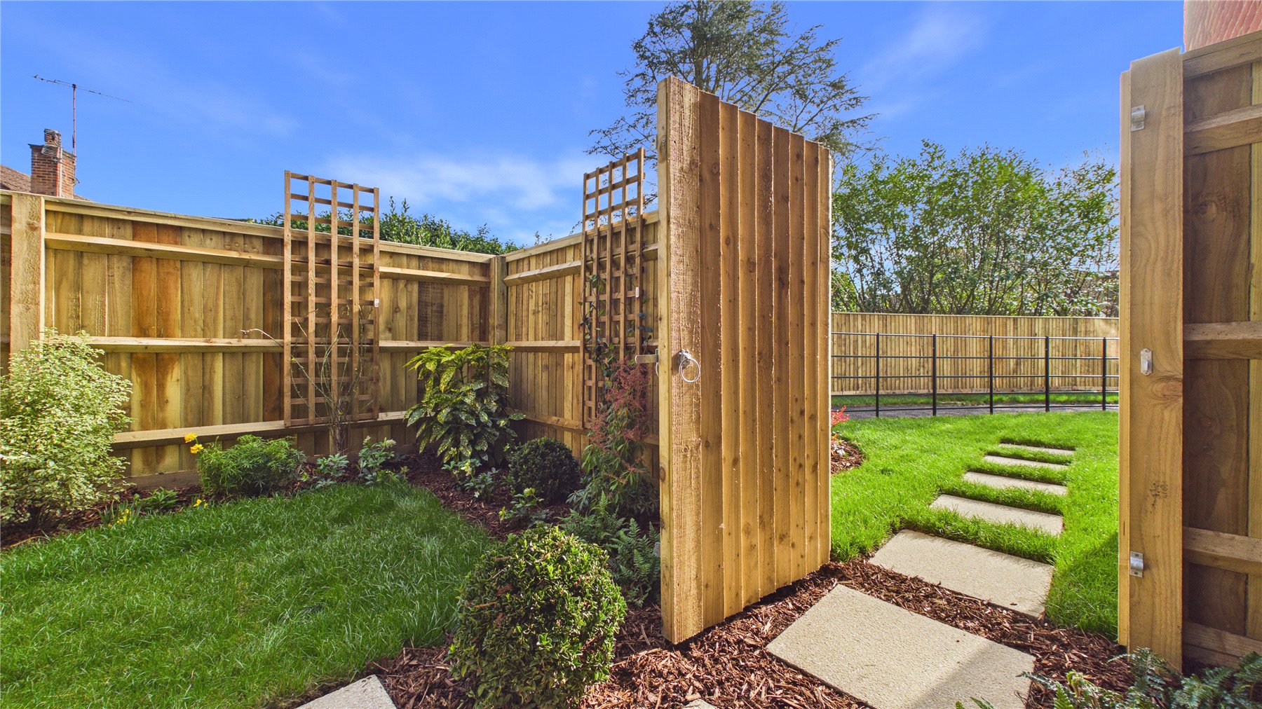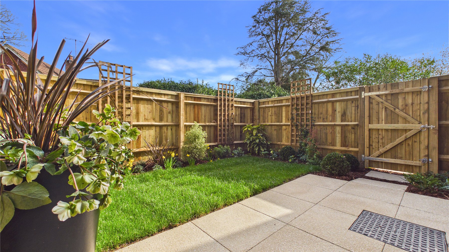 14 Heatherdown Gardens: a contemporary 2-bed, 2-bath ground floor apartment in Horsell, with a private rear garden and terrace overlooking communal gardens. Perfect for those seeking sleek interiors, commuter convenience, and low upkeep near London.