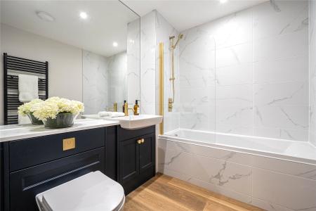 Inside, enjoy a bright, open-plan layout (approx. 911 sq ft) with floor-to-ceiling windows, a stylish Shaker-style kitchen with integrated appliances, and two spacious double bedrooms. The principal suite features a built-in wardrobe and modern en-suite; the main bathroom adds a deep soaking tub and gold-accent details for a spa-like feel. Choose gas or induction cooking (if reserved early), and enjoy the natural flow between indoors and your private balcony.