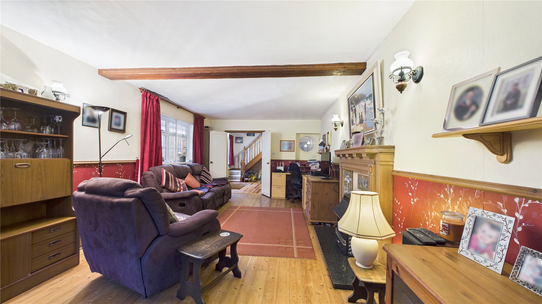The ground floor is arranged to create a sociable, family-friendly layout. A superb through living/dining room spans the depth of the house, featuring a central fireplace, attractive wood flooring and large windows to both front and rear that ensure the space is light and welcoming. There is ample room for both relaxed seating and a formal dining area, making it ideal for everyday living and entertaining alike.
