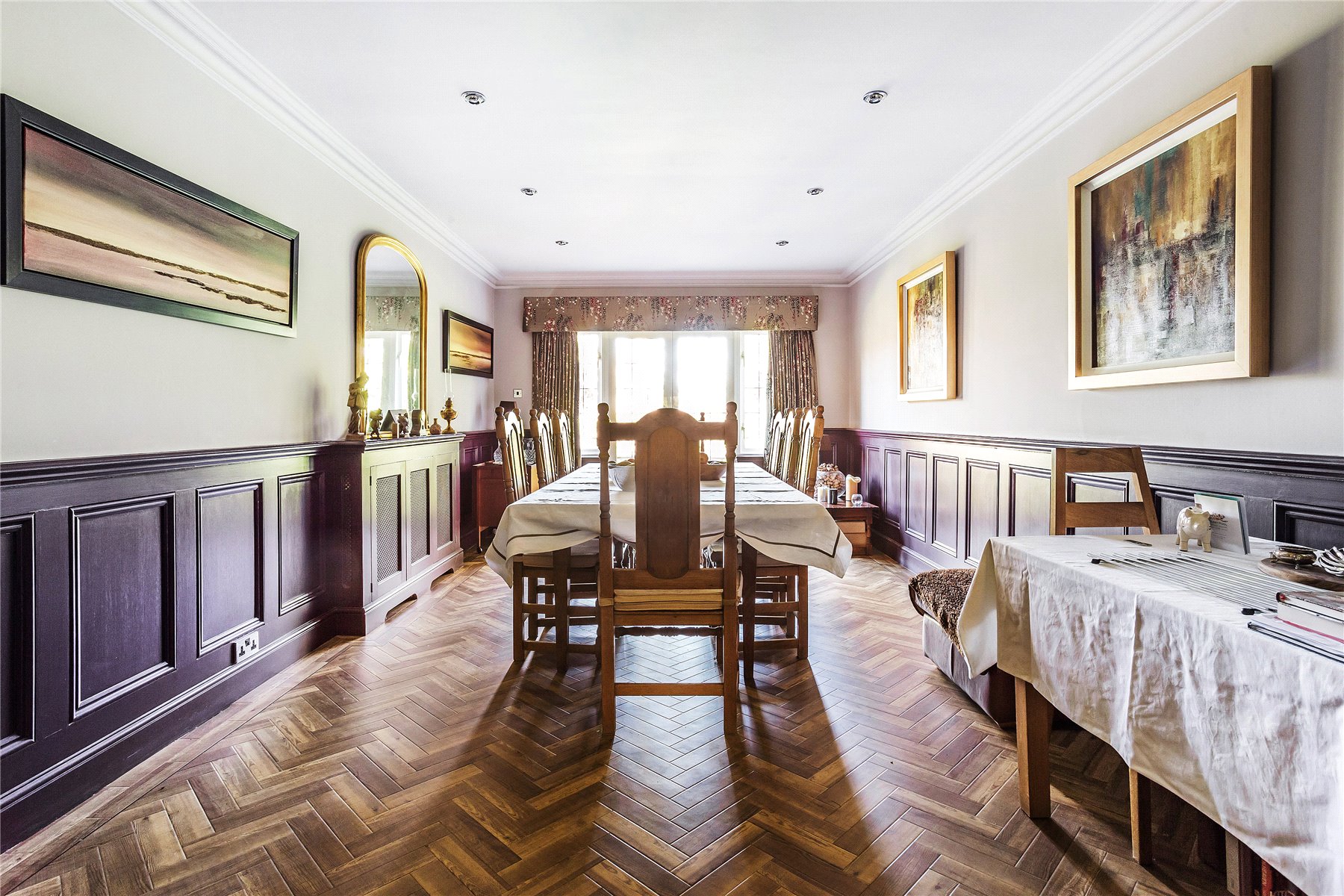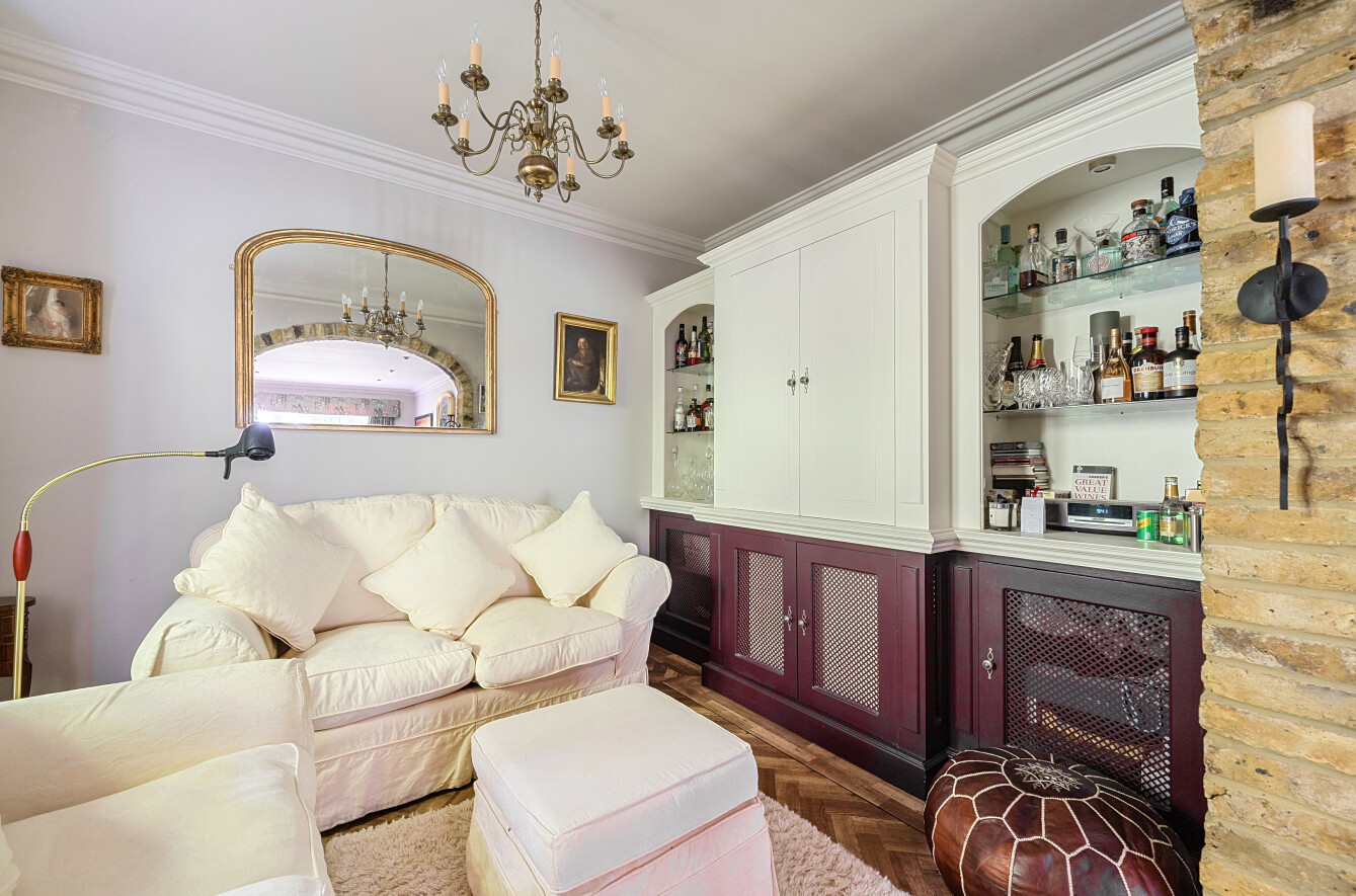Across the hallway a tremendous formal dining room has all the grace and elegance youd expect from such a prestigious abode. Impeccably framed by the sultry heritage colour of demi wood panelled walls, the herringbone patterns of its wood floor draw your eye to French doors opening onto the terrace. An exposed brick archway allows the impressive dimensions to flow into a charming snug thats perfectly placed for after dinner drinks.