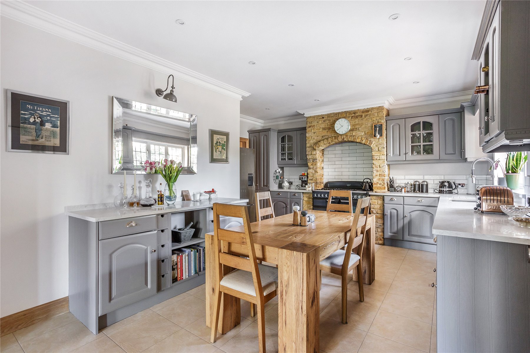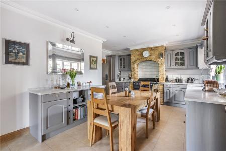 Linking the TV Room and dining room, an exemplary kitchen/breakfast room is undoubtedly the central hub of this extensive period cottage. Superbly appointed and positioned, this a prized place to spend time together and catch up on the days events while you cook. Sympathetically chosen cabinets with their traditional cup handles provide plentiful storage, while a range cooker nestles with the exposed brickwork of the chimney breast for a fantastic focal point. Sleek granite countertops wrap-around beneath metro tiles, their etched grooves flowing into under-mounted stainless steel sinks with a first class spray tap, and an integrated dishwasher and column radiator add contemporary finishing touches. A separate utility room keeps laundry appliances hidden from view and access to the integral garaging, and a cloakroom completes the ground floor.